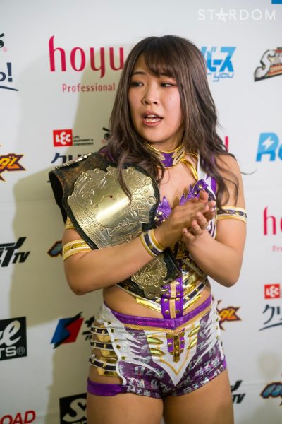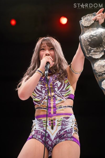 AZM: "Afinal, AZM-senpai é realmente popular! Apesar da minha aparência, ou melhor, apesar da minha aparência, esta é a minha primeira vez no evento principal de uma luta pelo título. A próxima é contra a Tekla, no Distrito de Ota. Bem, vou continuar arrasando nesse ritmo, então espero que todos consigam acompanhar. Obrigada!"
