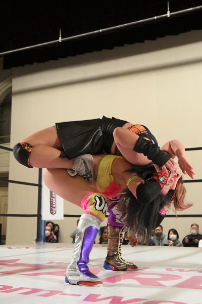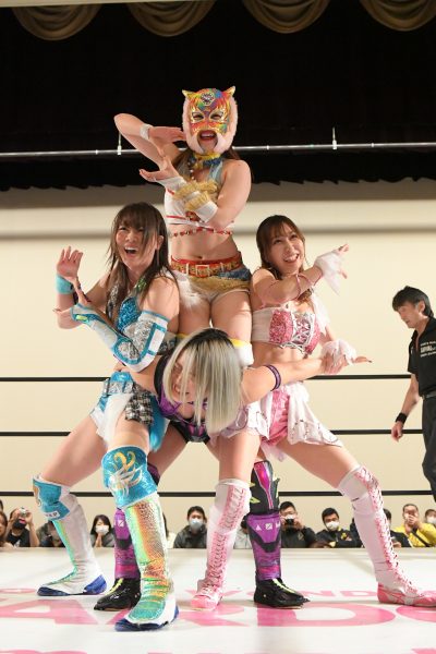 詩美がフォールに入ると里歩がカットすると、桃が里歩にドロップキック、岩谷が桃にトラースキック。AZMが岩谷にハイキックと全員入り乱れ、詩美はうつ伏せのキッドをぶっこ抜いてジャーマン狙う。これをキッドが腰投げ切り返してウラカン・ラナ。これをAZMにカットされるとキッドはロープに飛ぶが、桃&AZMが飛び込んできて3D。詩美がエアレイドクラッシュで叩きつけ、うつ伏せのキッドをぶっこ抜いて振り回しながらのジャーマン・スープレックス・ホールドで3カウント。