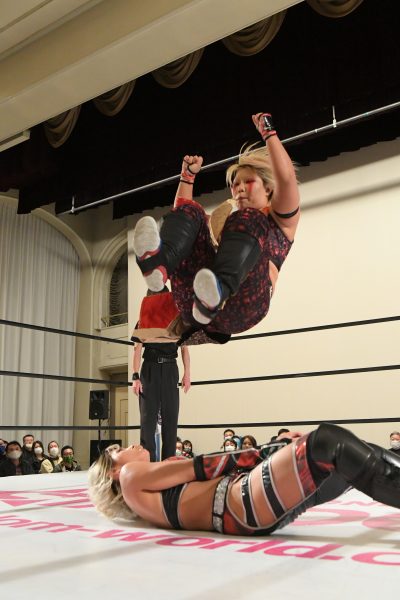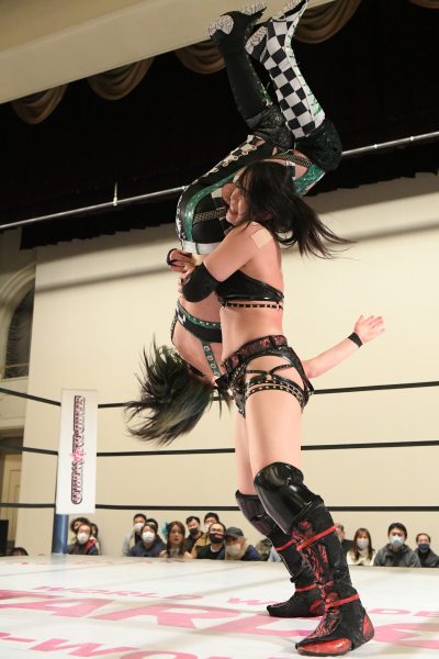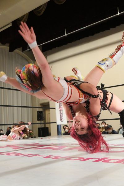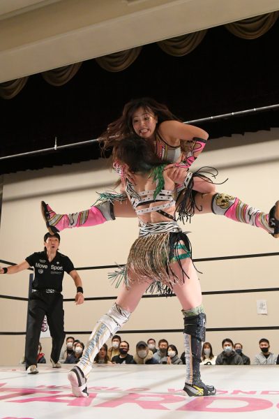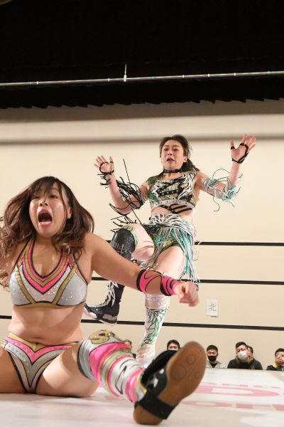 ひめかが鹿島にアルゼンチン・バックブリーカーを狙うが、鹿島が起死回生。ひめかがギリギリでキックアウトすると、再びジュリアが飛び込んできて鹿島にバックドロップを見舞うアシスト。その間にロープに飛んで力を溜めたひめかがラリアットで叩き伏せてからアルゼンチン・バックブリーカーで絞り上げると、鹿島は無念のギブアップ。