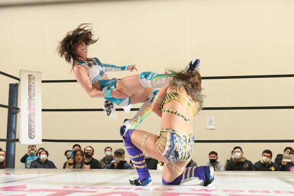 先に起き上がった舞華はビーを山茶花で叩きつけて腕十字を狙うが、ビーがクラッチして耐えながらロープブレイク。舞華は再びラリアットを狙うが、ビーはカウンターのランニング・ニー・ハイキック。ビーはカミゴェを発射も、舞華がキャッチしてスクールボーイ。ビーのキックアウトに合わせて腕を取り、再び腕十字もビーはクラッチしながら上から潰していく。舞華がキックアウトするとビーはジャーマン・スープレックスからレッグロック・スープレックス・ホールド。さらにビーはニーパッドを下ろして串刺しVトリガーから舞華をコーナーに上げてクイーンズ・ランディングを狙うが、舞華がコーナーに捕まって耐えると宙吊りにしてチーキー・ナンドス・キック。ビーが改めて肩車で担ぎ上げ、いざクイーンズ・ランディングに入ろうとしたところでフルタイムドローのゴングが打ち鳴らされた。