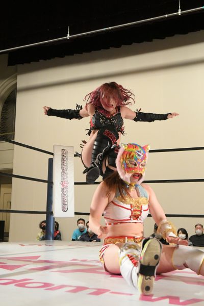 前SWA王者および元・赤の王者であるビーとフューチャー王者の舞華のシングルマッチ。入場後に互いにコーナーに上って観衆にアピールし、そのままコーナー上でにらみ合う。