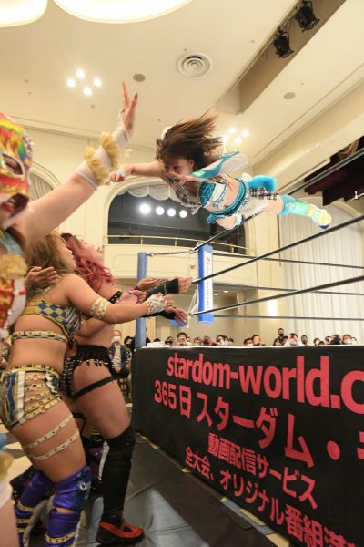 里歩はAZMにジャンピングニーを叩き込み、突っ込んできた詩美にはAZMを踏み台にスイングDDT。さらに突っ込んできた桃には岩谷とのダブルドロップキックを叩き込んで撃退。そしてAZMの両腕をそれぞれ岩谷と里歩が固め、その上にキッドが乗って「We are STARS!」とポーズを決める。AZMはトラースキックで攻め込んでいき、里歩にキャッチされると低空ドロップキックで反撃して桃にタッチ。