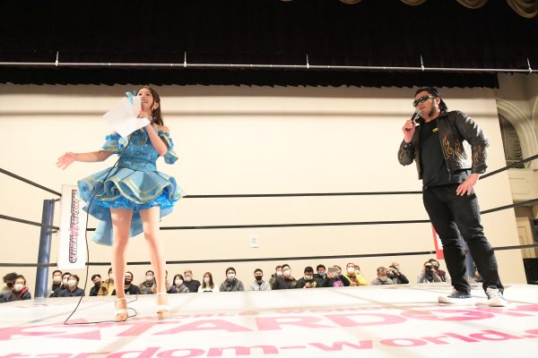 続いて小坂井ゆりえリングアナもリングに上がり、2人で本日から発売されたSTARDOM公式マスクのPRと対戦カード発表から大会のオープニングを叫んだ。