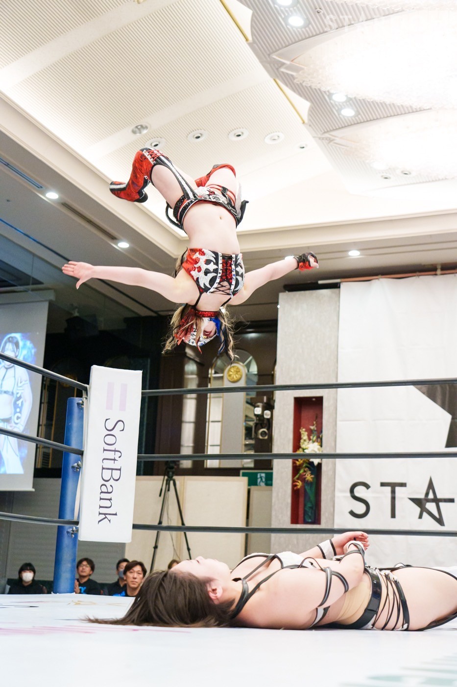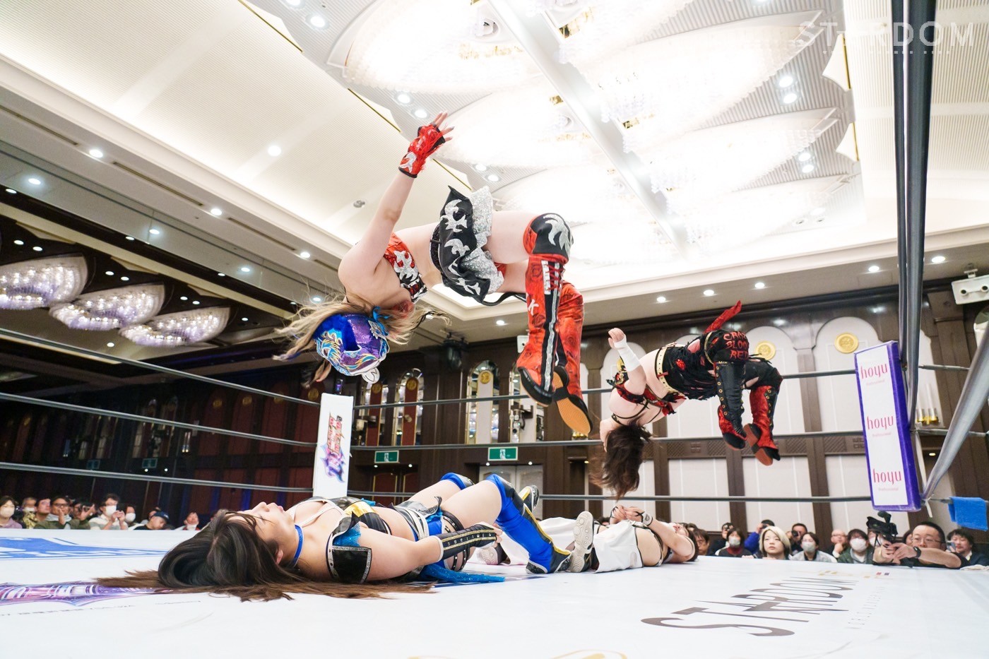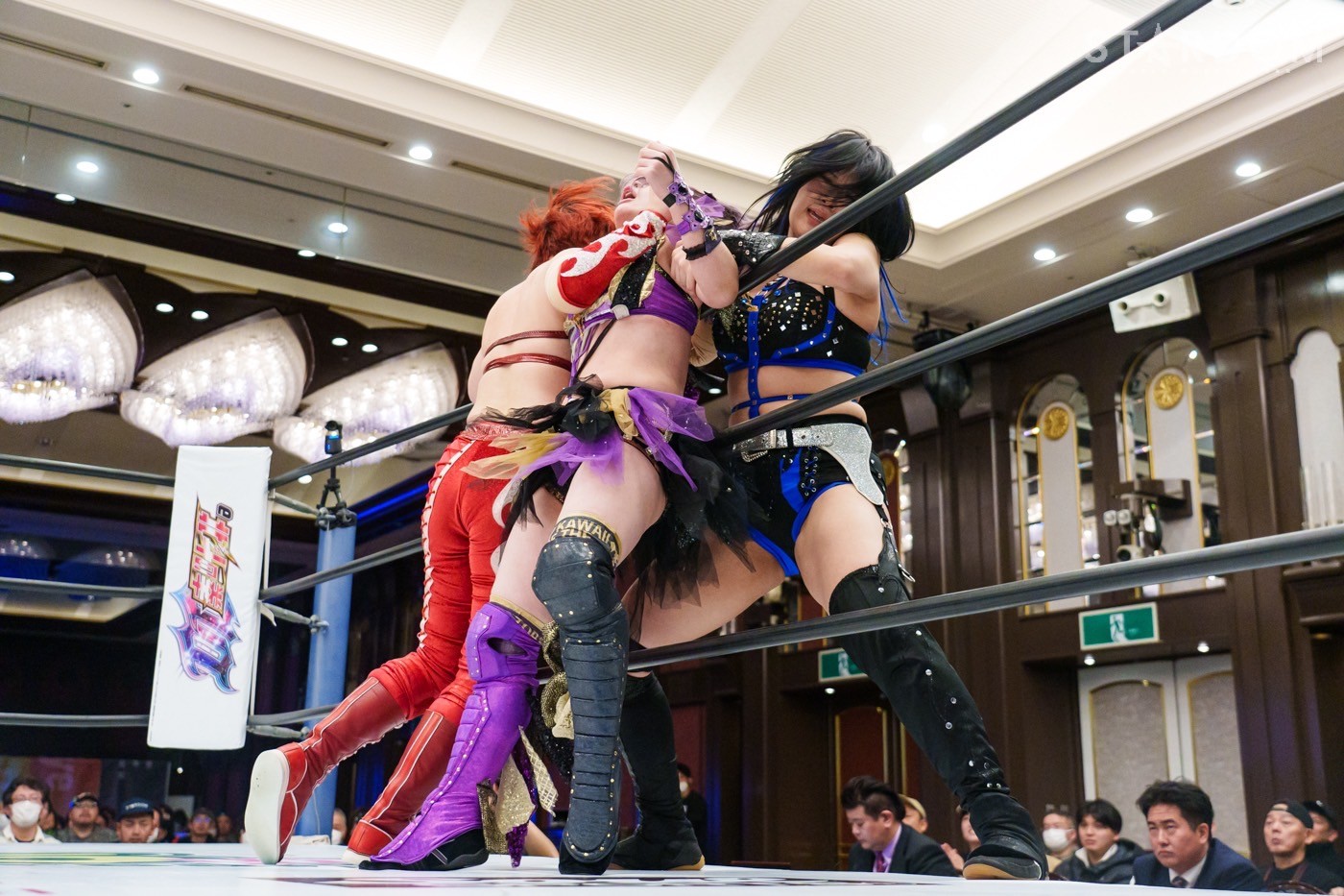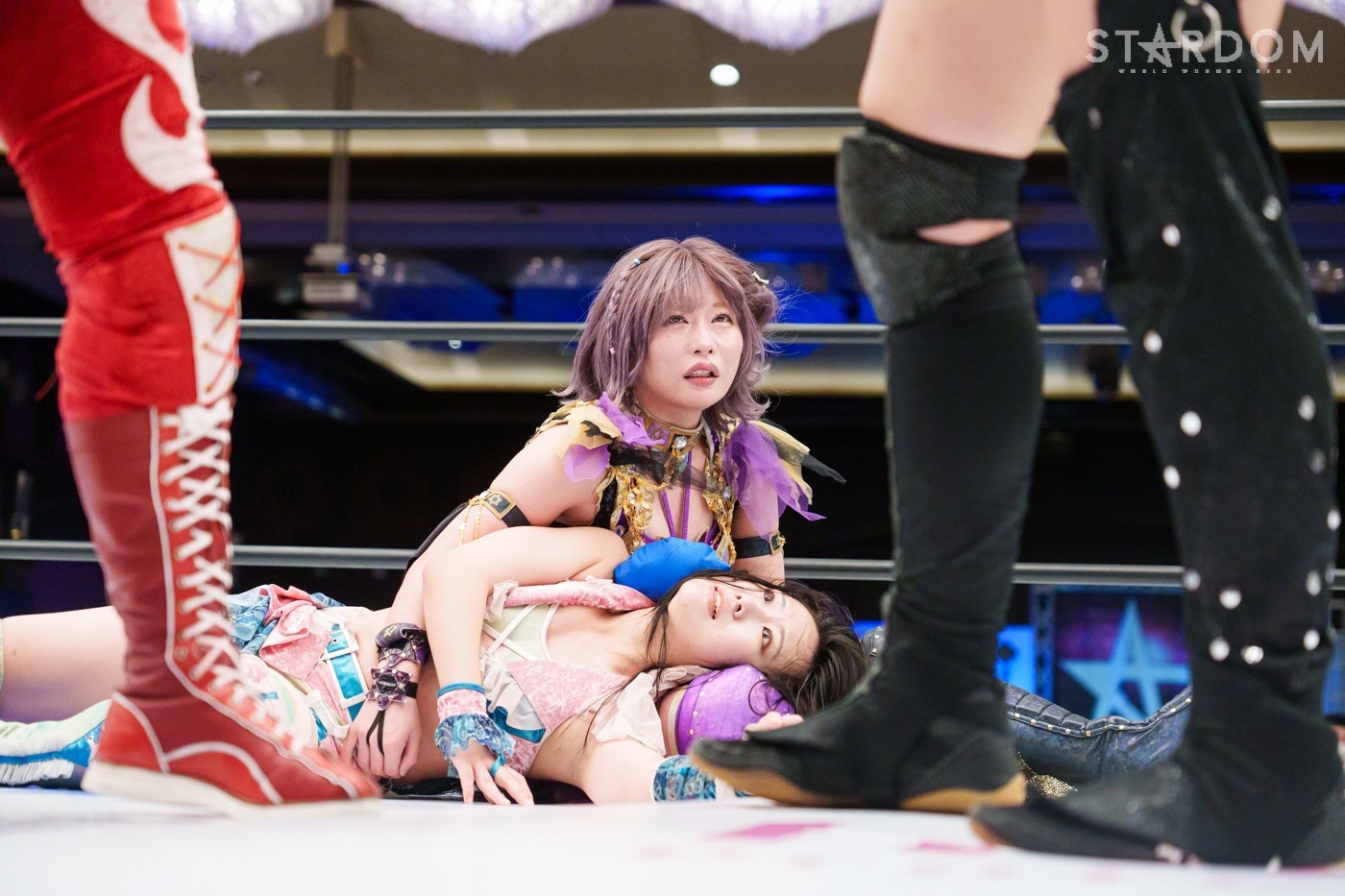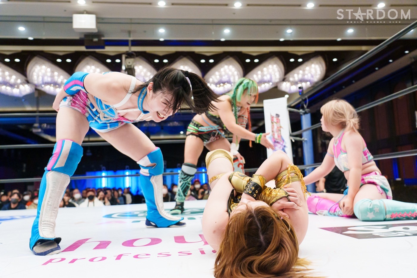 水森と梨杏が先発。梨杏がロックアップをかいくぐり、ドロップキックをかわしフットスタンプ。丸め込みの応酬から梨杏がドロップキック連打、水森がショルダータックルで吹っ飛ばす。月山が乱入しダブルのヒップアタック。梨杏がボディースラムを狙うが水森が反対に叩きつける。水森が梨杏を持ち上げてさくらがミドルキックの連打。梨杏が返すが水森が連続の押さえ込み。梨杏がエルボー連打、水森が一発で梨杏を倒す。水森はボディースラムを狙うが梨杏がこらえる。しかし水森がバックブリーカー、ギロチンドロップ。水森が串刺しで突進すると、梨杏がかわしてネックブリーカー、ドロップキック。月山が水森へドロップキック、ヒップアタック。さくらが乱入するが、月山が分断。水森、さくらに次々とヒップアタックを連打する。水森が返して月山とエルボーを打ち合う。月山が連打しコンプリートショット。月山は極楽ドン狙いも、水森が至近距離からラリアット。さくらが「いける!いける!」とタッチを申し出てリングイン、月山に串刺しで回し蹴りを放ち、ドロップキック、ボディースラム、三角絞め。しかし、梨杏が解いてエルボー連打。月山と梨杏が同時に串刺しエルボー。月山の地獄突きからヒップドロップ。月山は極楽ドンを狙うが、さくらがこらえる。水森が入ってラリアット、さくらと合体も打撃が同士討ち。月山がさくらに極楽ドンを決めるが、2カウント。月山が「決めるぞ!」と叫んでスープレックスを狙う。さくらが切り返し三角絞め。月山がエスケープすると、さくらがダイビングニー。月山がかわしてオースイスープレックス。しかし水森がカットしてラリアットも決める。さくらが飛びついて三角絞めへ。月山がギブアップし、さくらが勝利した。