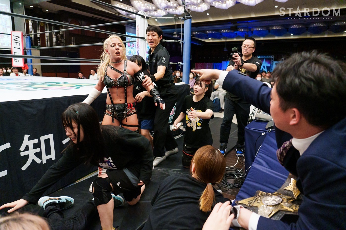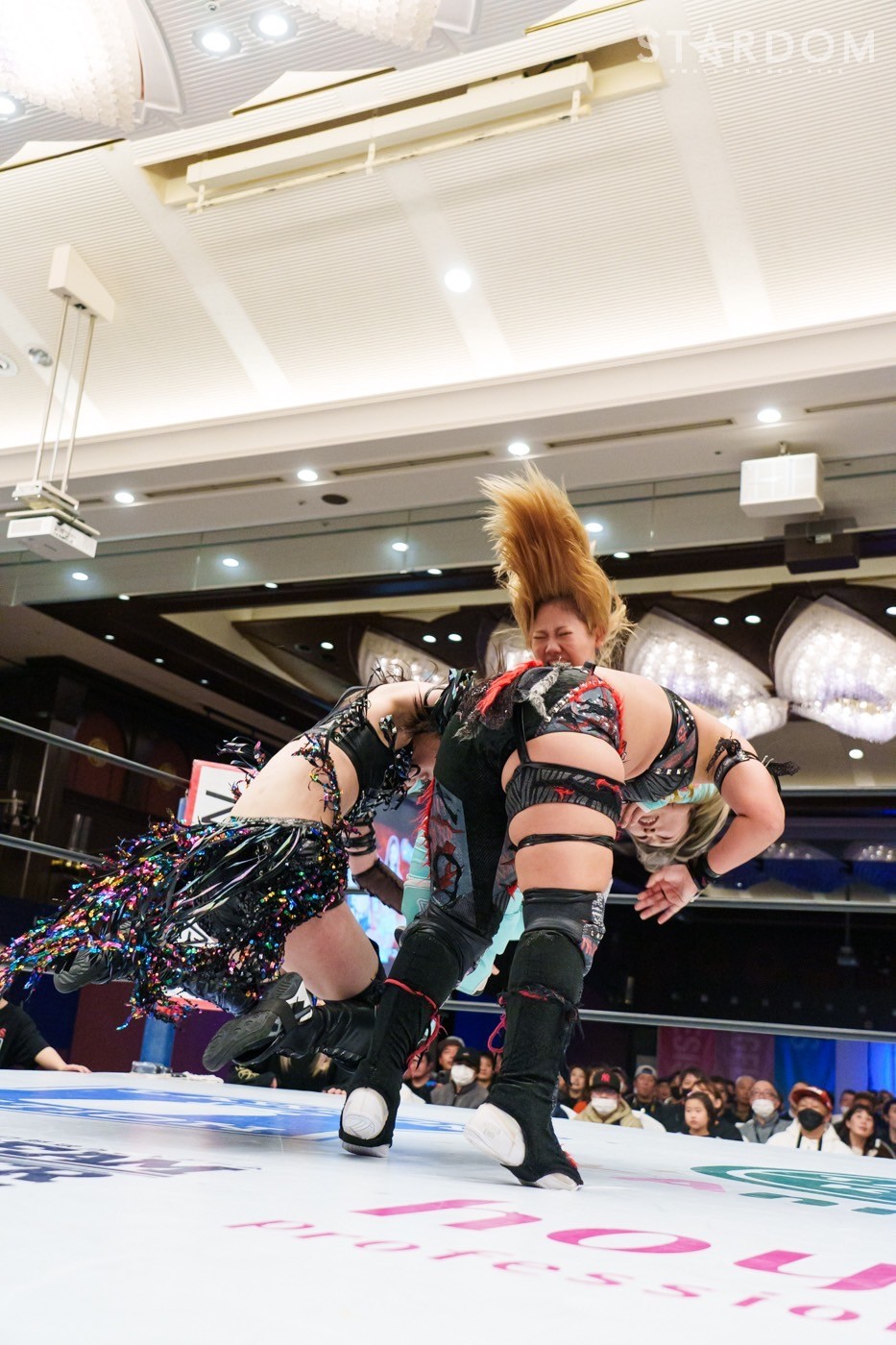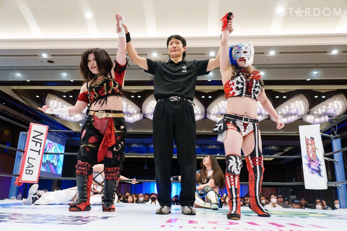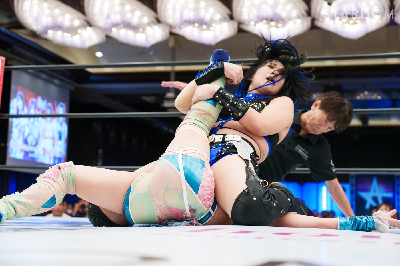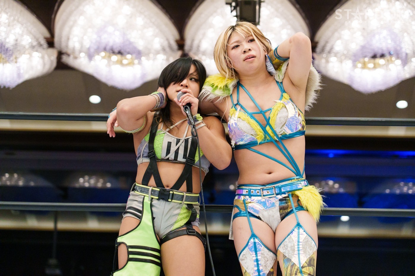 水森と梨杏が先発。梨杏がロックアップをかいくぐり、ドロップキックをかわしフットスタンプ。丸め込みの応酬から梨杏がドロップキック連打、水森がショルダータックルで吹っ飛ばす。月山が乱入しダブルのヒップアタック。梨杏がボディースラムを狙うが水森が反対に叩きつける。水森が梨杏を持ち上げてさくらがミドルキックの連打。梨杏が返すが水森が連続の押さえ込み。梨杏がエルボー連打、水森が一発で梨杏を倒す。水森はボディースラムを狙うが梨杏がこらえる。しかし水森がバックブリーカー、ギロチンドロップ。水森が串刺しで突進すると、梨杏がかわしてネックブリーカー、ドロップキック。月山が水森へドロップキック、ヒップアタック。さくらが乱入するが、月山が分断。水森、さくらに次々とヒップアタックを連打する。水森が返して月山とエルボーを打ち合う。月山が連打しコンプリートショット。月山は極楽ドン狙いも、水森が至近距離からラリアット。さくらが「いける!いける!」とタッチを申し出てリングイン、月山に串刺しで回し蹴りを放ち、ドロップキック、ボディースラム、三角絞め。しかし、梨杏が解いてエルボー連打。月山と梨杏が同時に串刺しエルボー。月山の地獄突きからヒップドロップ。月山は極楽ドンを狙うが、さくらがこらえる。水森が入ってラリアット、さくらと合体も打撃が同士討ち。月山がさくらに極楽ドンを決めるが、2カウント。月山が「決めるぞ!」と叫んでスープレックスを狙う。さくらが切り返し三角絞め。月山がエスケープすると、さくらがダイビングニー。月山がかわしてオースイスープレックス。しかし水森がカットしてラリアットも決める。さくらが飛びついて三角絞めへ。月山がギブアップし、さくらが勝利した。