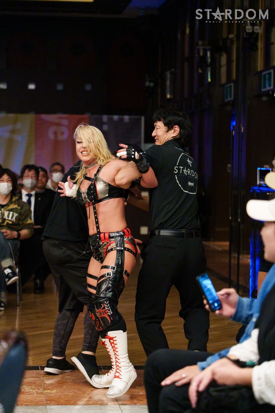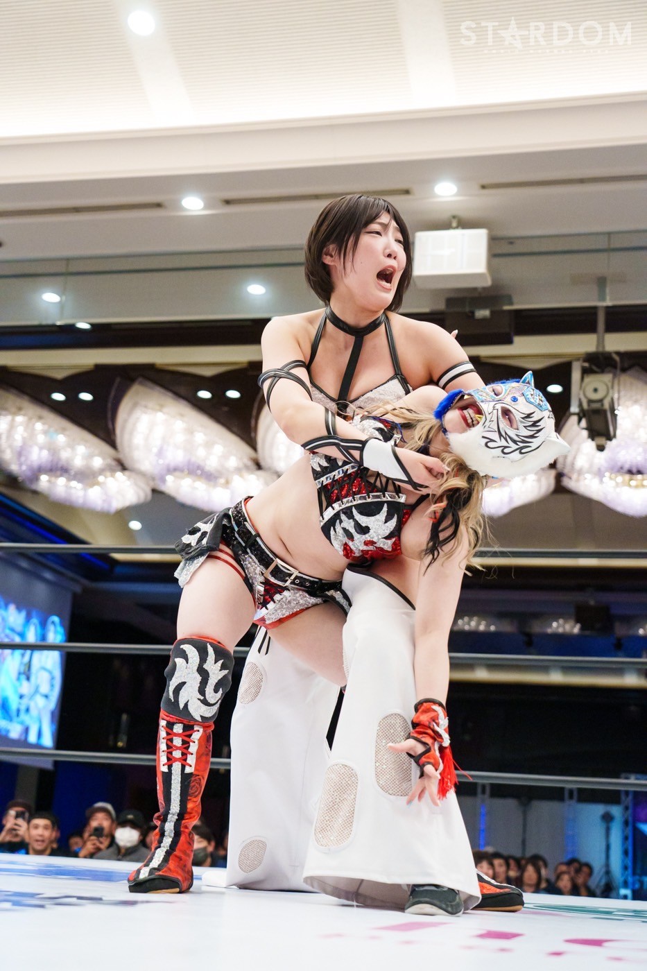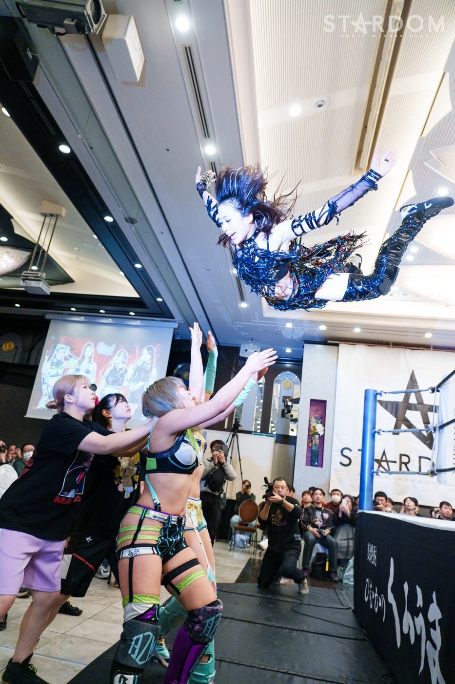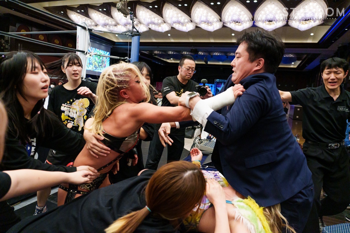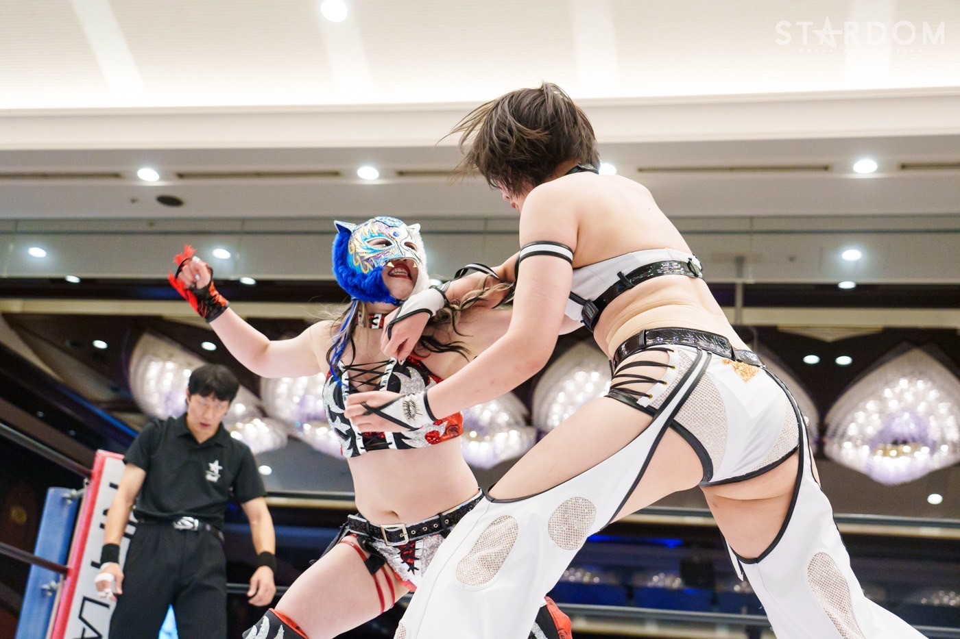 水森と梨杏が先発。梨杏がロックアップをかいくぐり、ドロップキックをかわしフットスタンプ。丸め込みの応酬から梨杏がドロップキック連打、水森がショルダータックルで吹っ飛ばす。月山が乱入しダブルのヒップアタック。梨杏がボディースラムを狙うが水森が反対に叩きつける。水森が梨杏を持ち上げてさくらがミドルキックの連打。梨杏が返すが水森が連続の押さえ込み。梨杏がエルボー連打、水森が一発で梨杏を倒す。水森はボディースラムを狙うが梨杏がこらえる。しかし水森がバックブリーカー、ギロチンドロップ。水森が串刺しで突進すると、梨杏がかわしてネックブリーカー、ドロップキック。月山が水森へドロップキック、ヒップアタック。さくらが乱入するが、月山が分断。水森、さくらに次々とヒップアタックを連打する。水森が返して月山とエルボーを打ち合う。月山が連打しコンプリートショット。月山は極楽ドン狙いも、水森が至近距離からラリアット。さくらが「いける!いける!」とタッチを申し出てリングイン、月山に串刺しで回し蹴りを放ち、ドロップキック、ボディースラム、三角絞め。しかし、梨杏が解いてエルボー連打。月山と梨杏が同時に串刺しエルボー。月山の地獄突きからヒップドロップ。月山は極楽ドンを狙うが、さくらがこらえる。水森が入ってラリアット、さくらと合体も打撃が同士討ち。月山がさくらに極楽ドンを決めるが、2カウント。月山が「決めるぞ!」と叫んでスープレックスを狙う。さくらが切り返し三角絞め。月山がエスケープすると、さくらがダイビングニー。月山がかわしてオースイスープレックス。しかし水森がカットしてラリアットも決める。さくらが飛びついて三角絞めへ。月山がギブアップし、さくらが勝利した。
