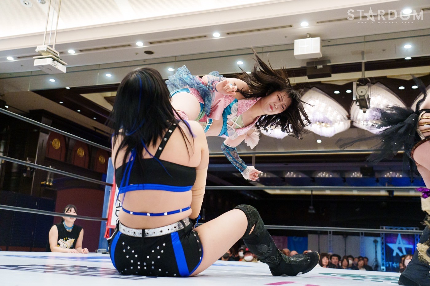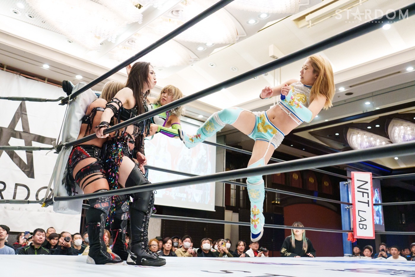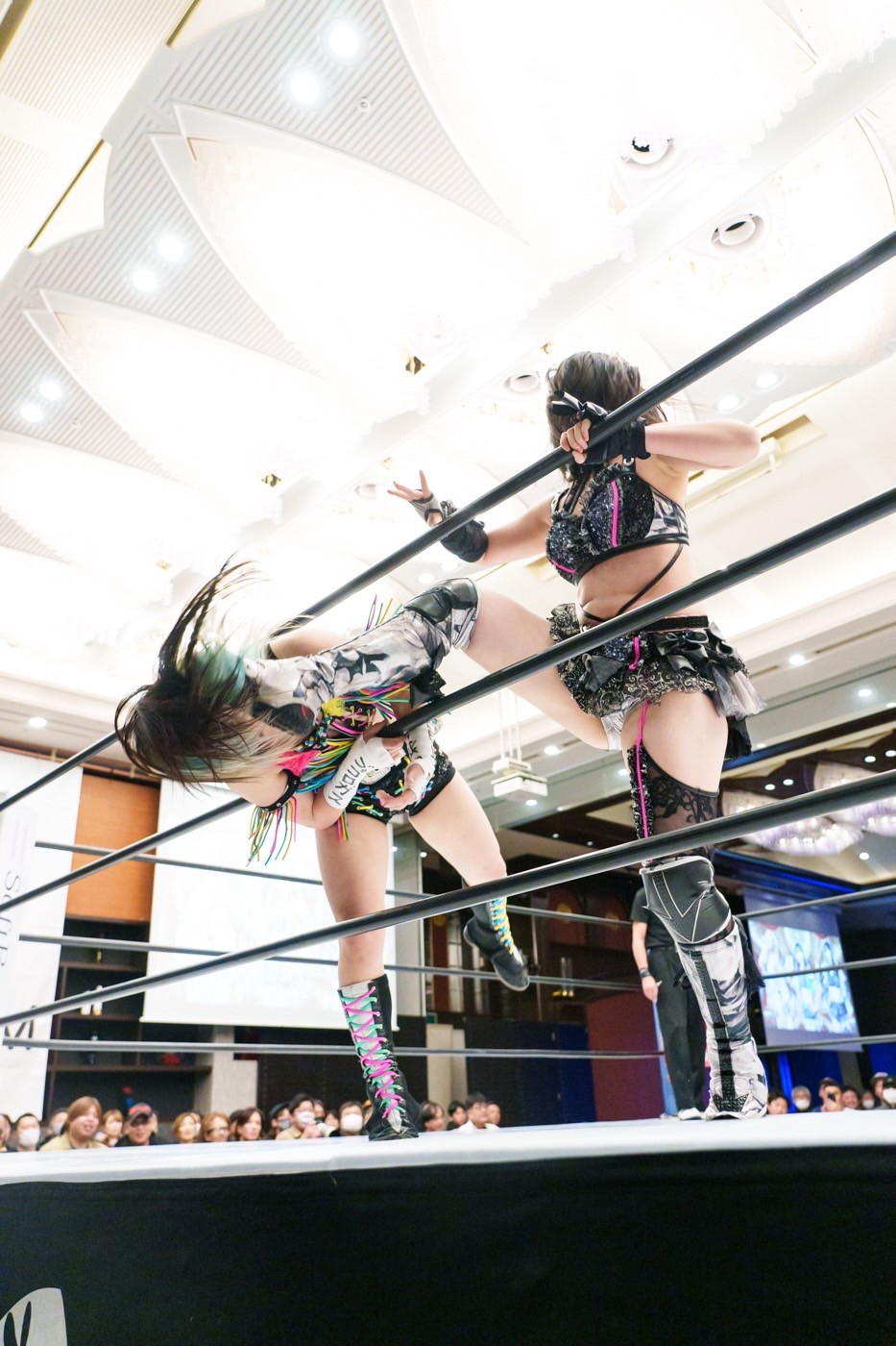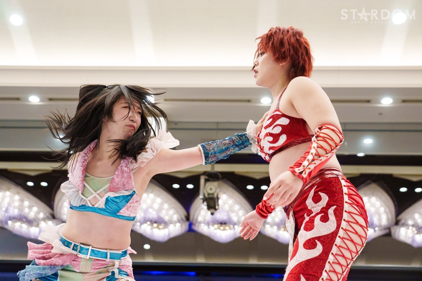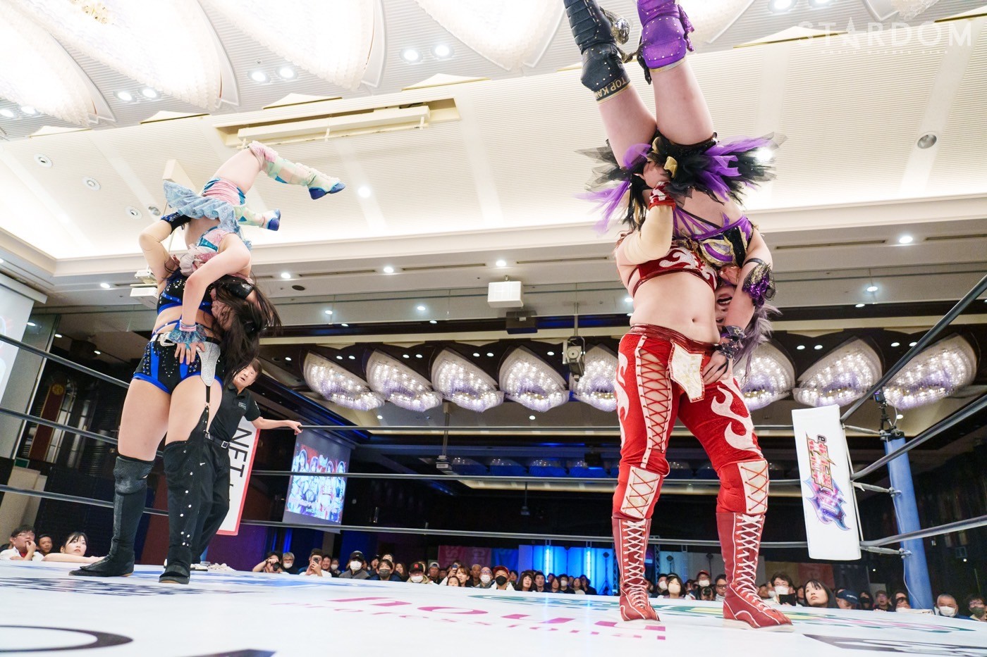 玖麗とHANAKOが視殺戦。2人の先発でスタートし、ロックアップでHANAKOが追い込む。すぐに玖麗が反転しエルボー連打。玖麗が手を引くがHANAKOは動かず。玖麗がさらにエルボー連打。HANAKOがドロップキックをかわしてストンピング。HANAKOの突進に中野が乱入してダブルの攻撃。玖麗のフットスタンプHANAKOが返すと、突進を止めてボディースラム。HANAKOは舞華を呼び込み、連係で玖麗を攻める。HANAKOは玖麗をボディースラムを連発。舞華が玖麗のエルボー連打を仁王立ちで受けて立つ。舞華が一発で玖麗を倒し、串刺しで突進。そこに玖麗がカウンターでドロップキック。中野が舞華にダイビングボディーアタック。HANAKOが突進を止めて舞華がラリアット。舞華とHANAKOをかいくぐり、中野がドロップキック。舞華が返してラリアット、中野はエルボーアタック。エルボーの応酬で中野が打ち勝つ。しかし、舞華がパワースラムで叩きつける。HANAKOが中野にショルダータックル、アルゼンチン。コーナーに叩きつけると串刺しボディーアタック、ニードロップ。中野が返すと、ブレーンバスター狙いを切り返してバックを取る。HANAKOが切り返すが、中野がネックブリーカー、側転ダブルニードロップ。玖麗がHANAKOへ串刺しドロップキック。引き起こすと中野を呼び込む。舞華が乱入し中野と玖麗を分断、HANAKOが玖麗にバックフリップ、アルゼンチン。中野がスピンキックでカットし、玖麗が飛びついてスリーパーホールド。なんとかHANAKOがエスケープ。玖麗はコーナーに上がりミサイルキック、ときめきスピア。HANAKOが受け止めラリアット。玖麗がかわして中野の突進とスピアが合体。玖麗はHANAKOにときめきカッターを決める。しかし、舞華のカットが間に合う。中野と玖麗が合体を試みるが舞華とHANAKOがブレーンバスターの競演。舞華はエプロンからリング下の中野にラリアット。HANAKOが玖麗にバックドロップ。決まったと思われたが玖麗が返す。玖麗がジャックナイフで丸め込むが舞華がカット。舞華とHANAKOが玖麗を持ち上げマットに叩きつける。HANAKOはアルゼンチンからJPコースター。3カウントが入りHANAKOが玖麗を破った。