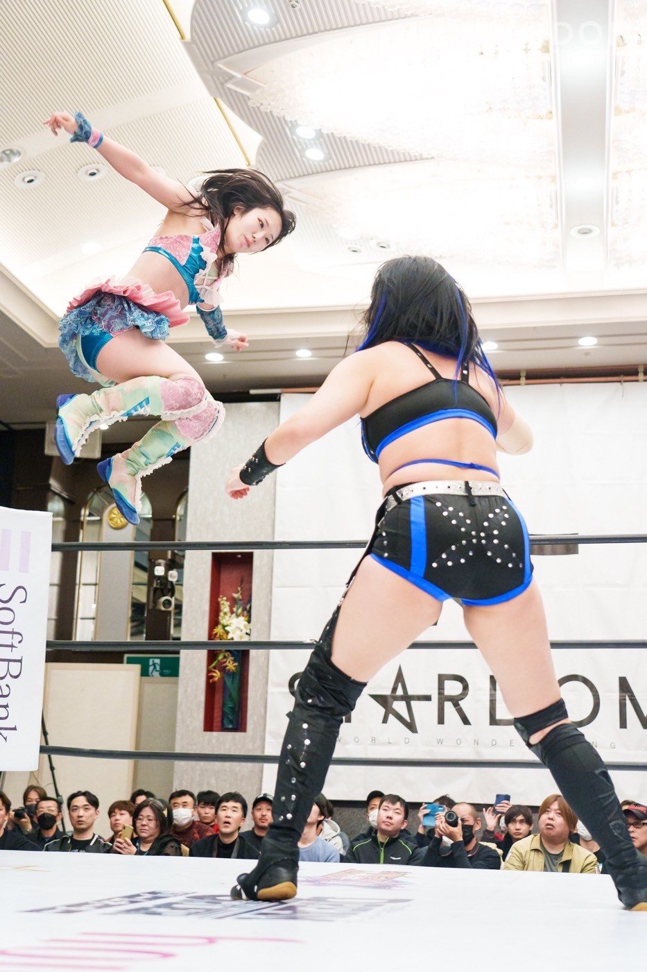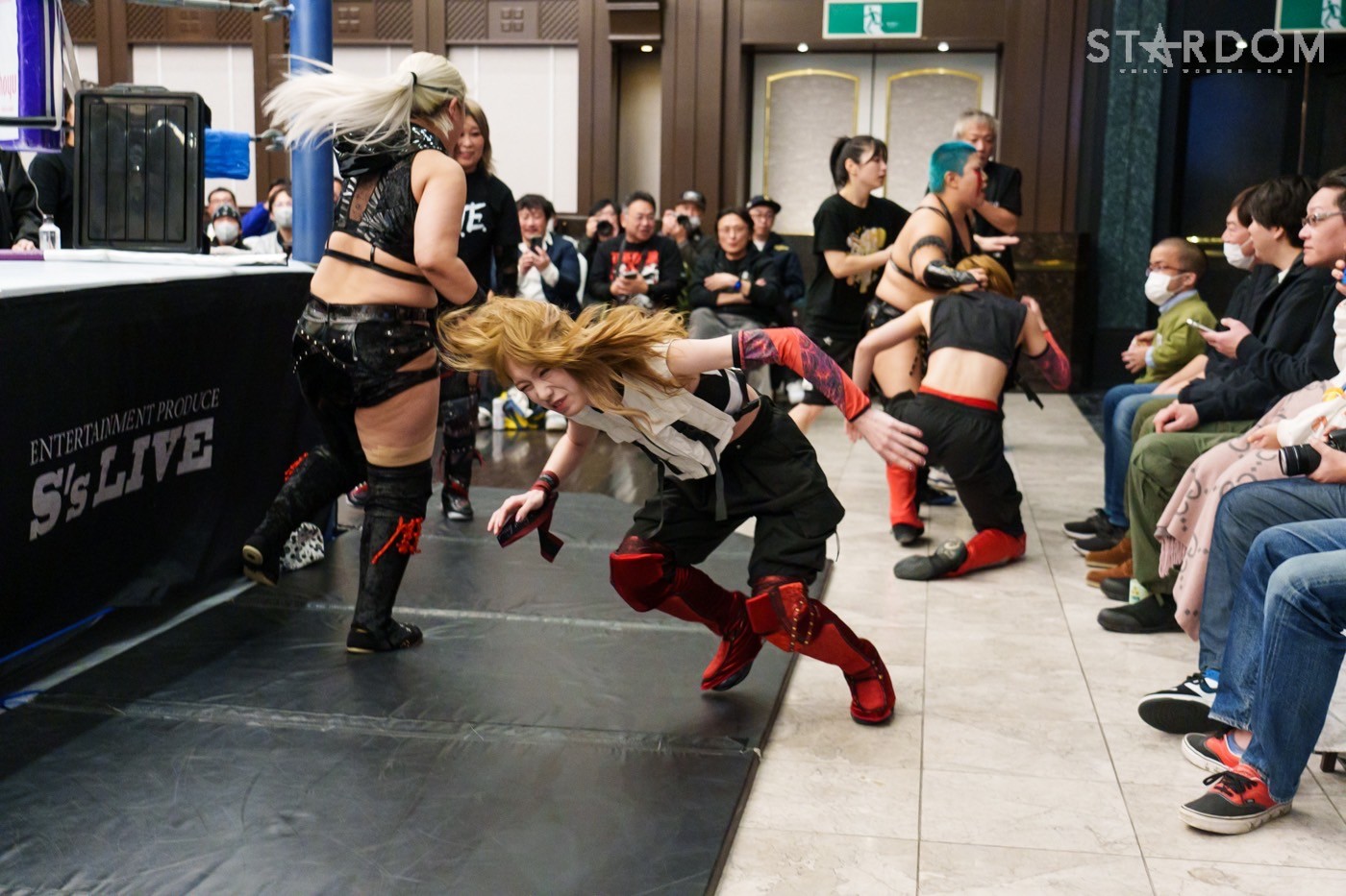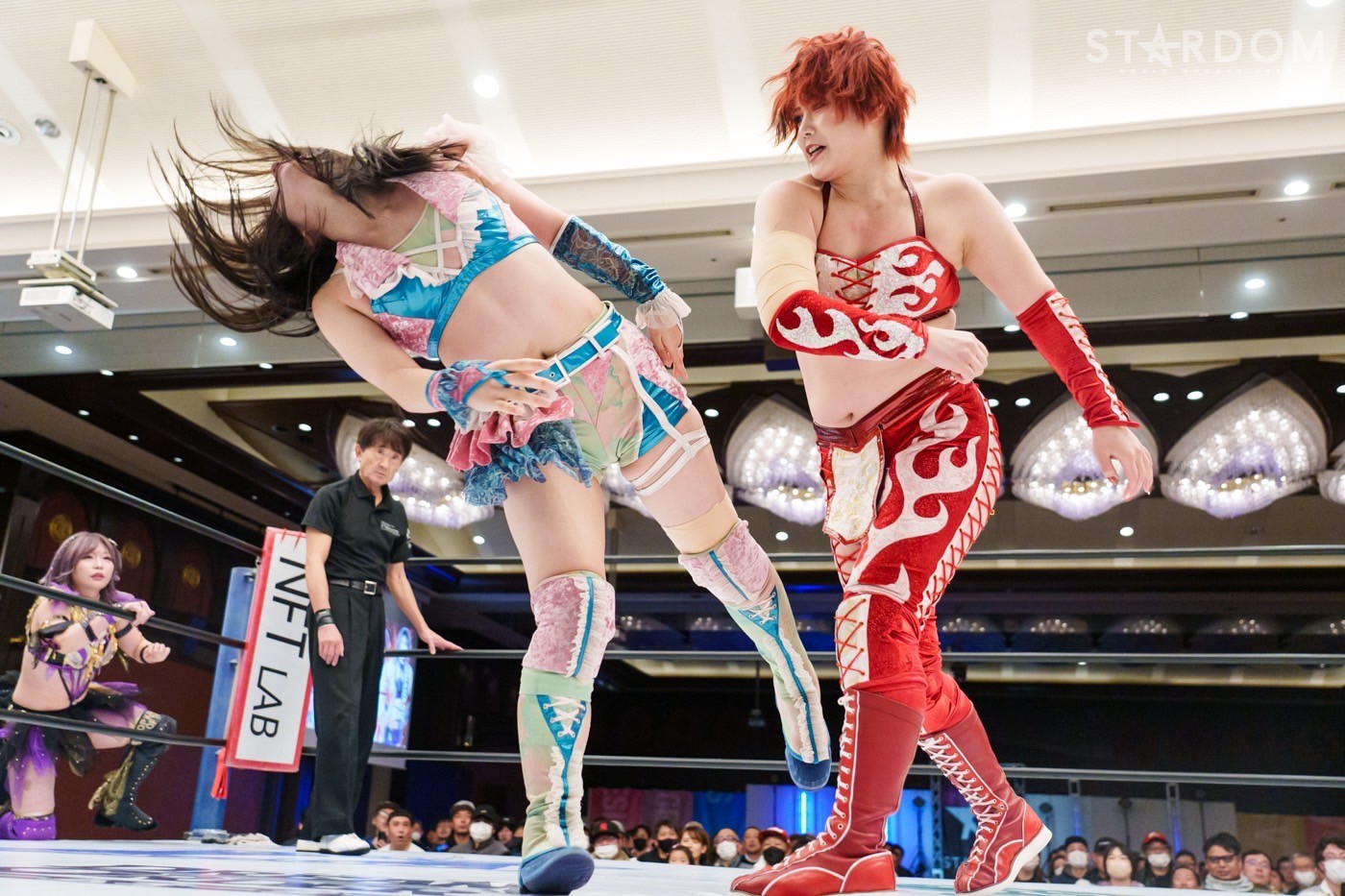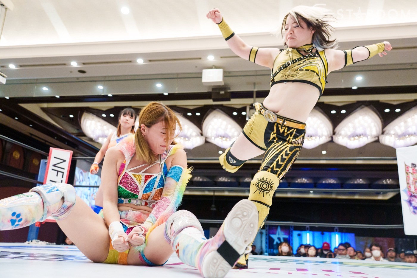 玖麗とHANAKOが視殺戦。2人の先発でスタートし、ロックアップでHANAKOが追い込む。すぐに玖麗が反転しエルボー連打。玖麗が手を引くがHANAKOは動かず。玖麗がさらにエルボー連打。HANAKOがドロップキックをかわしてストンピング。HANAKOの突進に中野が乱入してダブルの攻撃。玖麗のフットスタンプHANAKOが返すと、突進を止めてボディースラム。HANAKOは舞華を呼び込み、連係で玖麗を攻める。HANAKOは玖麗をボディースラムを連発。舞華が玖麗のエルボー連打を仁王立ちで受けて立つ。舞華が一発で玖麗を倒し、串刺しで突進。そこに玖麗がカウンターでドロップキック。中野が舞華にダイビングボディーアタック。HANAKOが突進を止めて舞華がラリアット。舞華とHANAKOをかいくぐり、中野がドロップキック。舞華が返してラリアット、中野はエルボーアタック。エルボーの応酬で中野が打ち勝つ。しかし、舞華がパワースラムで叩きつける。HANAKOが中野にショルダータックル、アルゼンチン。コーナーに叩きつけると串刺しボディーアタック、ニードロップ。中野が返すと、ブレーンバスター狙いを切り返してバックを取る。HANAKOが切り返すが、中野がネックブリーカー、側転ダブルニードロップ。玖麗がHANAKOへ串刺しドロップキック。引き起こすと中野を呼び込む。舞華が乱入し中野と玖麗を分断、HANAKOが玖麗にバックフリップ、アルゼンチン。中野がスピンキックでカットし、玖麗が飛びついてスリーパーホールド。なんとかHANAKOがエスケープ。玖麗はコーナーに上がりミサイルキック、ときめきスピア。HANAKOが受け止めラリアット。玖麗がかわして中野の突進とスピアが合体。玖麗はHANAKOにときめきカッターを決める。しかし、舞華のカットが間に合う。中野と玖麗が合体を試みるが舞華とHANAKOがブレーンバスターの競演。舞華はエプロンからリング下の中野にラリアット。HANAKOが玖麗にバックドロップ。決まったと思われたが玖麗が返す。玖麗がジャックナイフで丸め込むが舞華がカット。舞華とHANAKOが玖麗を持ち上げマットに叩きつける。HANAKOはアルゼンチンからJPコースター。3カウントが入りHANAKOが玖麗を破った。