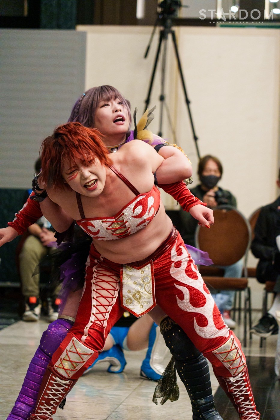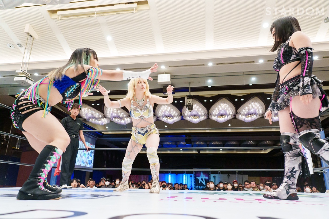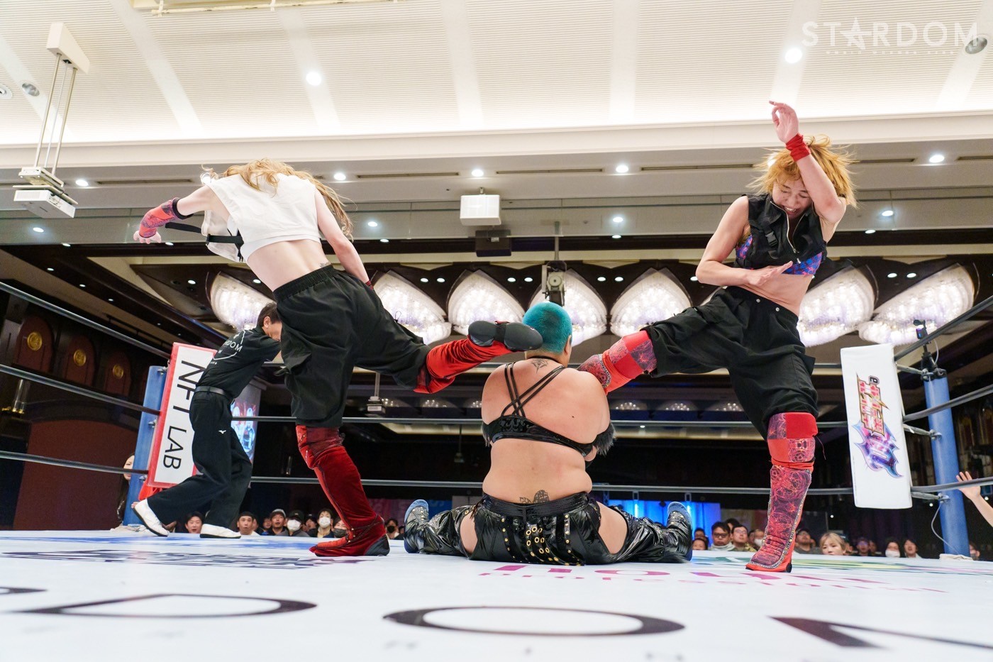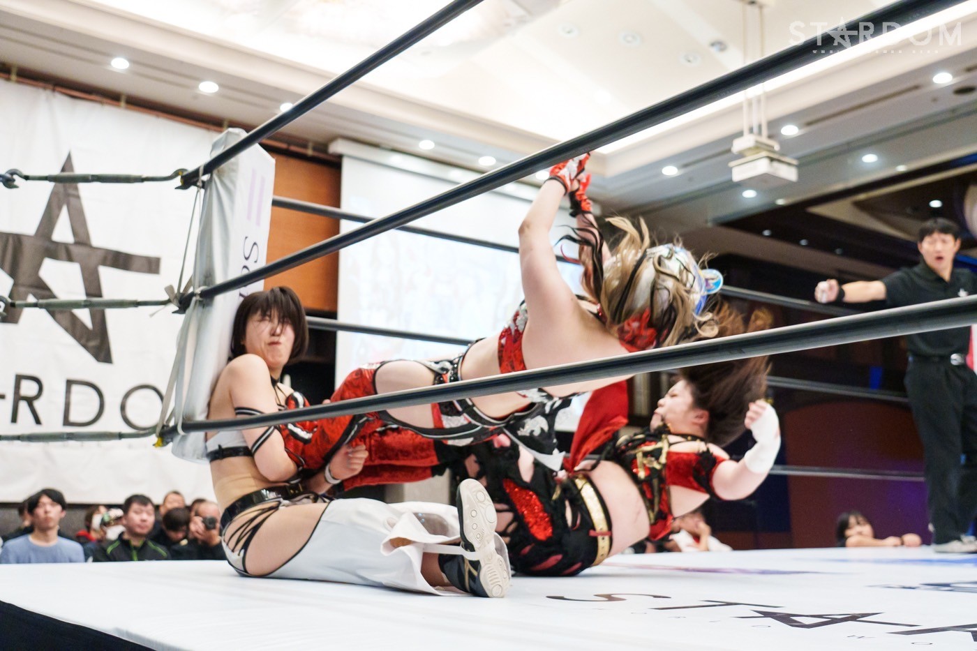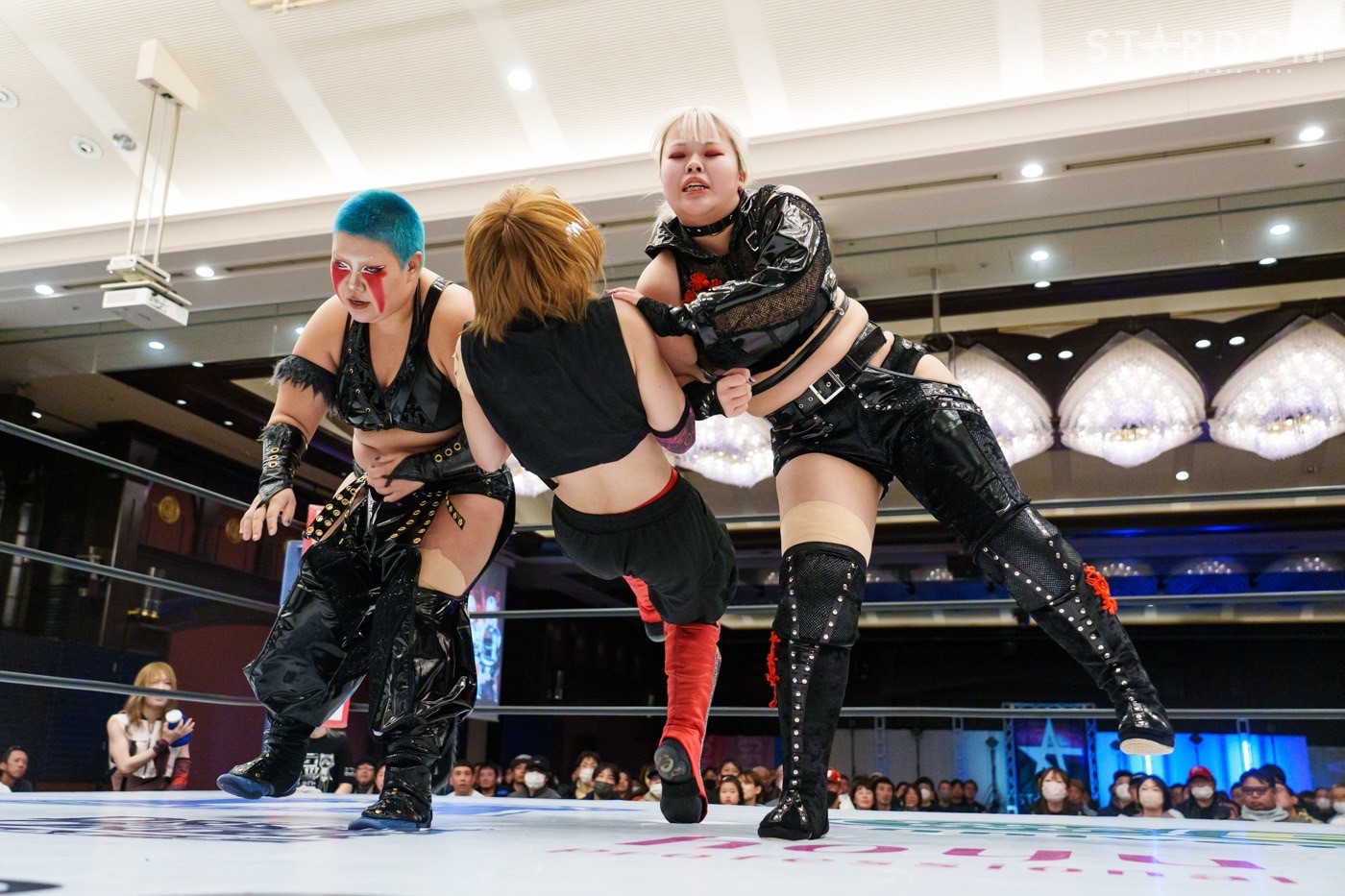 なつぽいと星来が手四つの構え。吏南が歩を進めるとロープワークに突入し、吏南がまとめてドロップキック。吏南がなつぽいにヘアーホイップ、星来も捕まえてヘアーホイップ。コーナーに追い込むと「2人まとめて、このクソババア!」と顔面を踏みつけていく。止めに入ったレフェリーには「うるせえ、クソジジイ!」。吏南はなつぽいをロープに固定し、背中にドロップキック。なつぽいが返すと、吏南とエルボーの打ち合い。なつぽいが「クソガキ!」とエルボー、吏南は「クソババア!」とやり返す。なつぽいがバックキック、吏南が突進を止めて卍固め。星来が割って入り、吏南の髪を引っ張る。星来はまとめてミサイルキック、吏南にラリアット。吏南がエルボー、払い腰で星来を叩きつける。星来が吏南にブレーンバスター、バックの取り合いになつぽいがトラースキック、星来がかわして吏南にヒット。星来がなつぽいを丸め込む。なつぽいが星来にネックブリーカー、ジャックナイフ。吏南がカットしなつぽいにビッグブーツ。星来が吏南にドロップキック。なつぽいが星来にポイ捨てジャーマン。吏南がリング下からなつぽいの足を引き、星来にビッグブーツ、フィッシャーマン。星来が返すと、なつぽいがまとめてダイビングボディーアタック。吏南が返すとなつぽいが丸め込みの連続、反転して吏南が上になるもカットされる。なつぽいに吏南がSTO、リバースブレーンバスターを決める。しかし、なつぽいの肩が上がる。吏南はピンクデビルの構えもなつぽいがフェアリングリングで叩きつけ3カウントを奪った。