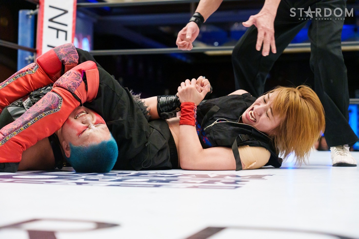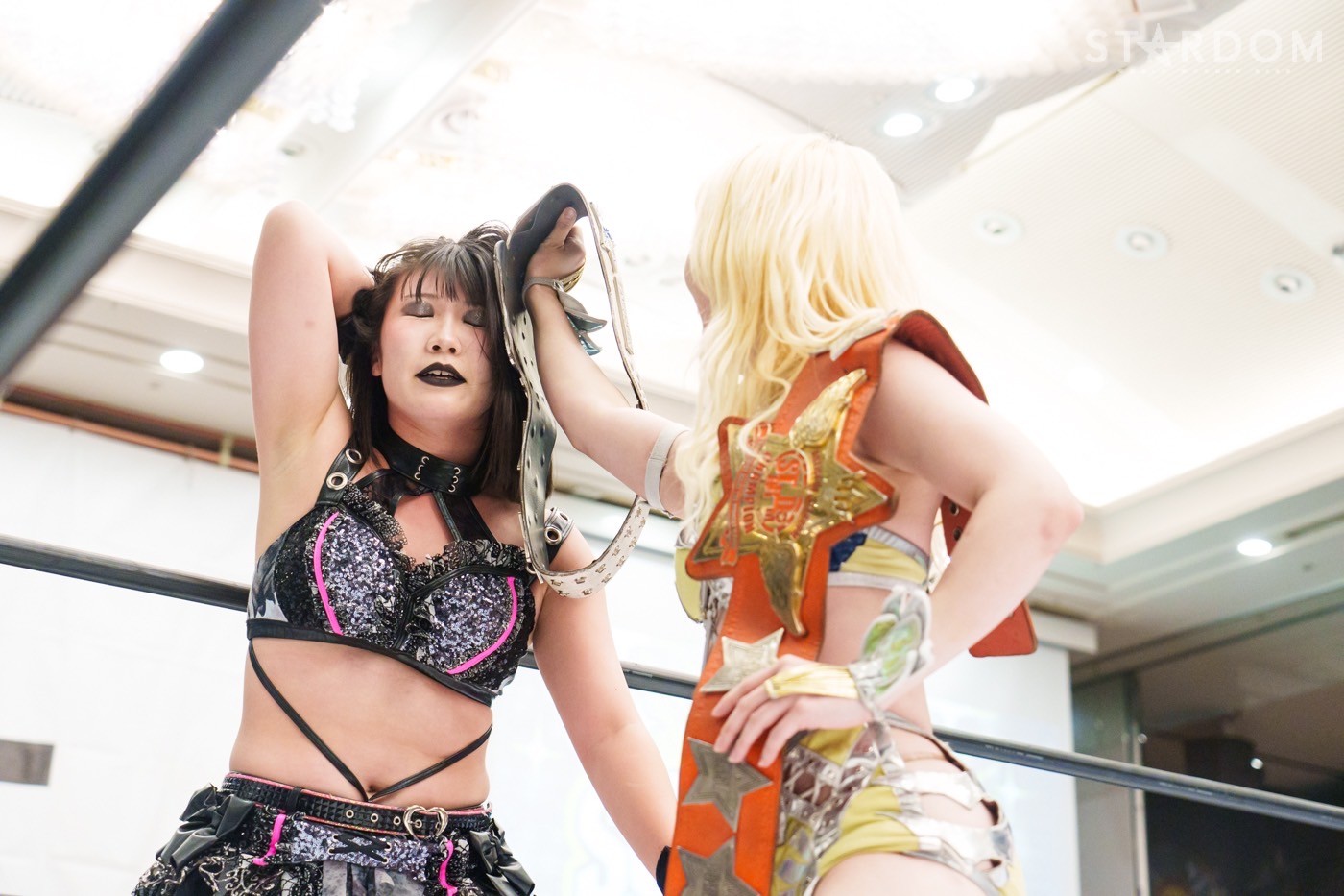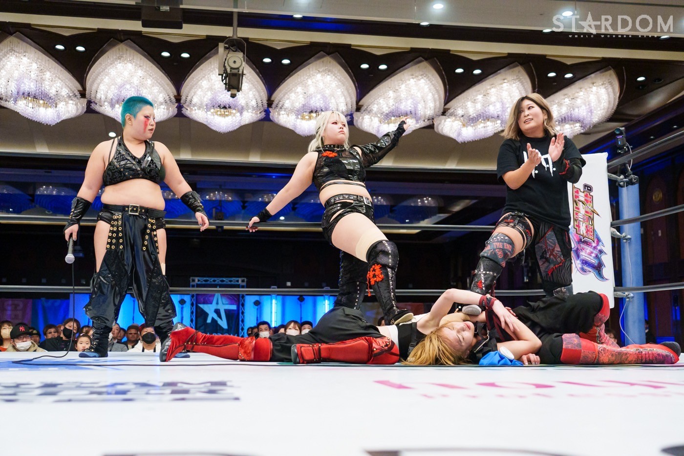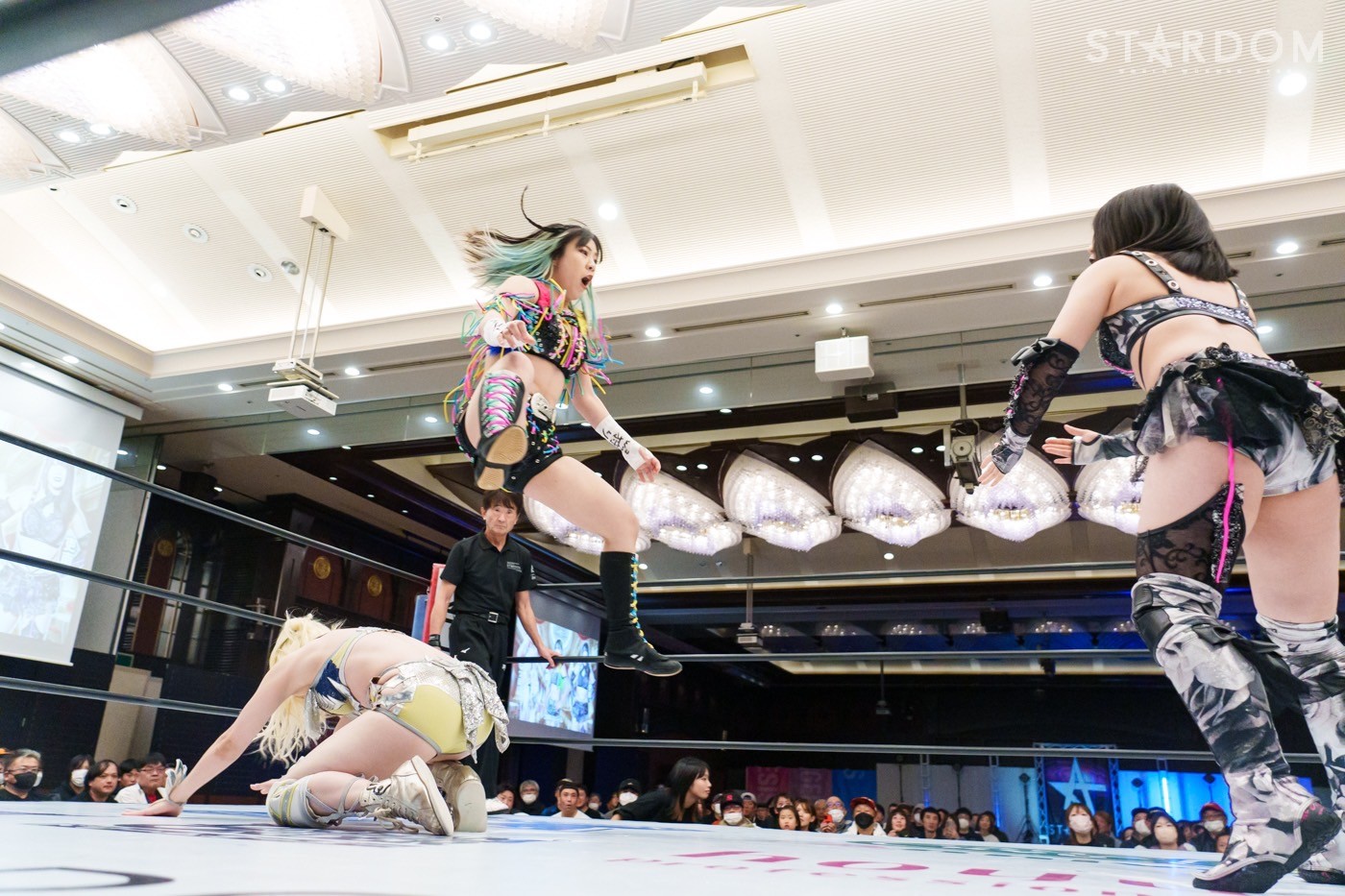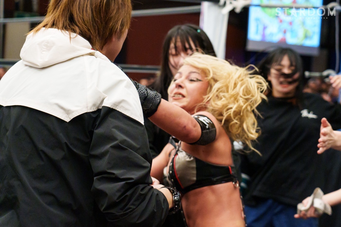 なつぽいと星来が手四つの構え。吏南が歩を進めるとロープワークに突入し、吏南がまとめてドロップキック。吏南がなつぽいにヘアーホイップ、星来も捕まえてヘアーホイップ。コーナーに追い込むと「2人まとめて、このクソババア!」と顔面を踏みつけていく。止めに入ったレフェリーには「うるせえ、クソジジイ!」。吏南はなつぽいをロープに固定し、背中にドロップキック。なつぽいが返すと、吏南とエルボーの打ち合い。なつぽいが「クソガキ!」とエルボー、吏南は「クソババア!」とやり返す。なつぽいがバックキック、吏南が突進を止めて卍固め。星来が割って入り、吏南の髪を引っ張る。星来はまとめてミサイルキック、吏南にラリアット。吏南がエルボー、払い腰で星来を叩きつける。星来が吏南にブレーンバスター、バックの取り合いになつぽいがトラースキック、星来がかわして吏南にヒット。星来がなつぽいを丸め込む。なつぽいが星来にネックブリーカー、ジャックナイフ。吏南がカットしなつぽいにビッグブーツ。星来が吏南にドロップキック。なつぽいが星来にポイ捨てジャーマン。吏南がリング下からなつぽいの足を引き、星来にビッグブーツ、フィッシャーマン。星来が返すと、なつぽいがまとめてダイビングボディーアタック。吏南が返すとなつぽいが丸め込みの連続、反転して吏南が上になるもカットされる。なつぽいに吏南がSTO、リバースブレーンバスターを決める。しかし、なつぽいの肩が上がる。吏南はピンクデビルの構えもなつぽいがフェアリングリングで叩きつけ3カウントを奪った。