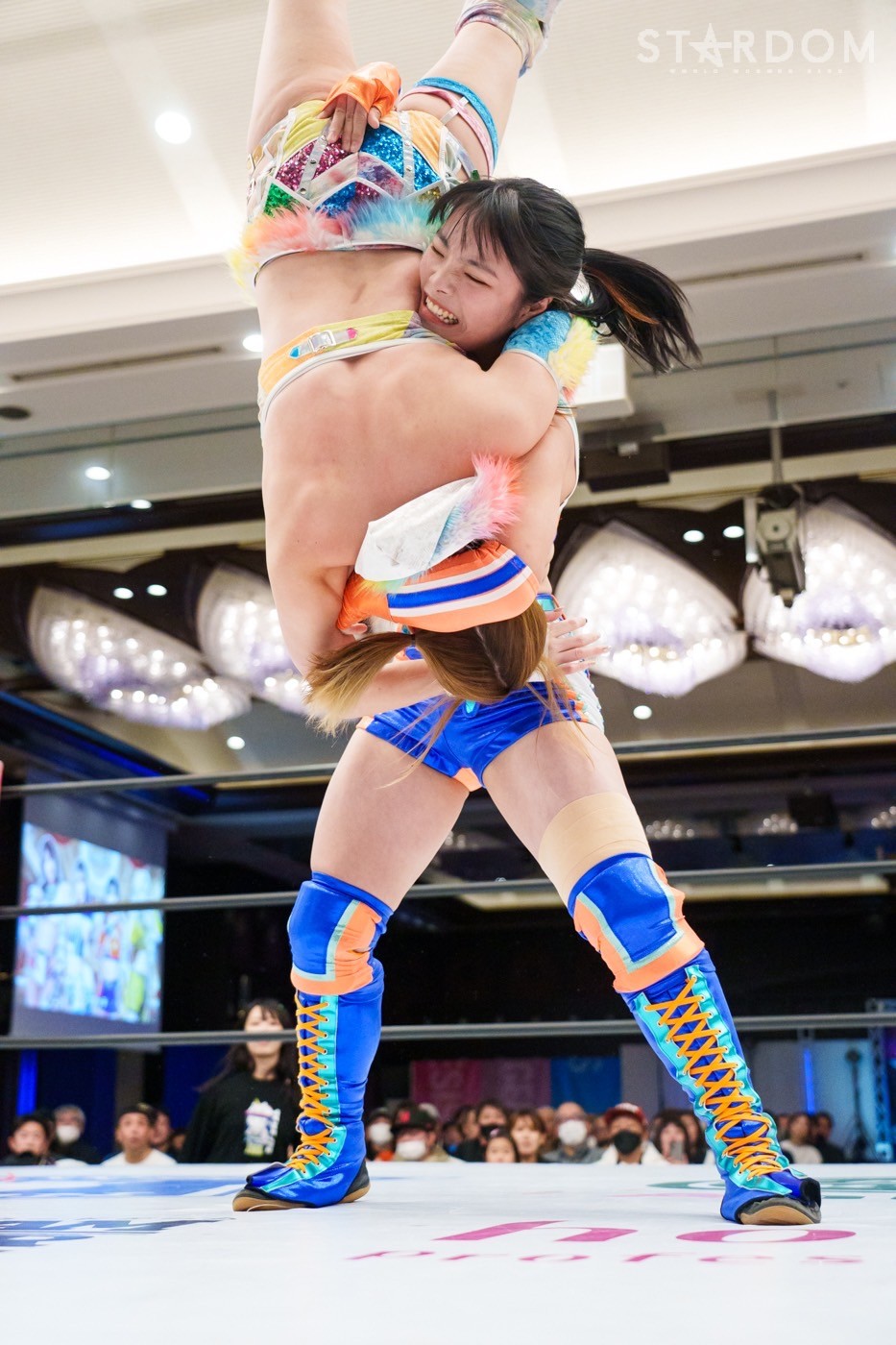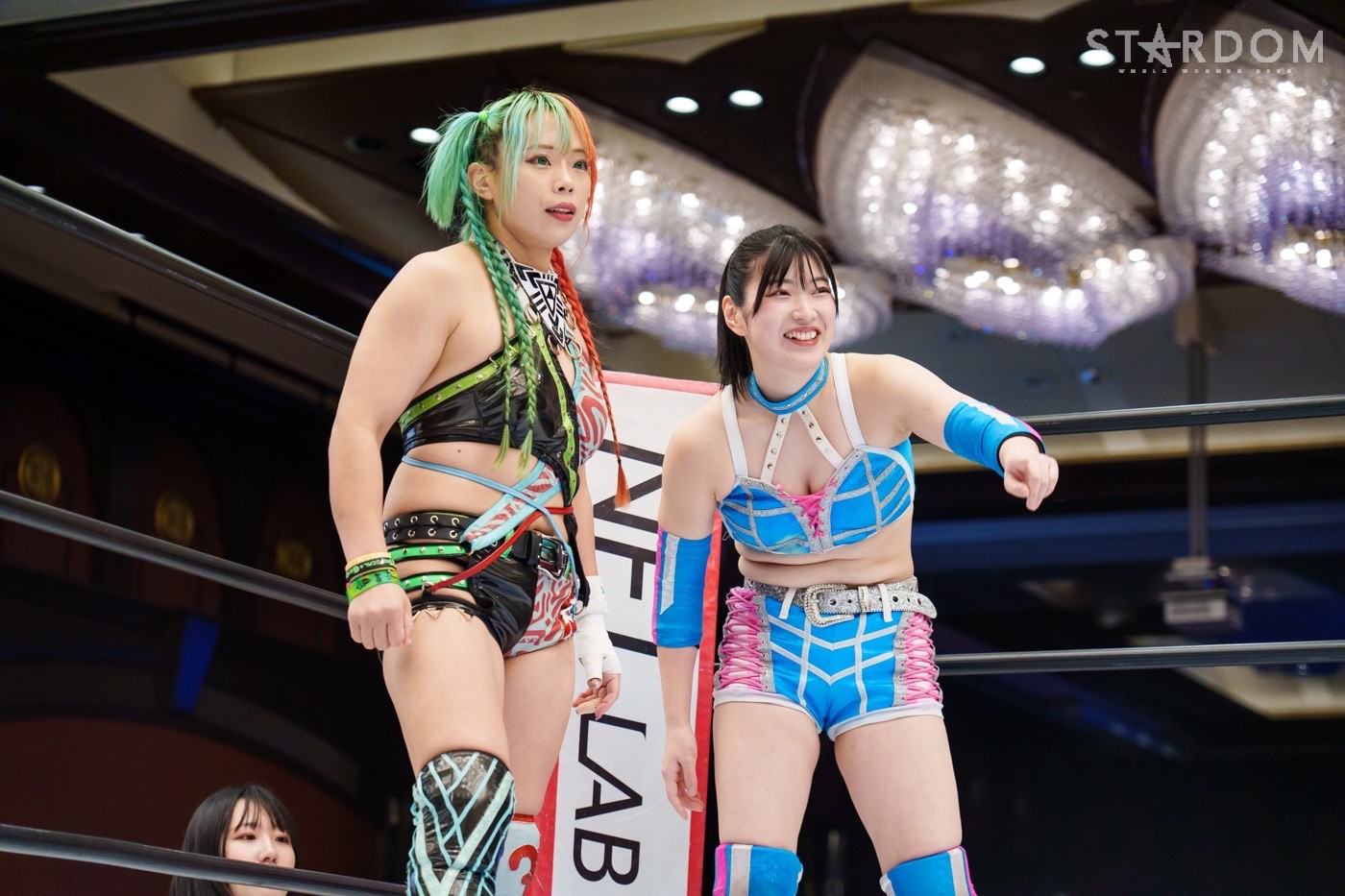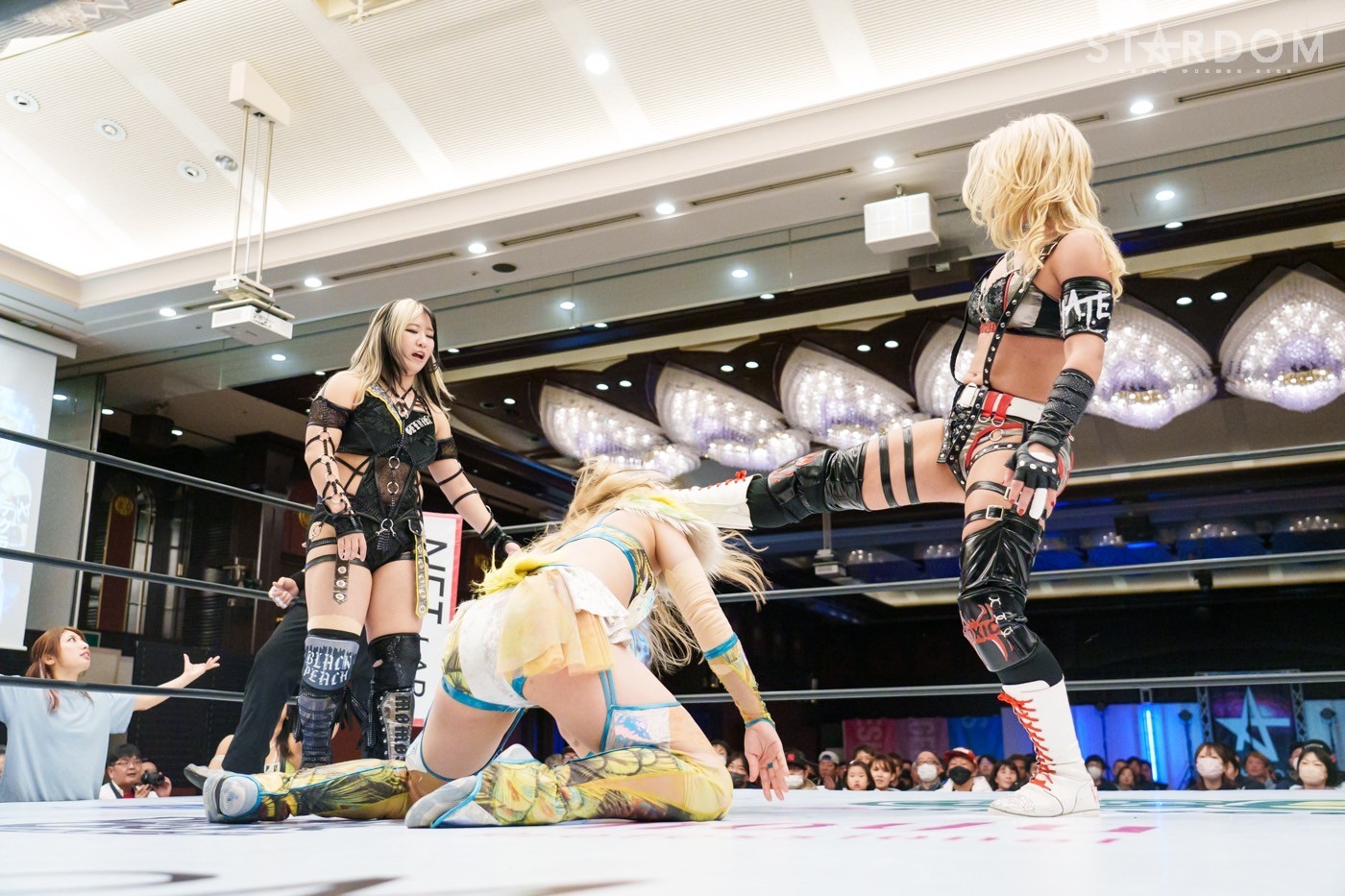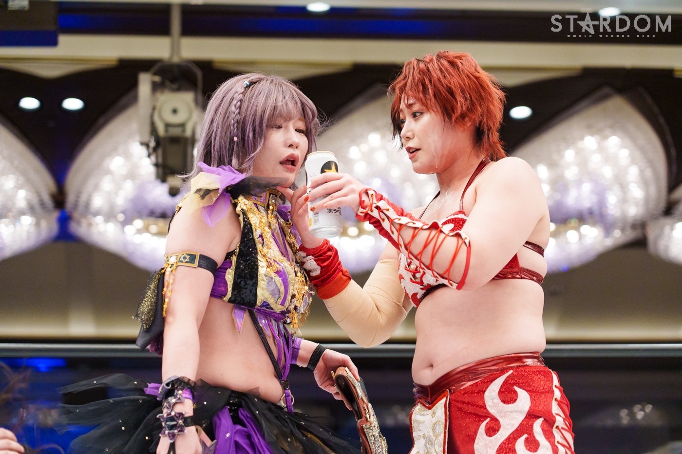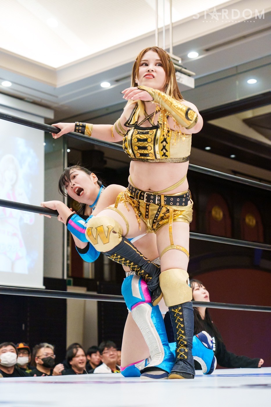 なつぽいと星来が手四つの構え。吏南が歩を進めるとロープワークに突入し、吏南がまとめてドロップキック。吏南がなつぽいにヘアーホイップ、星来も捕まえてヘアーホイップ。コーナーに追い込むと「2人まとめて、このクソババア!」と顔面を踏みつけていく。止めに入ったレフェリーには「うるせえ、クソジジイ!」。吏南はなつぽいをロープに固定し、背中にドロップキック。なつぽいが返すと、吏南とエルボーの打ち合い。なつぽいが「クソガキ!」とエルボー、吏南は「クソババア!」とやり返す。なつぽいがバックキック、吏南が突進を止めて卍固め。星来が割って入り、吏南の髪を引っ張る。星来はまとめてミサイルキック、吏南にラリアット。吏南がエルボー、払い腰で星来を叩きつける。星来が吏南にブレーンバスター、バックの取り合いになつぽいがトラースキック、星来がかわして吏南にヒット。星来がなつぽいを丸め込む。なつぽいが星来にネックブリーカー、ジャックナイフ。吏南がカットしなつぽいにビッグブーツ。星来が吏南にドロップキック。なつぽいが星来にポイ捨てジャーマン。吏南がリング下からなつぽいの足を引き、星来にビッグブーツ、フィッシャーマン。星来が返すと、なつぽいがまとめてダイビングボディーアタック。吏南が返すとなつぽいが丸め込みの連続、反転して吏南が上になるもカットされる。なつぽいに吏南がSTO、リバースブレーンバスターを決める。しかし、なつぽいの肩が上がる。吏南はピンクデビルの構えもなつぽいがフェアリングリングで叩きつけ3カウントを奪った。
