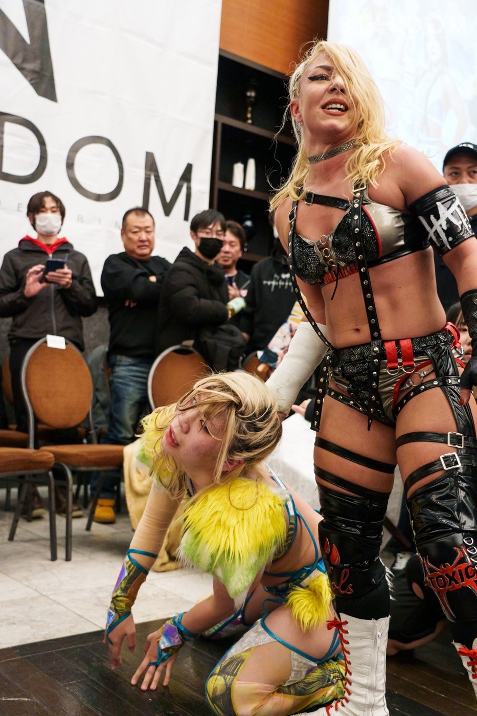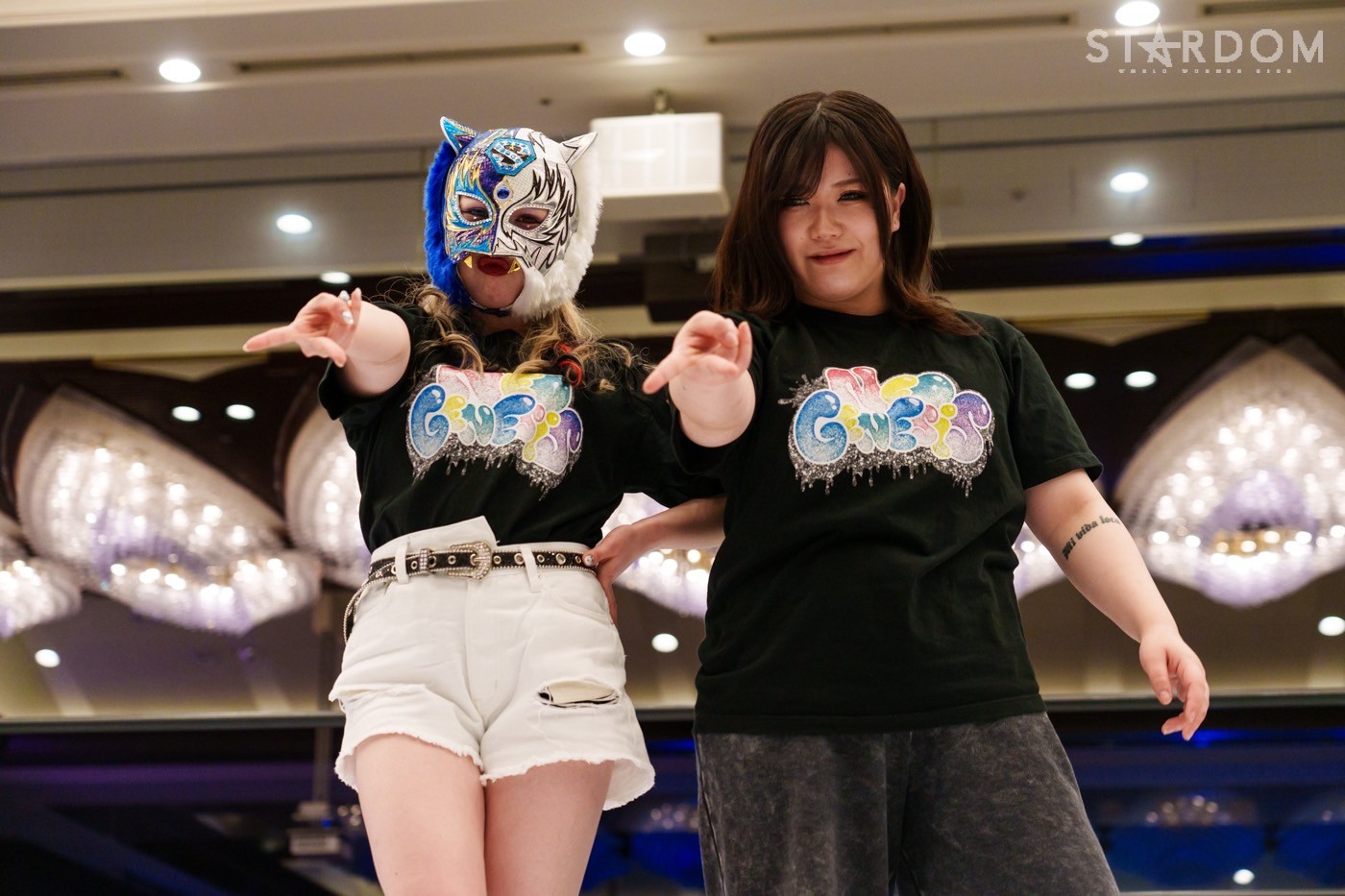 キッド「やめろ! いまのカットでお願いします(笑)。生配信だって(笑)。ちょっと声がやられちゃったんで、私がしゃべらせてもらいますけども、12月7日、8日でゴッデスタッグリーグいよいよ優勝チームが決定いたします。まあ、ウチら狂乱女虎が優勝いただいちゃうのは当然だよね。みんな浜松まで応援にきてくれますかあ! そしてまた上越、新潟県にも試合をしにきますので、その際はぜひご来場よろしくお願いします! ということで、このあとはネオジェネチアーズで楽しんでもらって、タッグリーグでは狂乱女虎、そしてこれからもネオジェネシスをよろしくー! グッバーイ!」