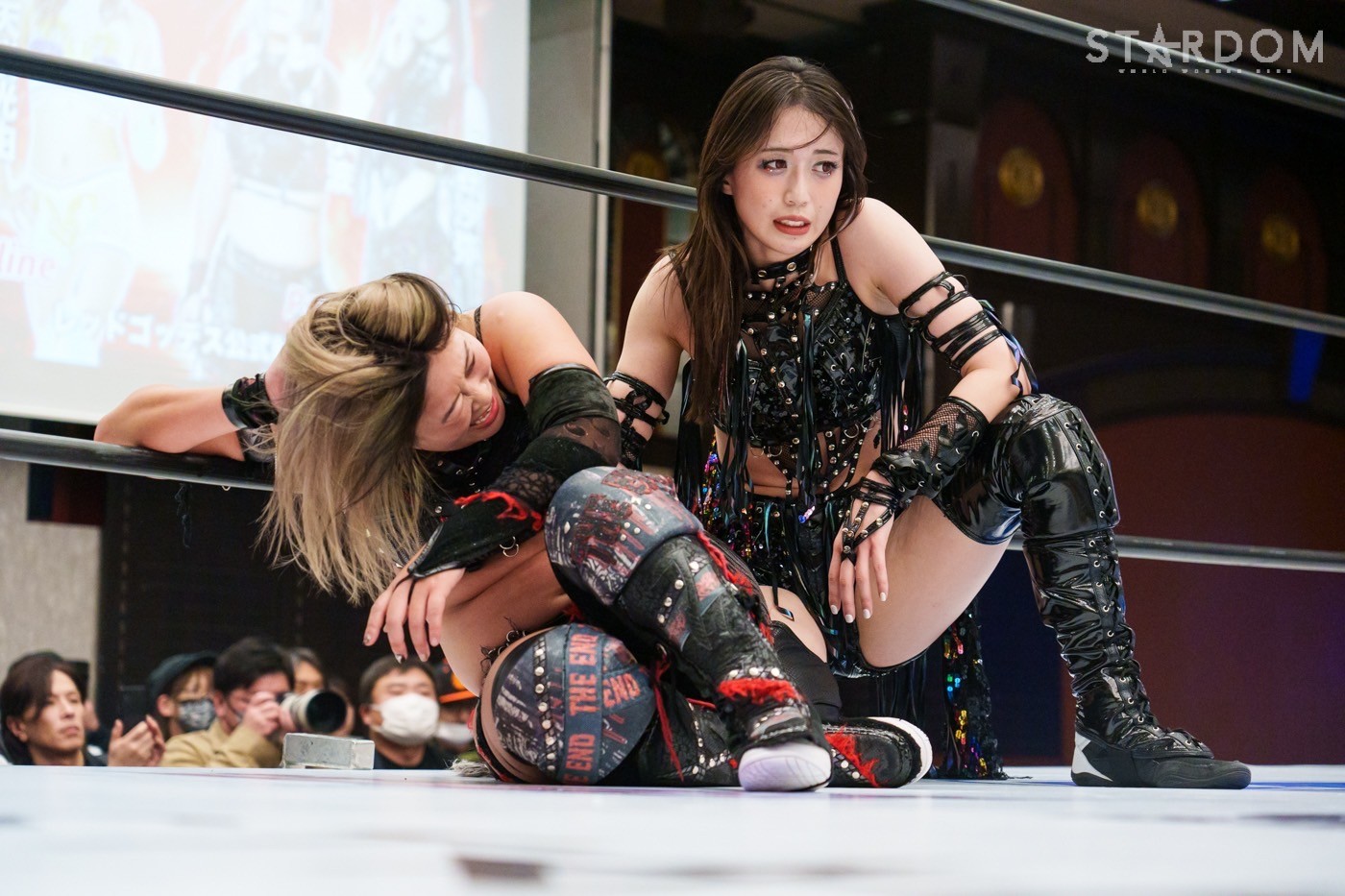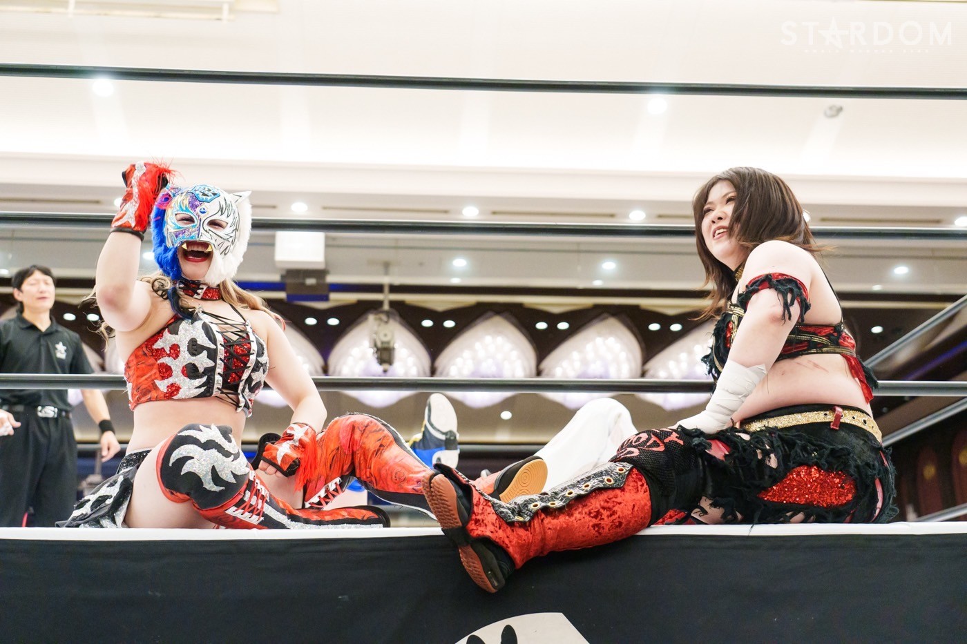 朱里&鹿島沙希組と刀羅ナツコ&琉悪夏組によるタッグリーグ公式戦は、ともに3勝4敗同士。勝った方がレッドゴッデスの3位に食い込む可能性が発生する。