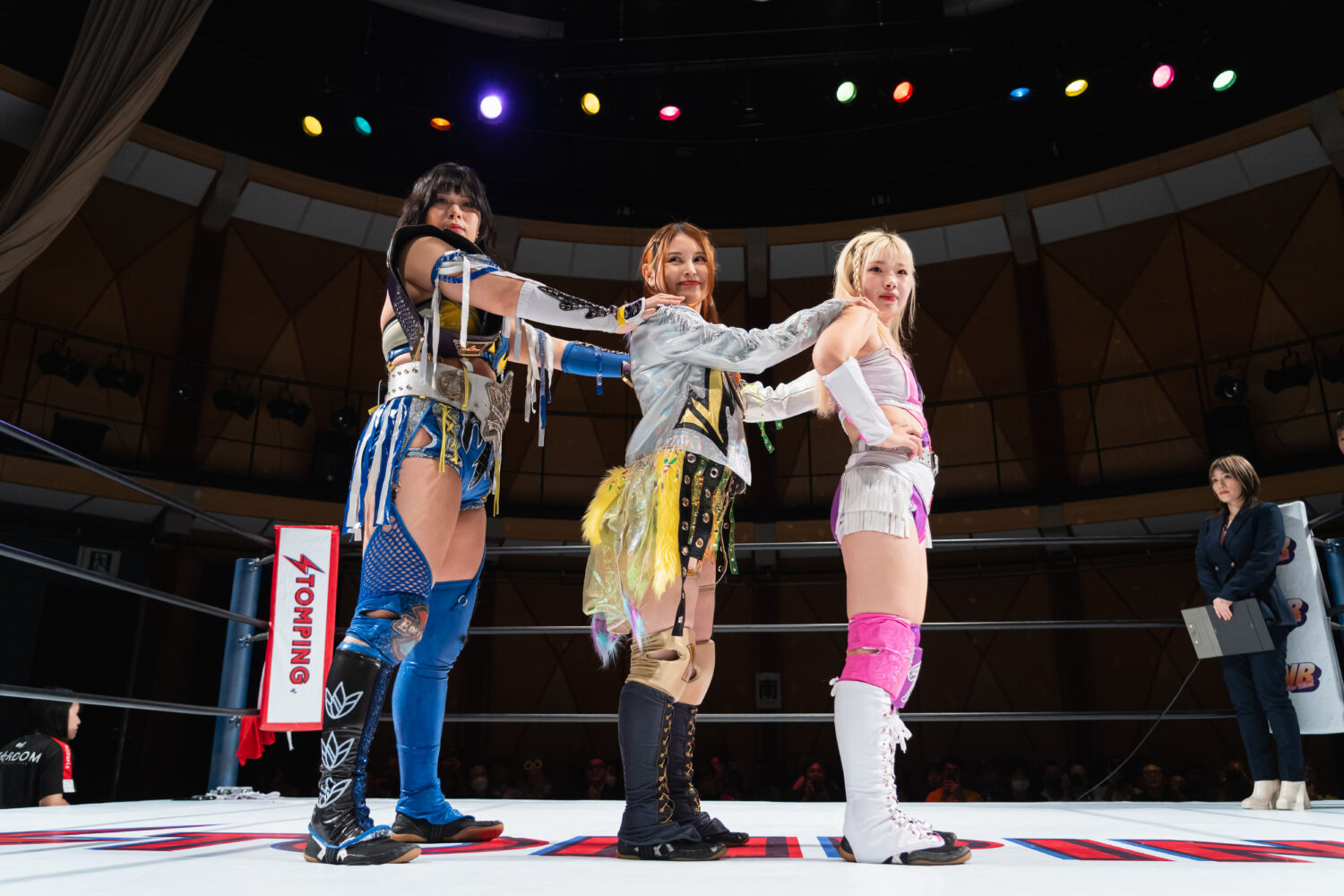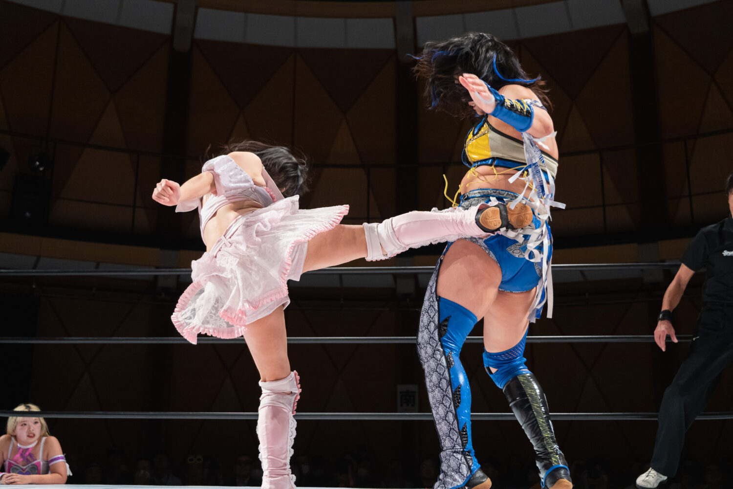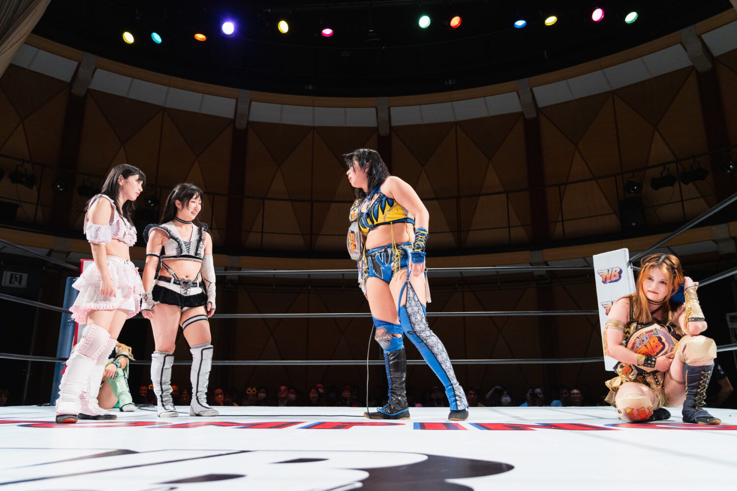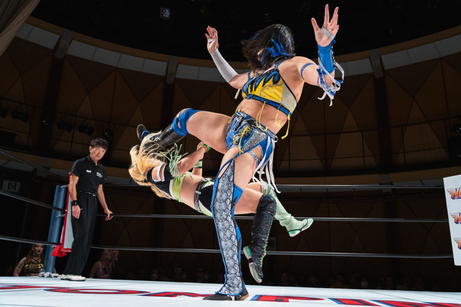 HANAKOと玖麗の先発でスタート。ロックアップで組み合い、HANAKOが突き飛ばす。玖麗がロープに追い込みエルボー連打、ドロップキック。HANAKOがこらえてショルダータックルで吹っ飛ばす。HANAKOは玖麗にボディースラムを連発。梨杏が玖麗にフットスタンプ、キャメルクラッチ。呼び込まれた月山が、ロープ間を往復してエルボー。梨杏は玖麗の手を踏みつける。玖麗がカウンターのドロップキック、ダイビングエルボーアタックを梨杏に見舞う。水森が梨杏にショルダータックル、サイドからのドロップキックを3連打してラリアット。梨杏が返すと、水森の突進をかわしてコルバタ。水森がドロップキックをかわすと、梨杏が飛びつく。水森がこらえて、体重を乗せてカバー。