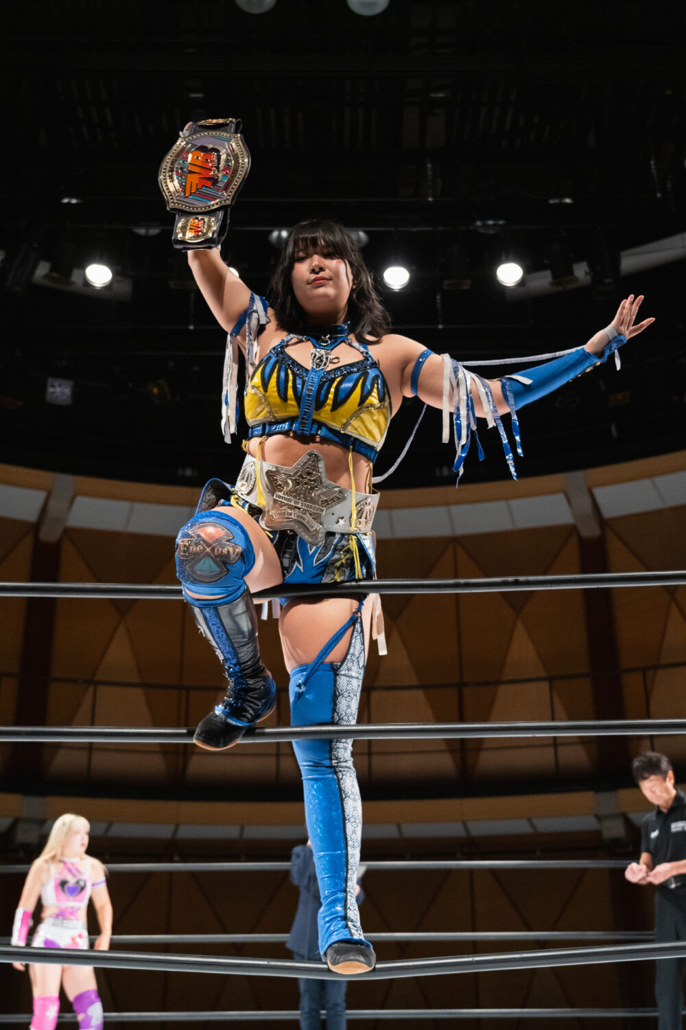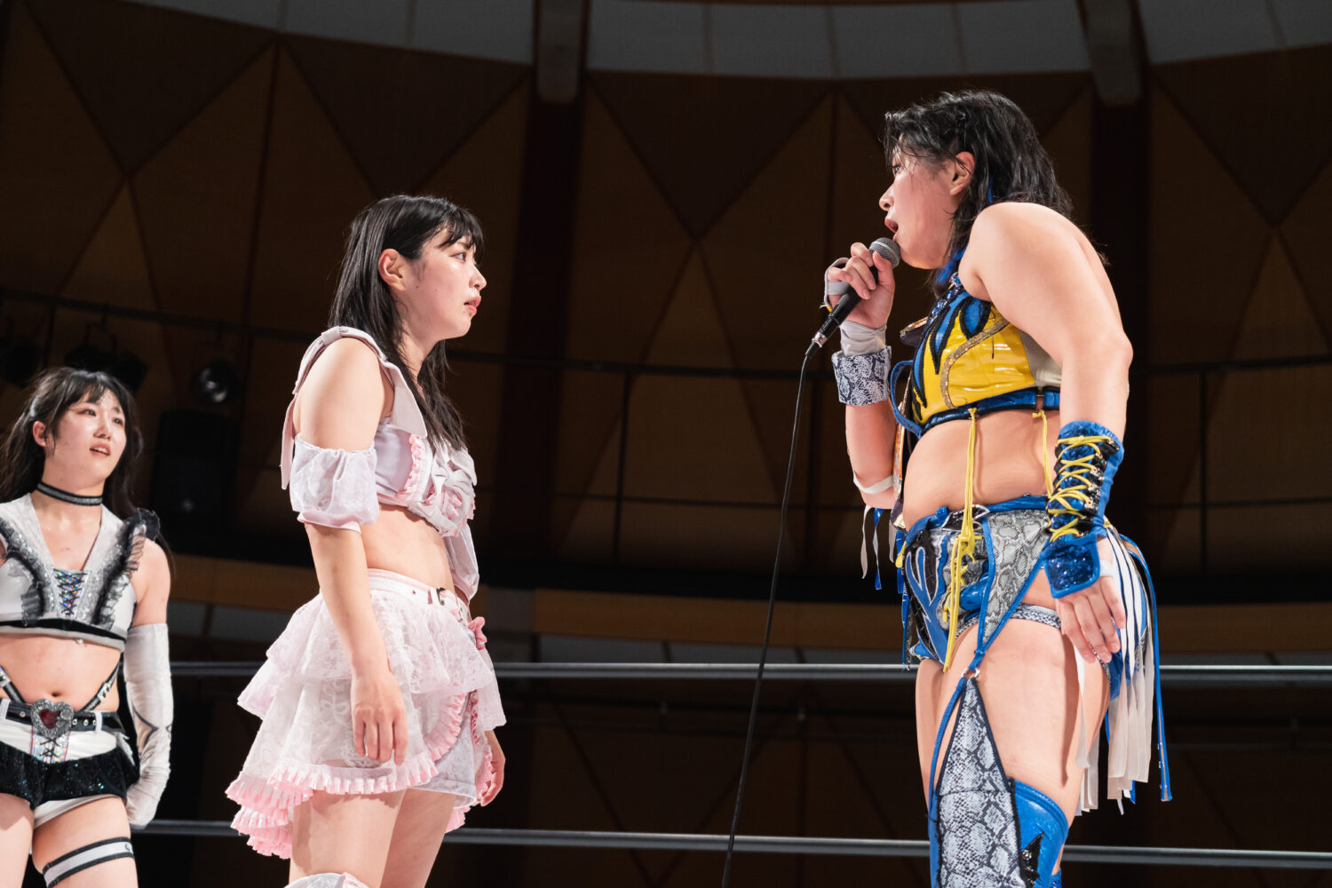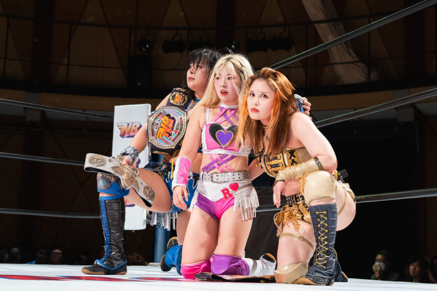 玖麗「今日は、NEW BLOODタッグチャンピオンに私たちが勝ちました。もう、そのベルト挑戦するの、止める人いないですよね! じゃあ、いつ挑戦させてくれますか?日程決めたいですよね、いまここで」