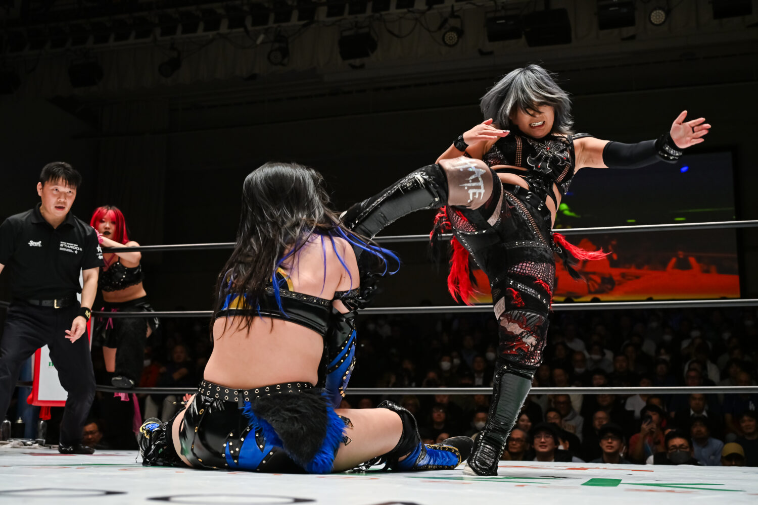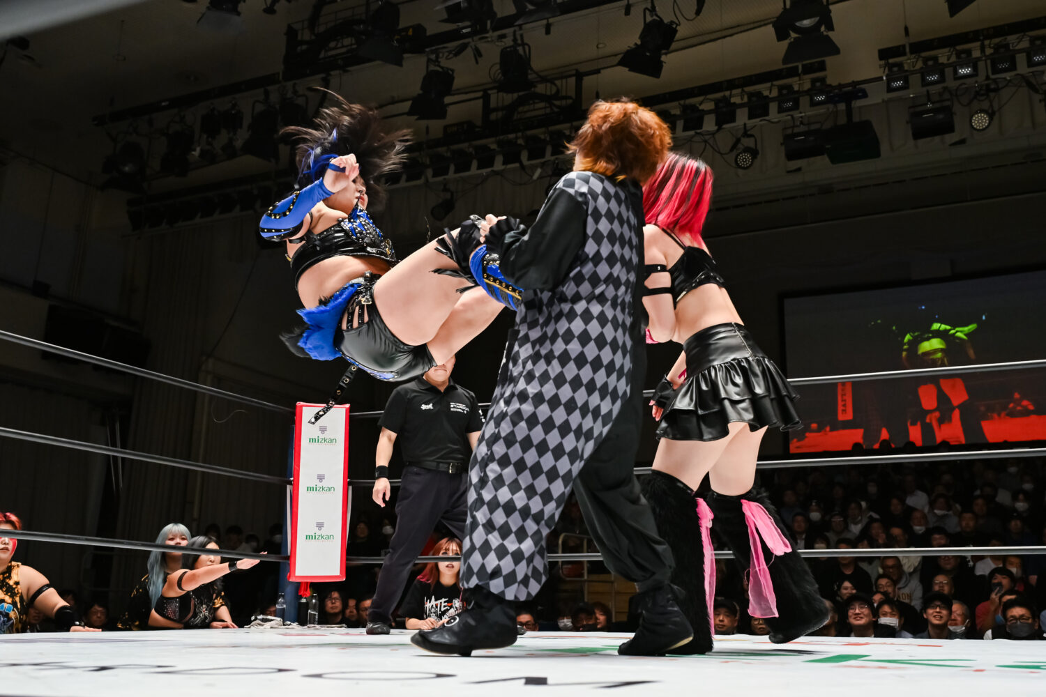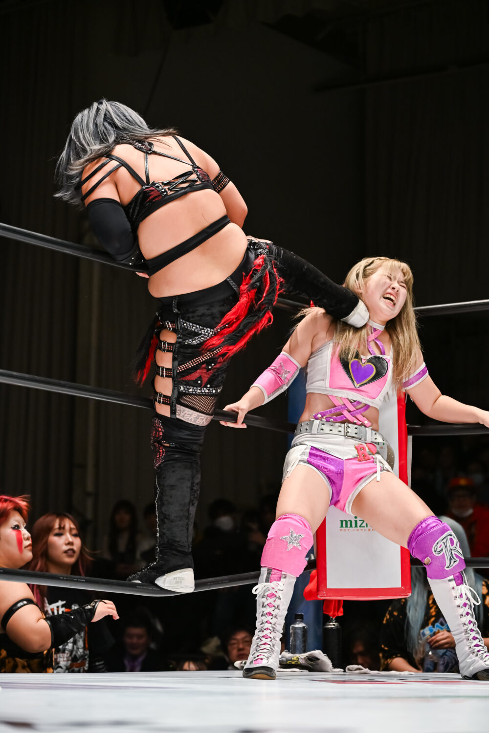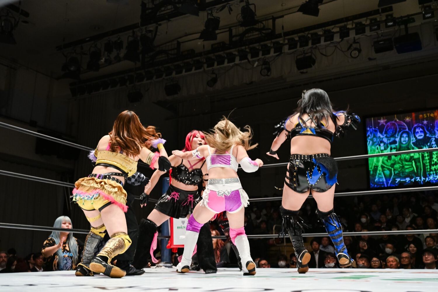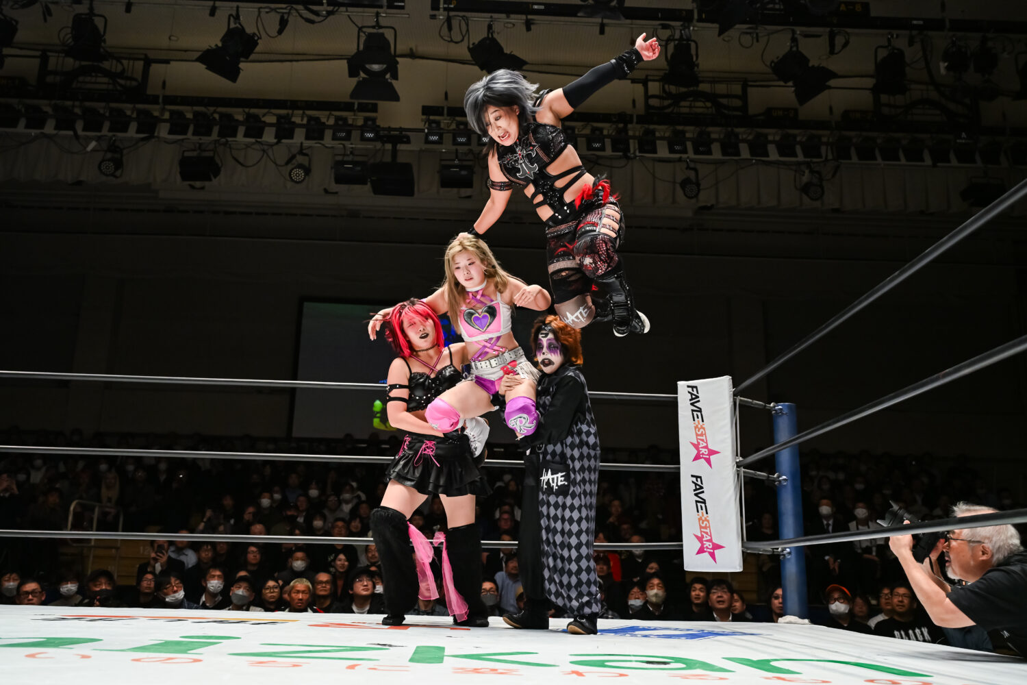 「いくぞ!」と月山が号令をかけて突進、H.A.T.E.を場外に出して月山と梨杏がプランチャで飛ぶ。HANAKOが吏南をリングに戻し、トリオで攻撃。HANAKOが月山をヒップドロップで落とし、梨杏がその場跳びボディープレス。梨杏が走るとセコンドのナツコが足を引き、場外戦へ。吏南が梨杏をリングに入れてヘアーホイップ、顔面を踏みつける。小波とフキゲンも梨杏の顔面を踏みつけていく。梨杏のエルボー連打を小波が受けて立つ。小波は梨杏にサッカーボールキック、片足でカバー。フキゲンが梨杏の鼻をつまんで攻撃。コーナーに追い込まれた梨杏が、いつもより早いタイミングでフキゲンにドロップキック。HANAKOが次々とショルダータックル、フキゲンにアルゼンチンバックブリーカー。吏南がカットするが、HANAKOがまとめて串刺しボディーアタック、まとめてドロップキック。フキゲンのサミングをHANAKOが阻止してエルボー。HANAKOの突進をフキゲンがかわして吏南と連係攻撃、小波がスライディングキック。小波はHANAKOに飛びつき腕十字。HANAKOがリフトアップしてブレーンバスターへ。小波が起き上がりバックキック、HANAKOがカウンターでビッグブーツ。小波がHANAKOにスリーパー、バックを取るとフキゲンもその後ろへ。HANAKOが切り返すがフキゲンと小波でキック、ダブルでジャーマンを決める。小波はPKも、2カウント。HANAKOが小波を持ち上げてバックドロップ。小波はカウンターでハイキック、HANAKOがショルダータックル。月山が控えの吏南を落としてから小波に串刺しヒップアタック、ドロップキック。小波がヒップアタックをかわして臀部にミドルキック、PK。吏南が月山にビッグブーツ、ドロップキック。月山が返して10分経過。吏南のビッグブーツを月山がキャッチし、突進を丸め込む。月山は丸め込みの連続で吏南を追い込む。月山の突進を小波が妨害して吏南が丸め込み。梨杏が吏南にドロップキック連打。ボディースラム狙いを吏南がこらえる。しかし、梨杏がボディースラム成功。吏南が返すと、梨杏が串刺しで突進。吏南がかわしてH.A.T.E.が串刺し攻撃の連続。吏南がダイビングダブルニードロップ。梨杏が返すと、吏南が卍固めでグラウンドへ。さらにアームブリーカーからコーナーへ。HANAKOと月山が止めると、吏南がコーナーから「来いよ」と挑発。梨杏はコーナーから雪崩式ネックブリーカー。フィッシャーマンも決めるが、カットされる。