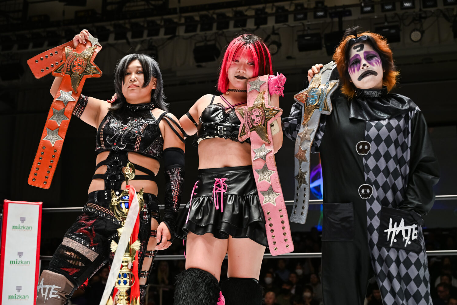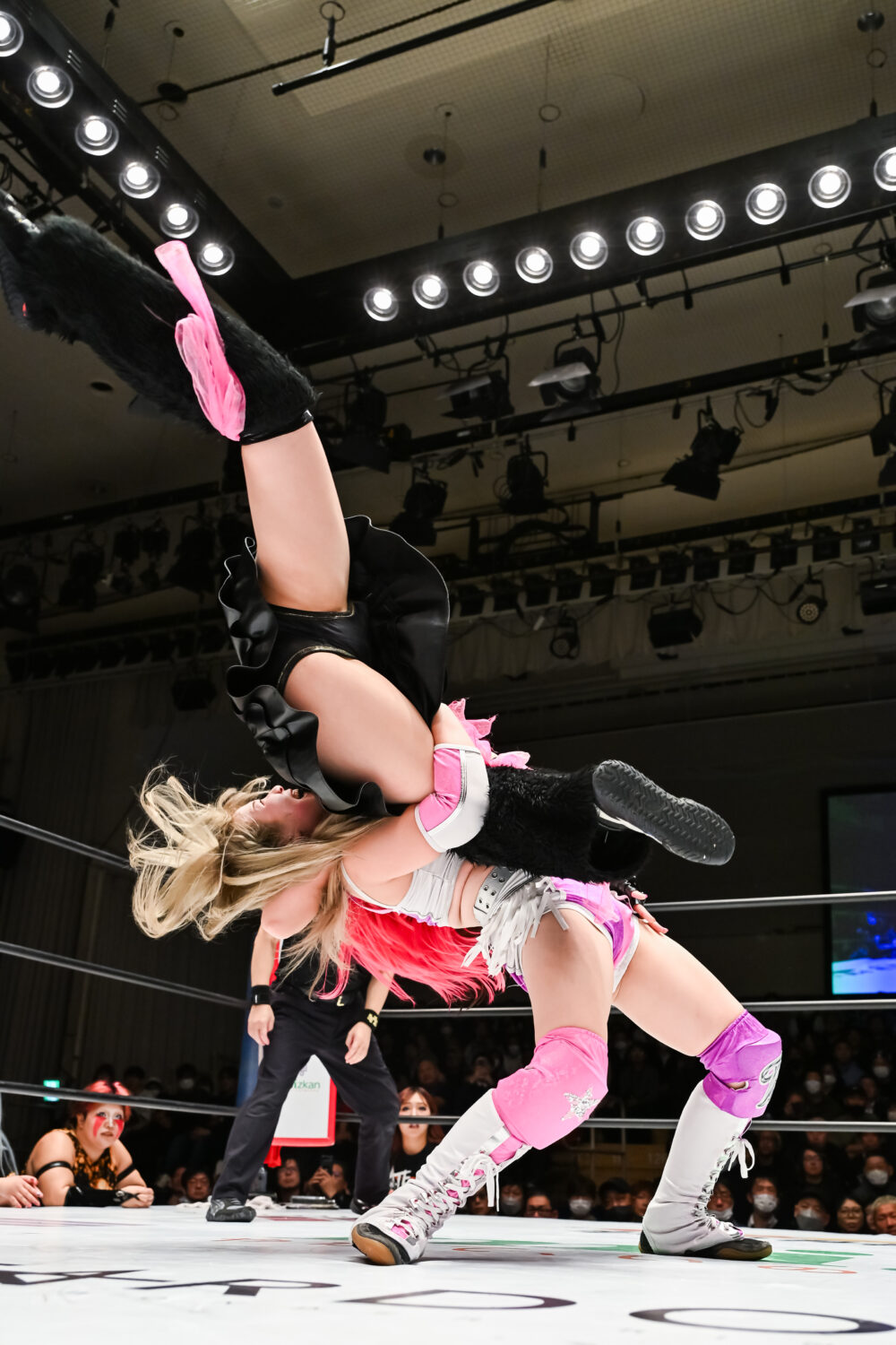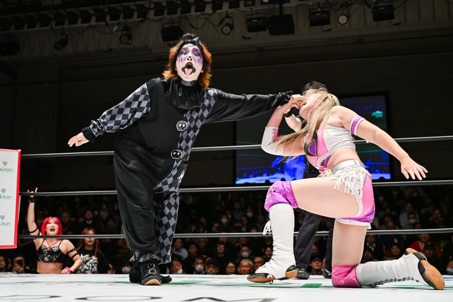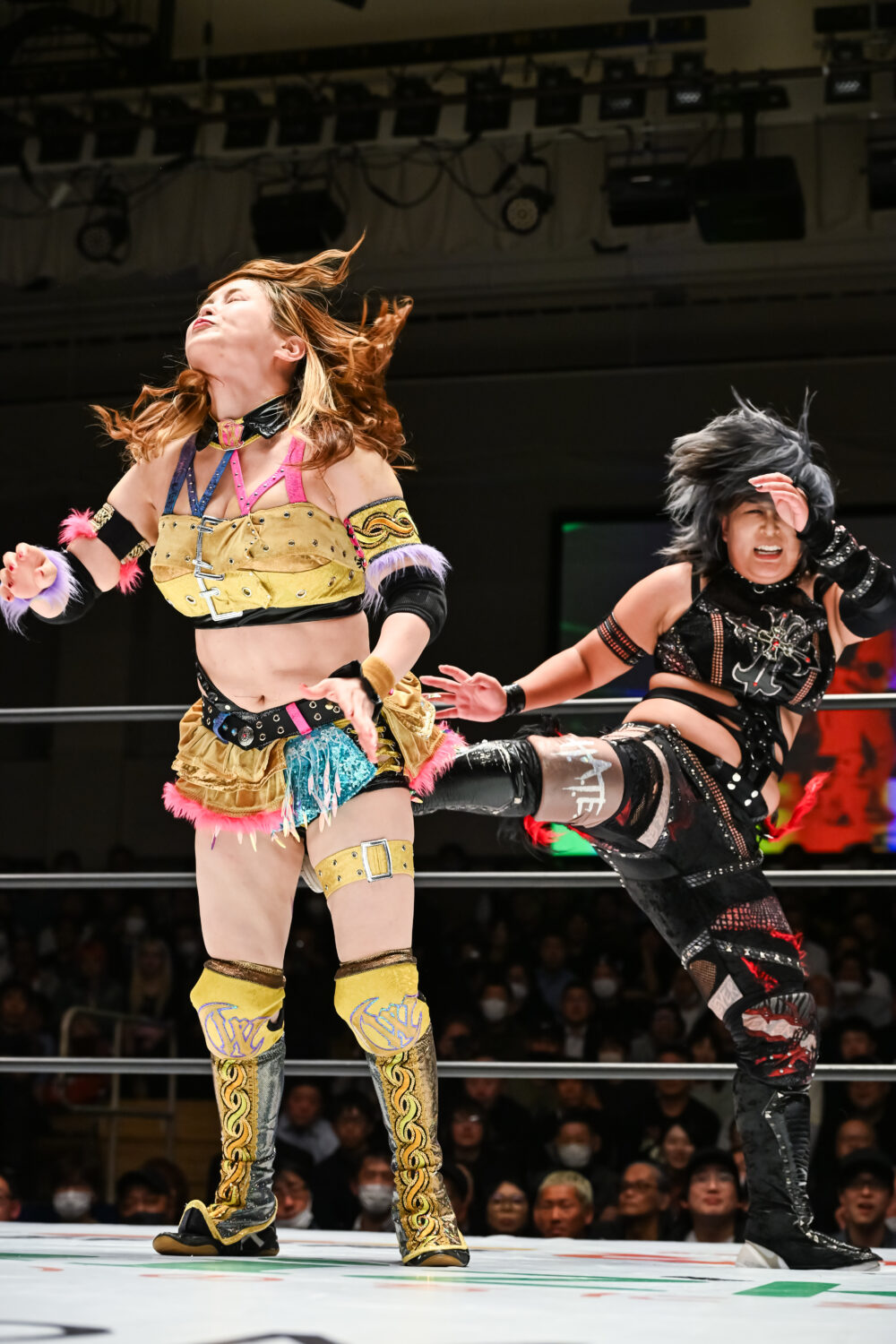 「いくぞ!」と月山が号令をかけて突進、H.A.T.E.を場外に出して月山と梨杏がプランチャで飛ぶ。HANAKOが吏南をリングに戻し、トリオで攻撃。HANAKOが月山をヒップドロップで落とし、梨杏がその場跳びボディープレス。梨杏が走るとセコンドのナツコが足を引き、場外戦へ。吏南が梨杏をリングに入れてヘアーホイップ、顔面を踏みつける。小波とフキゲンも梨杏の顔面を踏みつけていく。梨杏のエルボー連打を小波が受けて立つ。小波は梨杏にサッカーボールキック、片足でカバー。フキゲンが梨杏の鼻をつまんで攻撃。コーナーに追い込まれた梨杏が、いつもより早いタイミングでフキゲンにドロップキック。HANAKOが次々とショルダータックル、フキゲンにアルゼンチンバックブリーカー。吏南がカットするが、HANAKOがまとめて串刺しボディーアタック、まとめてドロップキック。フキゲンのサミングをHANAKOが阻止してエルボー。HANAKOの突進をフキゲンがかわして吏南と連係攻撃、小波がスライディングキック。小波はHANAKOに飛びつき腕十字。HANAKOがリフトアップしてブレーンバスターへ。小波が起き上がりバックキック、HANAKOがカウンターでビッグブーツ。小波がHANAKOにスリーパー、バックを取るとフキゲンもその後ろへ。HANAKOが切り返すがフキゲンと小波でキック、ダブルでジャーマンを決める。小波はPKも、2カウント。HANAKOが小波を持ち上げてバックドロップ。小波はカウンターでハイキック、HANAKOがショルダータックル。月山が控えの吏南を落としてから小波に串刺しヒップアタック、ドロップキック。小波がヒップアタックをかわして臀部にミドルキック、PK。吏南が月山にビッグブーツ、ドロップキック。月山が返して10分経過。吏南のビッグブーツを月山がキャッチし、突進を丸め込む。月山は丸め込みの連続で吏南を追い込む。月山の突進を小波が妨害して吏南が丸め込み。梨杏が吏南にドロップキック連打。ボディースラム狙いを吏南がこらえる。しかし、梨杏がボディースラム成功。吏南が返すと、梨杏が串刺しで突進。吏南がかわしてH.A.T.E.が串刺し攻撃の連続。吏南がダイビングダブルニードロップ。梨杏が返すと、吏南が卍固めでグラウンドへ。さらにアームブリーカーからコーナーへ。HANAKOと月山が止めると、吏南がコーナーから「来いよ」と挑発。梨杏はコーナーから雪崩式ネックブリーカー。フィッシャーマンも決めるが、カットされる。