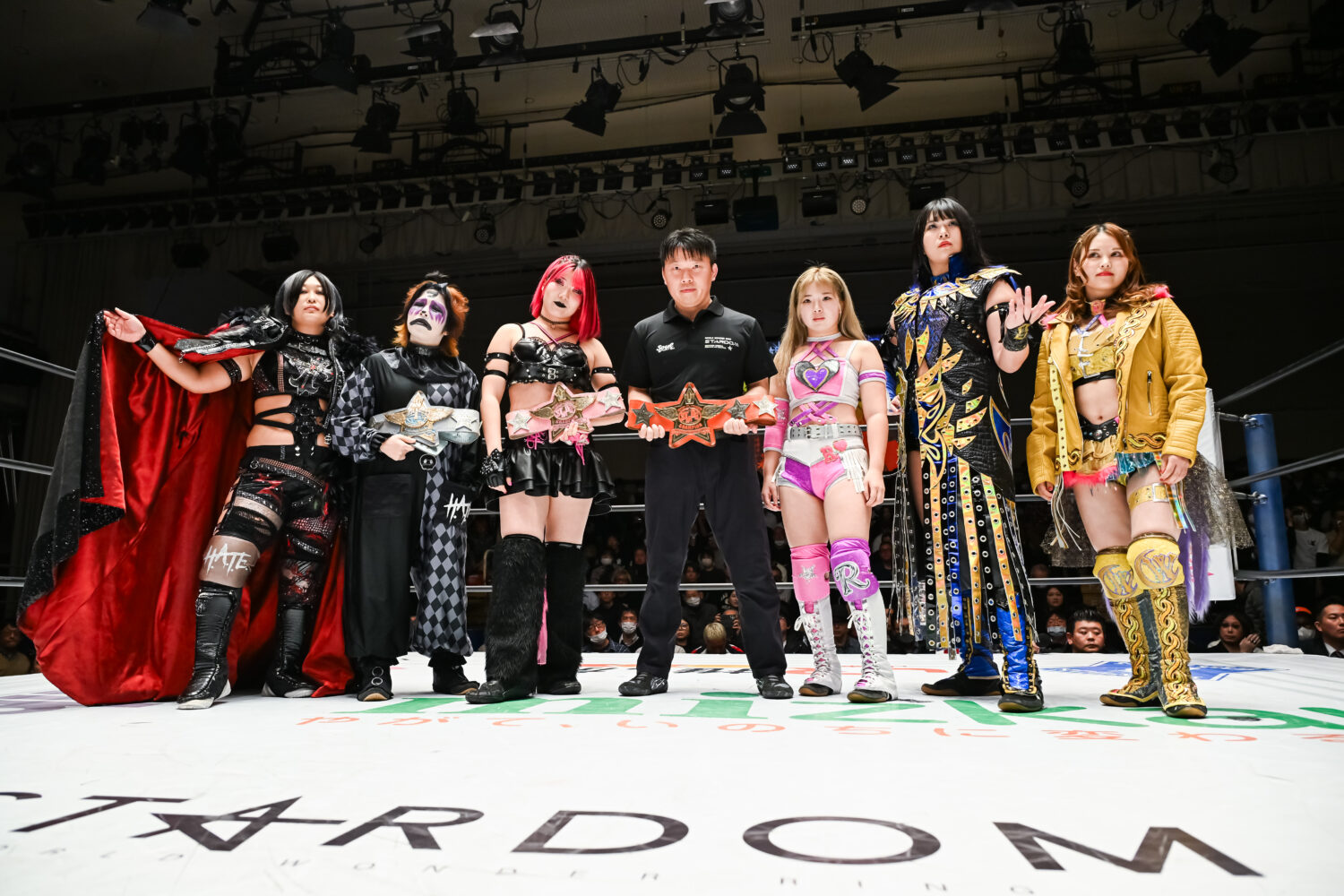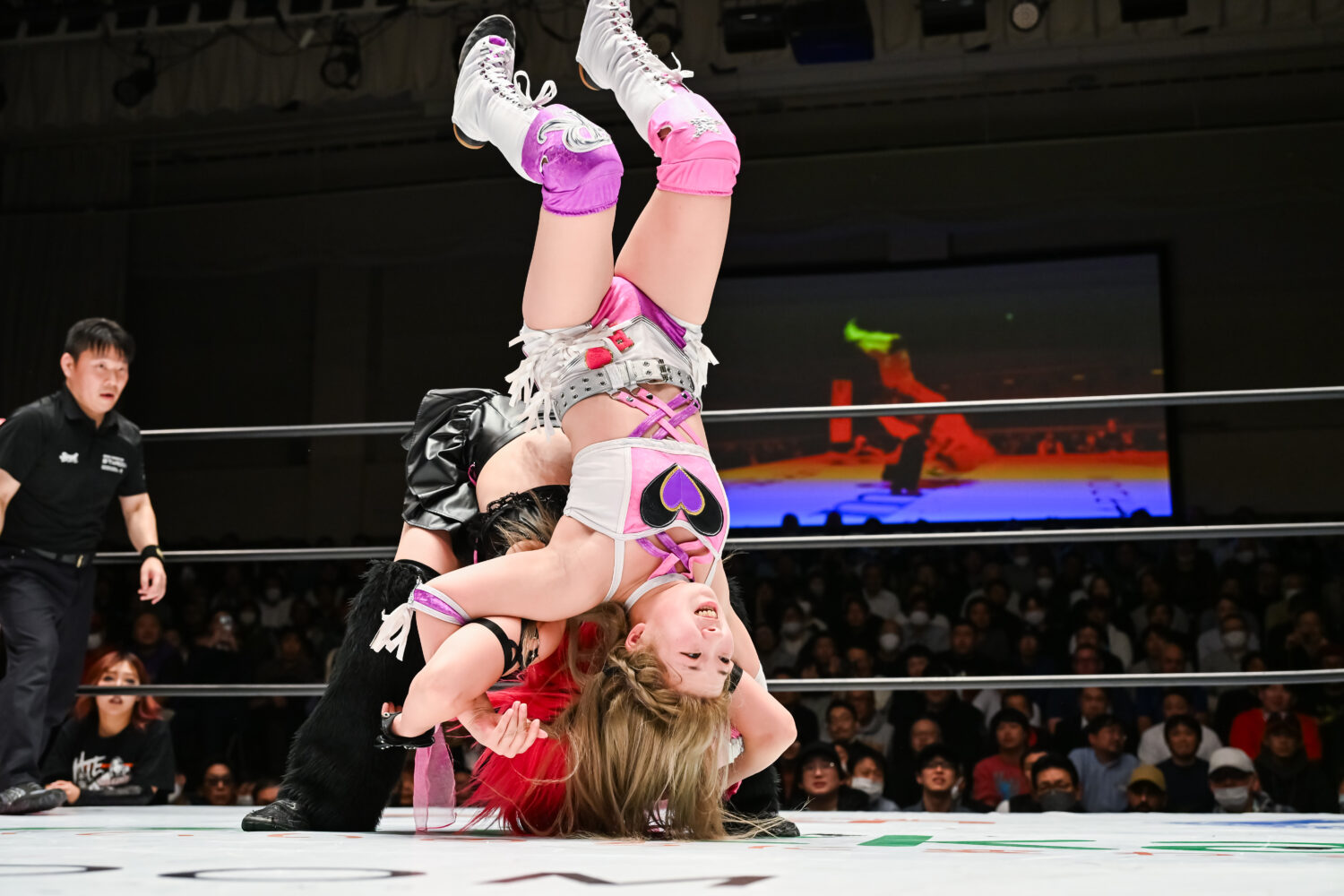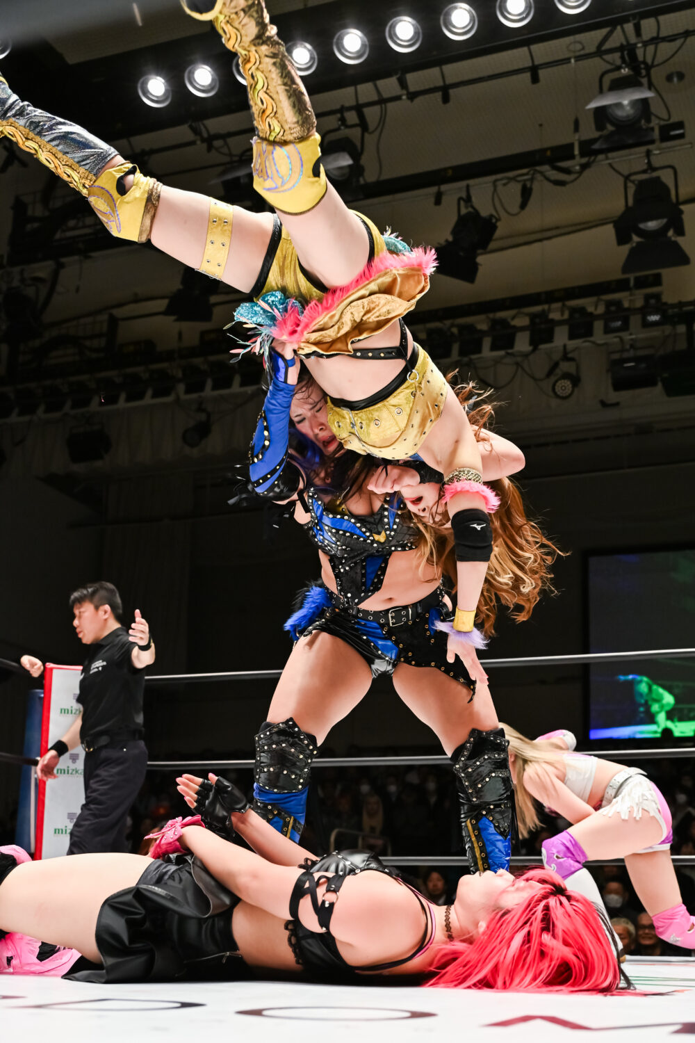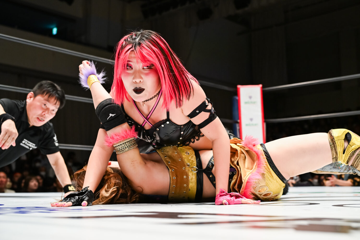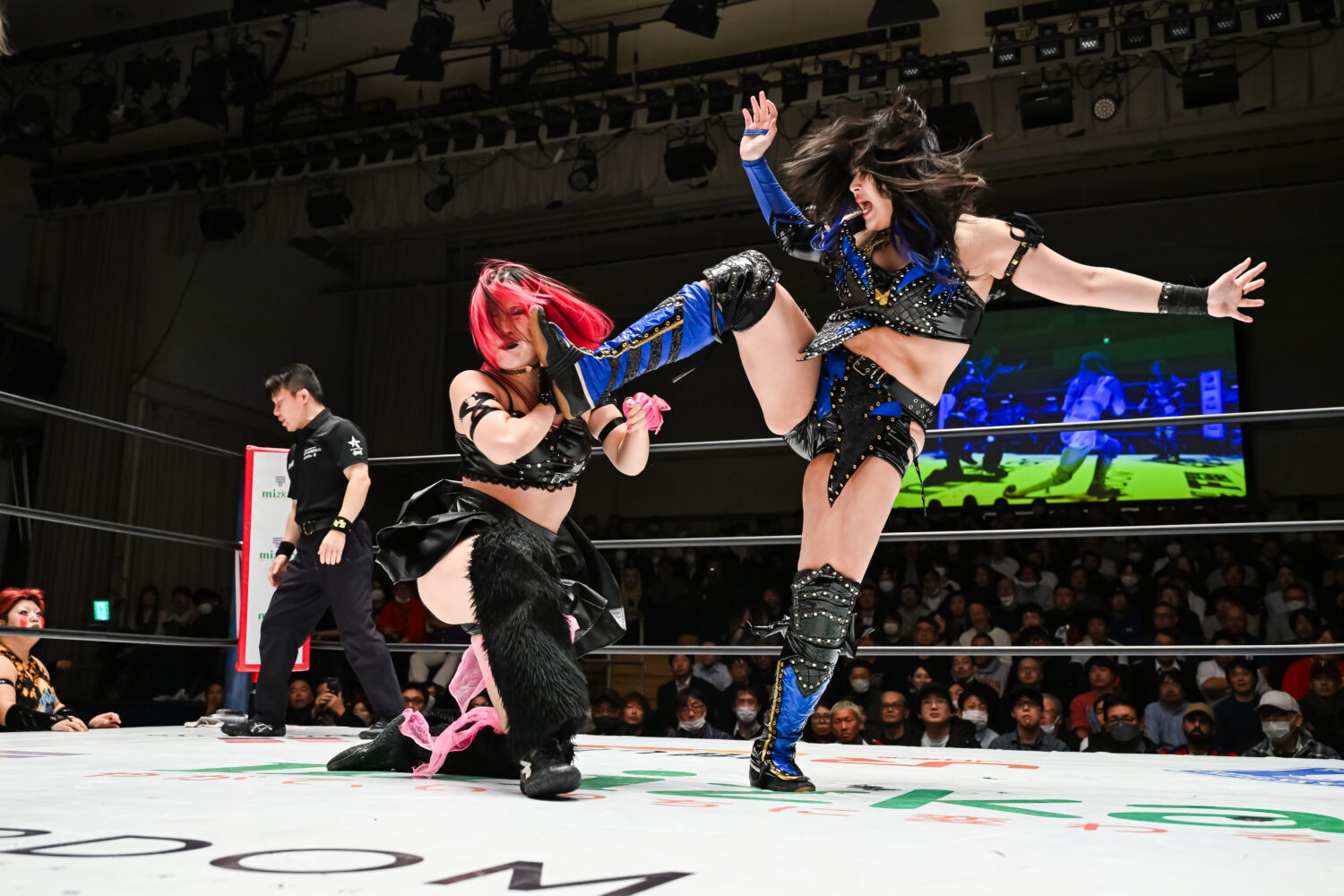 「いくぞ!」と月山が号令をかけて突進、H.A.T.E.を場外に出して月山と梨杏がプランチャで飛ぶ。HANAKOが吏南をリングに戻し、トリオで攻撃。HANAKOが月山をヒップドロップで落とし、梨杏がその場跳びボディープレス。梨杏が走るとセコンドのナツコが足を引き、場外戦へ。吏南が梨杏をリングに入れてヘアーホイップ、顔面を踏みつける。小波とフキゲンも梨杏の顔面を踏みつけていく。梨杏のエルボー連打を小波が受けて立つ。小波は梨杏にサッカーボールキック、片足でカバー。フキゲンが梨杏の鼻をつまんで攻撃。コーナーに追い込まれた梨杏が、いつもより早いタイミングでフキゲンにドロップキック。HANAKOが次々とショルダータックル、フキゲンにアルゼンチンバックブリーカー。吏南がカットするが、HANAKOがまとめて串刺しボディーアタック、まとめてドロップキック。フキゲンのサミングをHANAKOが阻止してエルボー。HANAKOの突進をフキゲンがかわして吏南と連係攻撃、小波がスライディングキック。小波はHANAKOに飛びつき腕十字。HANAKOがリフトアップしてブレーンバスターへ。小波が起き上がりバックキック、HANAKOがカウンターでビッグブーツ。小波がHANAKOにスリーパー、バックを取るとフキゲンもその後ろへ。HANAKOが切り返すがフキゲンと小波でキック、ダブルでジャーマンを決める。小波はPKも、2カウント。HANAKOが小波を持ち上げてバックドロップ。小波はカウンターでハイキック、HANAKOがショルダータックル。月山が控えの吏南を落としてから小波に串刺しヒップアタック、ドロップキック。小波がヒップアタックをかわして臀部にミドルキック、PK。吏南が月山にビッグブーツ、ドロップキック。月山が返して10分経過。吏南のビッグブーツを月山がキャッチし、突進を丸め込む。月山は丸め込みの連続で吏南を追い込む。月山の突進を小波が妨害して吏南が丸め込み。梨杏が吏南にドロップキック連打。ボディースラム狙いを吏南がこらえる。しかし、梨杏がボディースラム成功。吏南が返すと、梨杏が串刺しで突進。吏南がかわしてH.A.T.E.が串刺し攻撃の連続。吏南がダイビングダブルニードロップ。梨杏が返すと、吏南が卍固めでグラウンドへ。さらにアームブリーカーからコーナーへ。HANAKOと月山が止めると、吏南がコーナーから「来いよ」と挑発。梨杏はコーナーから雪崩式ネックブリーカー。フィッシャーマンも決めるが、カットされる。