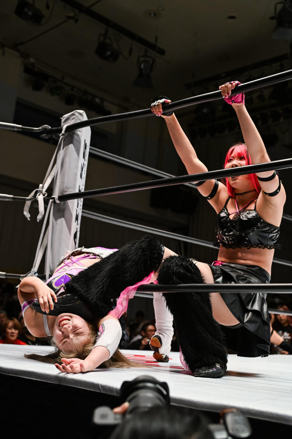 梨杏が飛びつくが、吏南が切り返して払い腰、H.A.T.E.が連続攻撃、吏南がハイドレンジア。しかし、月山がカットして15分経過。吏南がノーザンライトも、梨杏が返す。吏南はダイビングダブルニードロップを決めるが、なんとか梨杏の肩が上がる。吏南が引き起こしてピンクデビルの構えからジャックナイフ、梨杏が反転。吏南が返すとピンクデビル。しかし、HANAKOと月山がカット。大の字の梨杏を引き起こした吏南だが、梨杏が丸め込む。梨杏がフェースクラッシャー、月山とHANAKOが合体、そして梨杏がねらいすまして飛びつきハナグルマ。しかし、吏南が返してみせる。小波がミサイルキックも梨杏がかわして誤爆。HANAKOがラリアットでフキゲンと小波を場外へ。梨杏が飛び乗りハナグルマ、しかしギリギリで返される。梨杏が吏南にフィッシャーマン狙い。20分経過、吏南がビッグブーツ。トリオで合体フェースクラッシャー。梨杏が返すと、吏南は「終わりだ!」とハイドレンジア。しかし、HANAKOがカット。吏南が梨杏にハイドレンジア。梨杏がギブアップし、吏南の勝利となった。