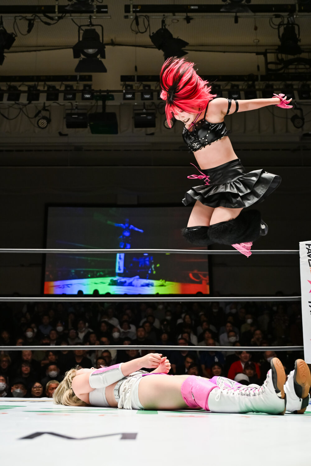 HANAKO「梨杏はよく強くなりたいって言うけど、強くなるって簡単なことじゃないから、舞華もジーナも帰ってきて、もっともっとE neXus Vは上をめざさなあかんねん。そのためには、梨杏が個人でもっと強くならないとあかんと思う。私は、梨杏の強さ、もっと引き出したいって思う。梨杏がマイクでベルトあきらめへんって言ってたけど、もちろんあきらめてへんわ。このフューチャー懸けて私と闘わへんか?」