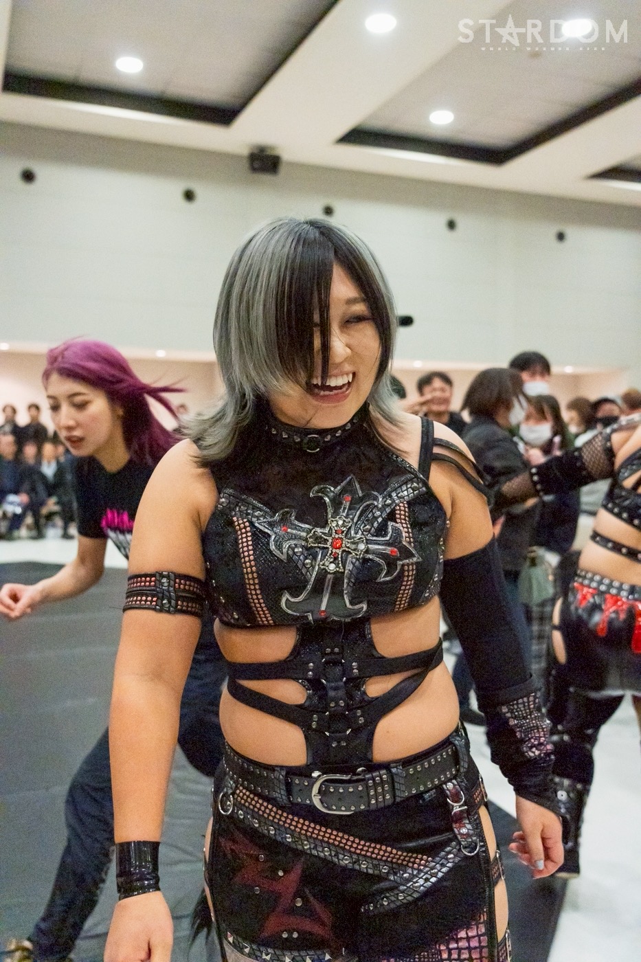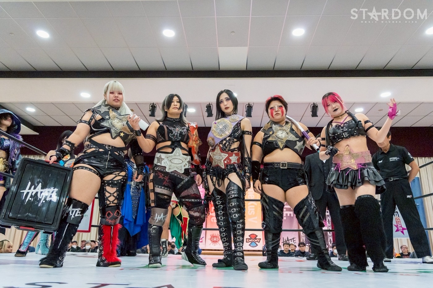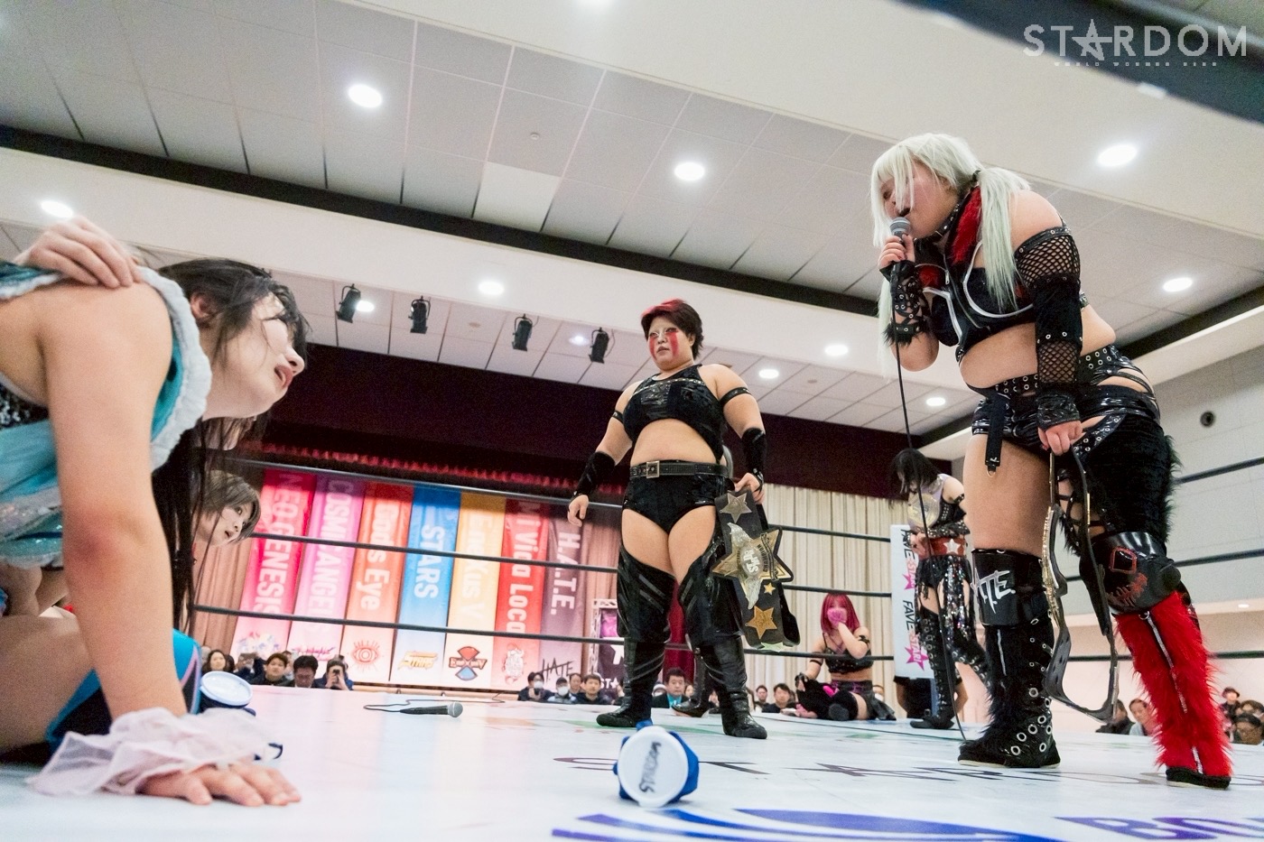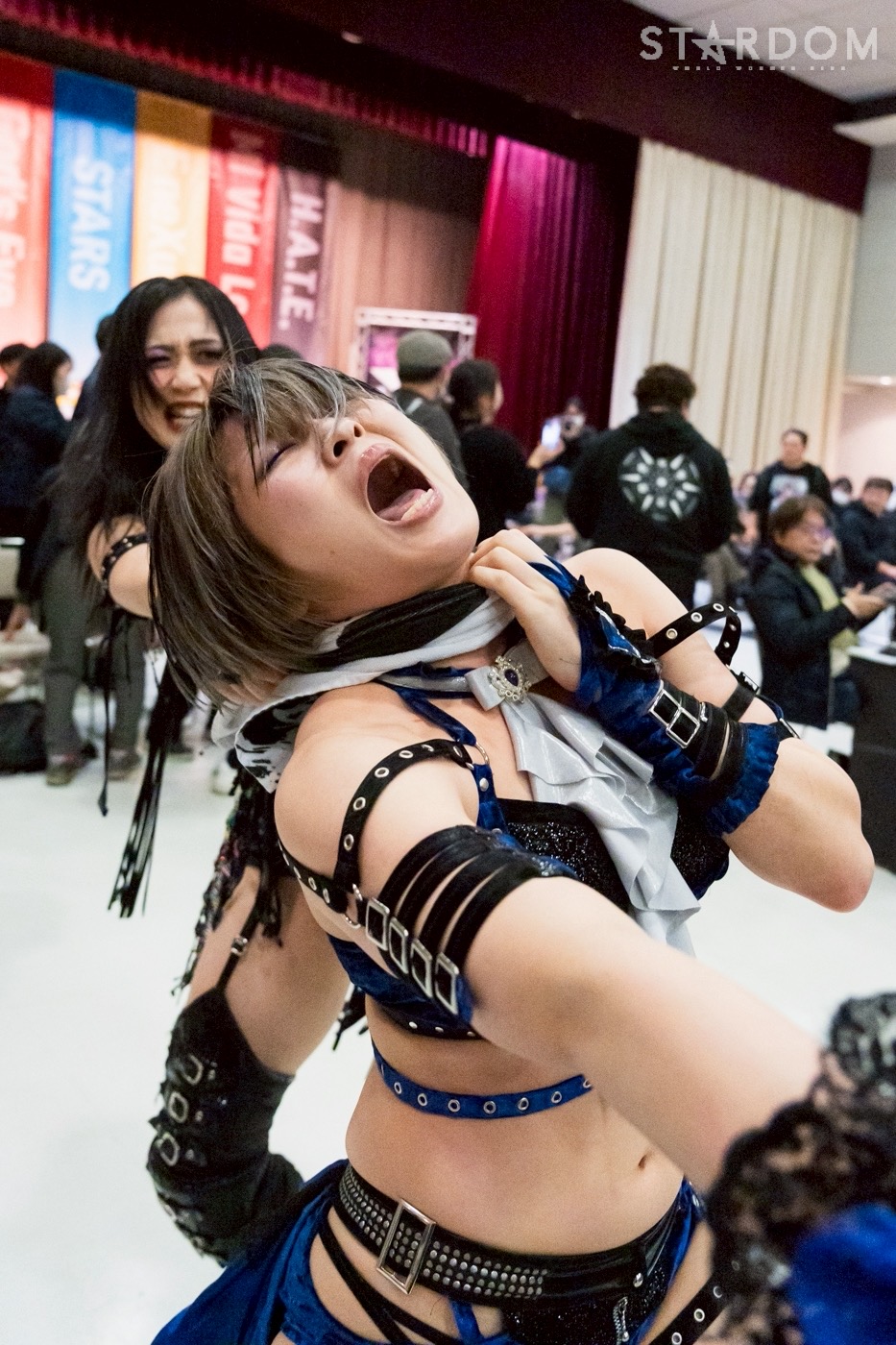来年もスターダムはH.A.T.E.が支配するってことだよね。そういえば2月にH.A.T.E.でイベントするから、ここの人たちは田舎すぎて遠いかもしれないけど。田舎者もがんばって東京に来てもらって、2月のイベントもよろしく、以上!」