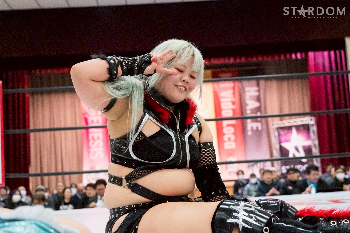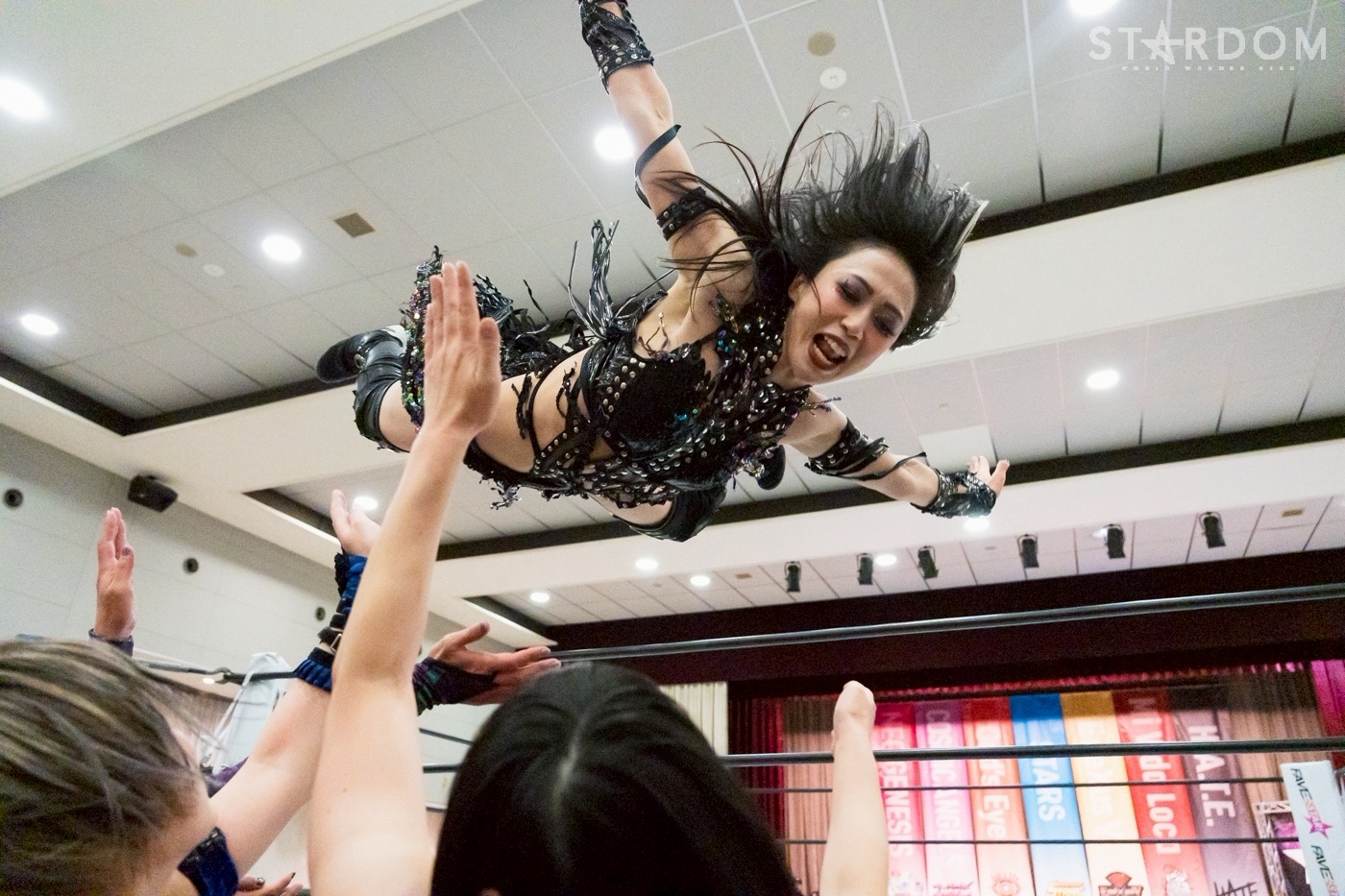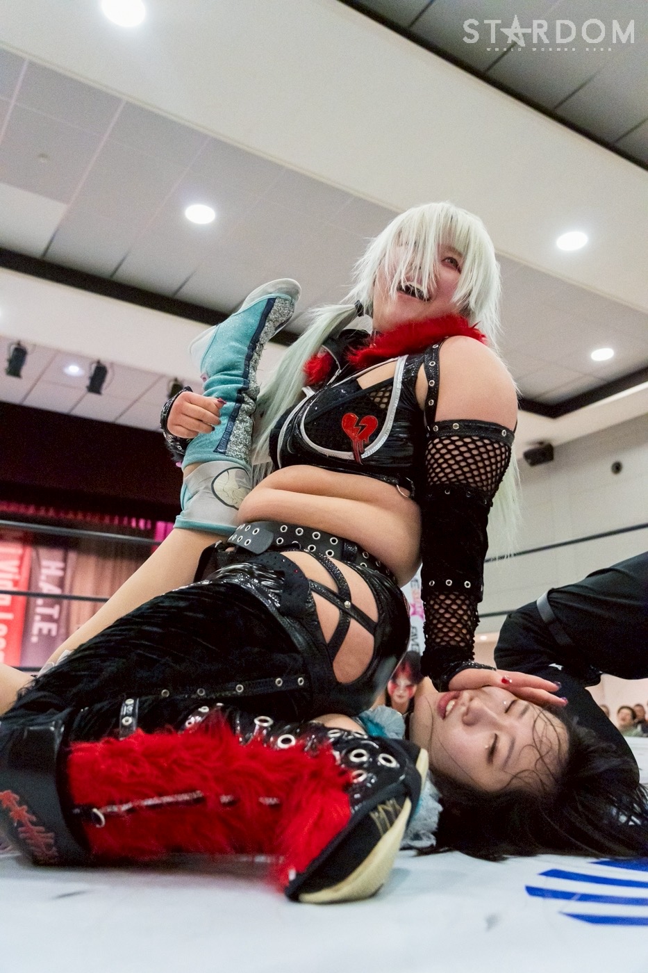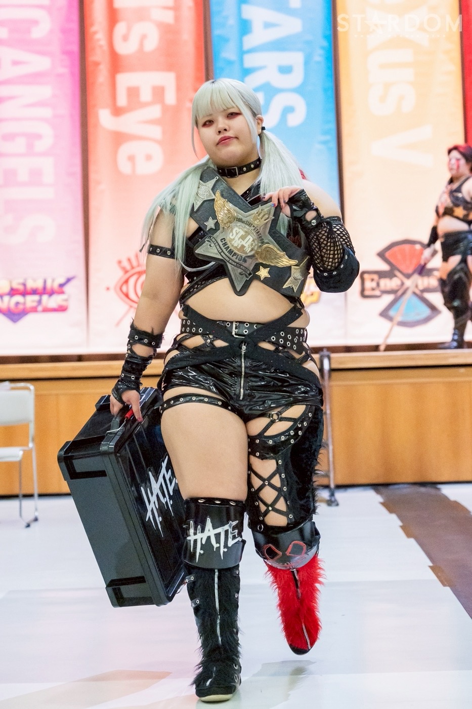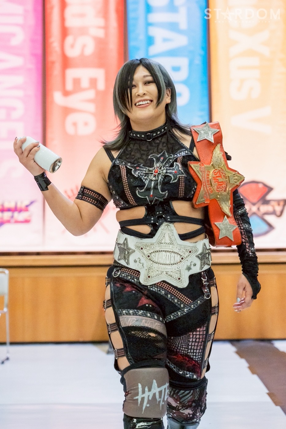 来年もスターダムはH.A.T.E.が支配するってことだよね。そういえば2月にH.A.T.E.でイベントするから、ここの人たちは田舎すぎて遠いかもしれないけど。田舎者もがんばって東京に来てもらって、2月のイベントもよろしく、以上!」