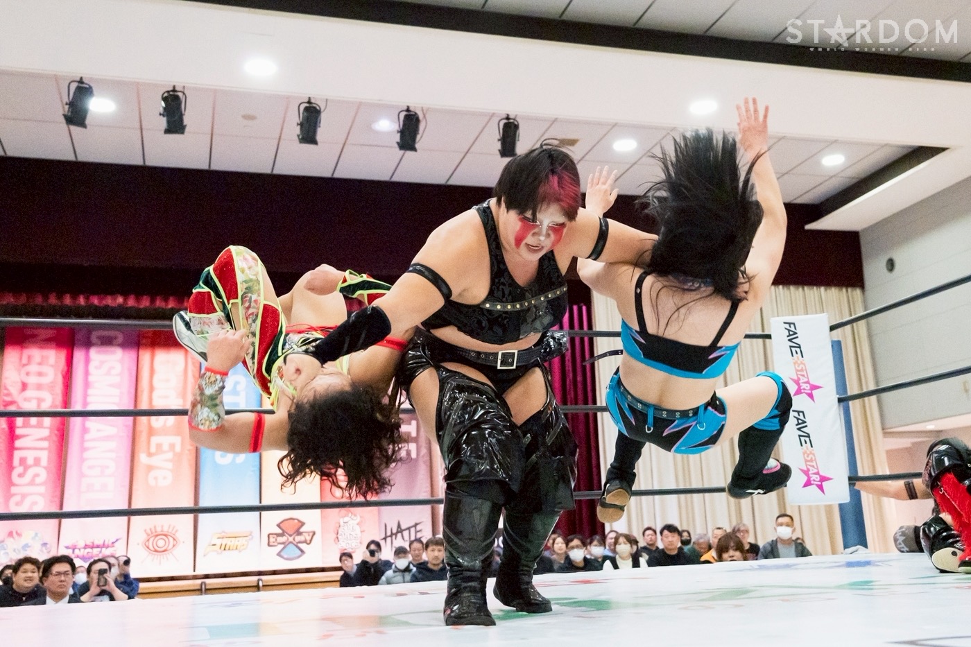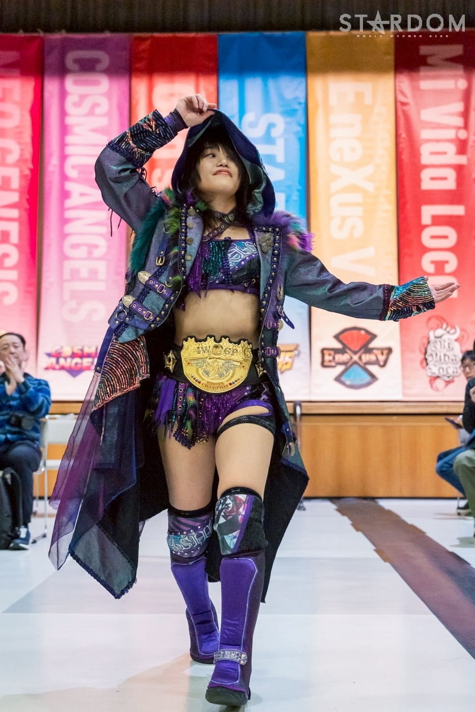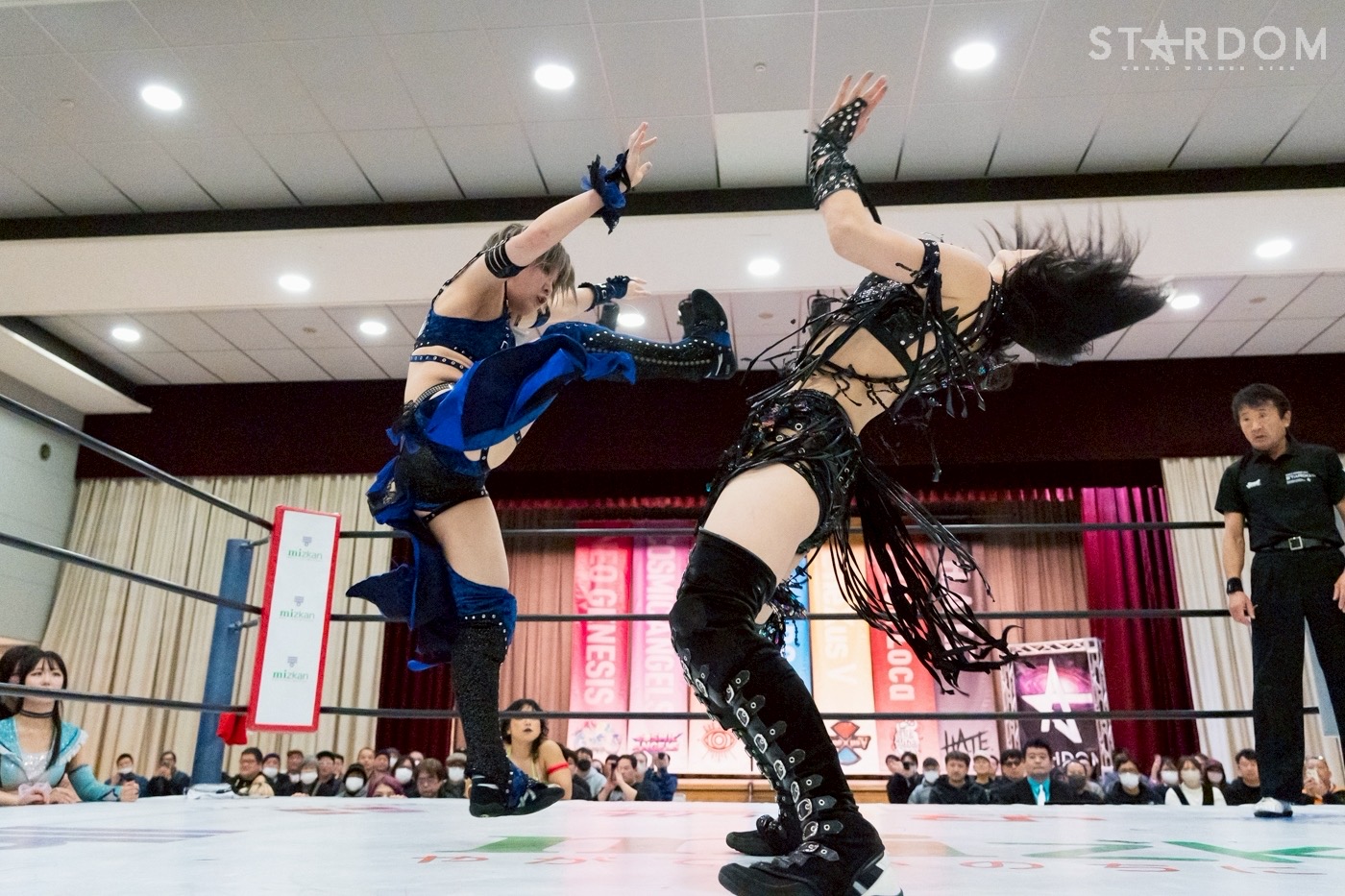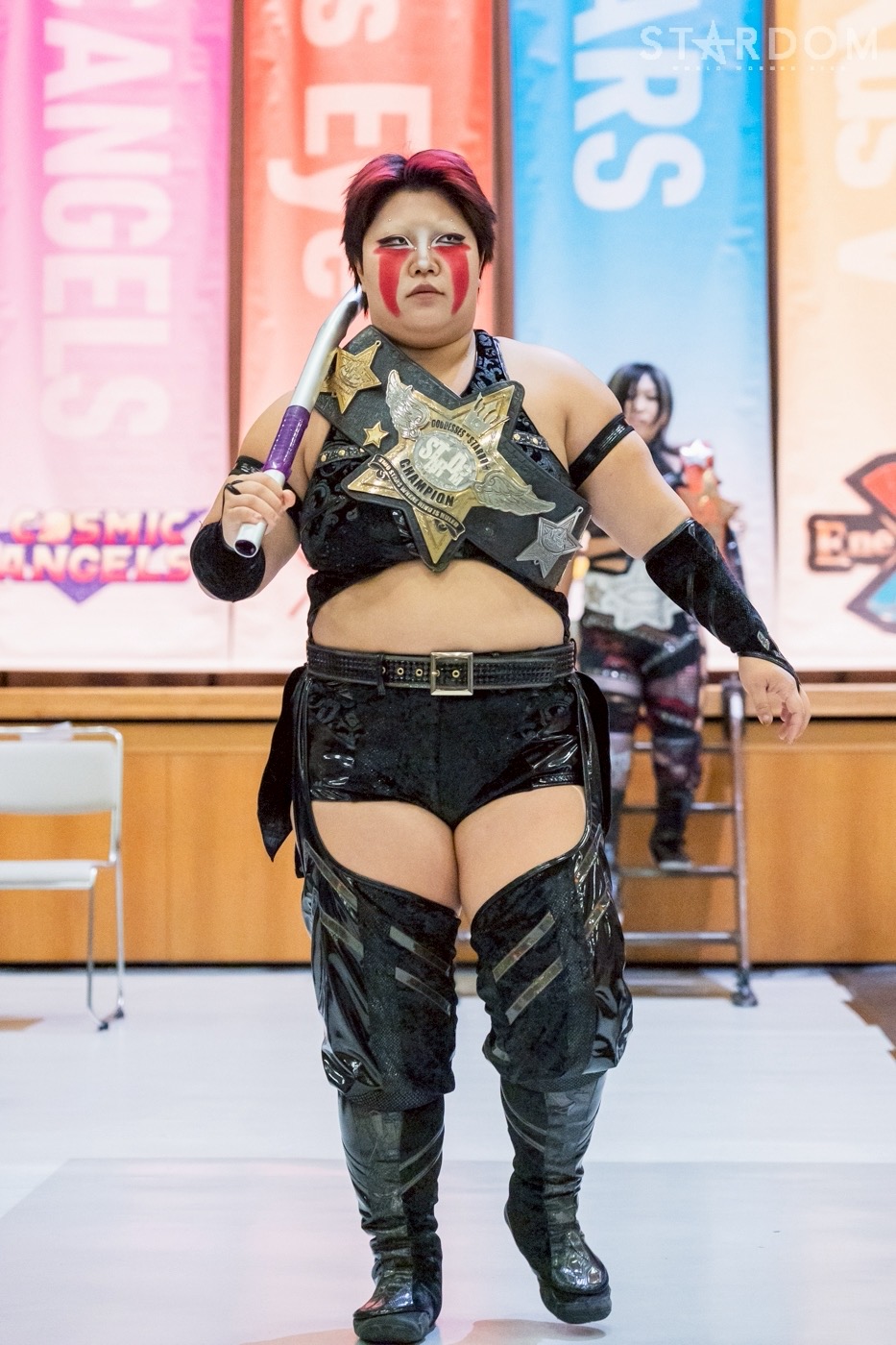 来年もスターダムはH.A.T.E.が支配するってことだよね。そういえば2月にH.A.T.E.でイベントするから、ここの人たちは田舎すぎて遠いかもしれないけど。田舎者もがんばって東京に来てもらって、2月のイベントもよろしく、以上!」