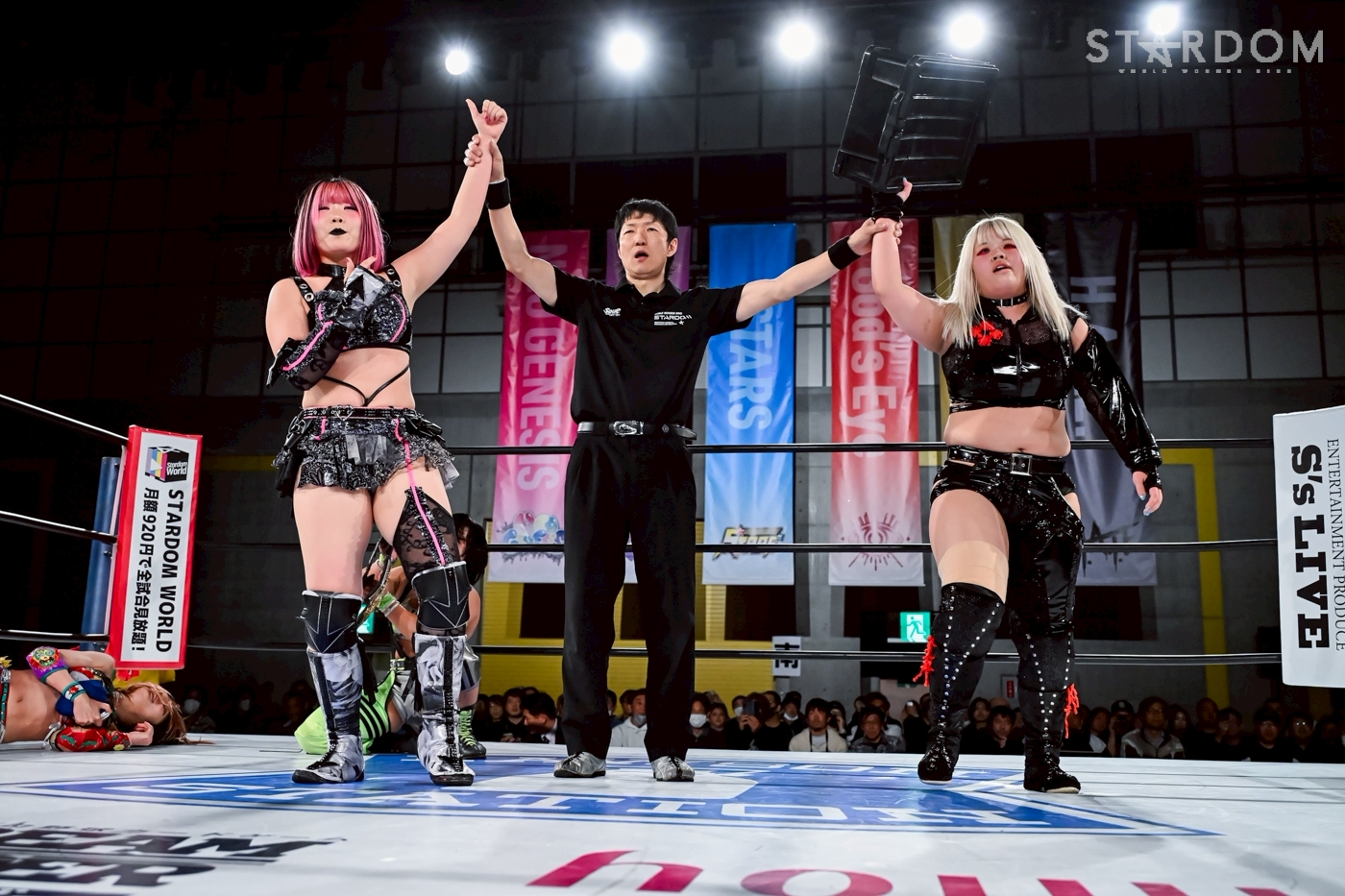 向後と吏南の先発でスタート。吏南がヘッドロック、向後がロープに振るが、吏南がロープワークを拒否して背中を踏みつける。吏南がエルボー、向後がかいくぐりドロップキック。向後が走ると、琉悪夏が妨害。吏南と合体してダブルのドロップキックを見舞う。向後が返すと、吏南がヘアーホイップの連続、「なにがSTARSだ、このクソヤロー!」とコーナーに追い詰め顔面を踏みつける。琉悪夏が串刺しボディーアタックから片足でカバー。向後が返すと、琉悪夏がショルダータックル、再度片足でカバーする。吏南が向後のエルボー連打を受けて立ち、ビッグブーツ。吏南の突進に向後がドロップキックを打ち込む。飯田が入り、吏南に逆水平連打。琉悪夏が乱入するが、飯田が突進をかわし、まとめて串刺し逆水平を連打する。飯田はさらに、吏南にジャンピングチョップ。吏南が返すと、飯田をロープに追い込み「このクソゴリラ!」とビッグブーツ、ドロップキック、ムチで殴打。琉悪夏と飯田がショルダーをぶつけ合う。飯田が逆水平、琉悪夏がショルダータックル。飯田がショルダータックルをやり返し、バックエルボー。向後がスワンダイブ式ドロップキック、619。琉悪夏がかわすが、向後は変型卍固め。琉悪夏がエスケープして、カウンターのショルダータックル、セントーン。向後が返すと、琉悪夏はフィッシャーマンの構え。飯田がラリアットでカットし、向後が619、飯田がバックエルボー、向後がダイビングボディープレス。返した琉悪夏に向後は桃絞り100%。しかし、吏南がカットする。向後は琉悪夏を引き起こし、ネクターピーチ狙い。琉悪夏がこらえてフェイント付きエルボー。向後がかいくぐるが、吏南が場外から足を引き、琉悪夏がクロスボディー。フィッシャーマンを切り返して向後が丸め込むが、カットされる。吏南が飯田に払い腰で分断、向後がトラースキックも、琉悪夏がラリアット。向後が返すと、吏南のダイビングダブルニードロップから琉悪夏が冷凍庫爆弾を投下。3カウントが入り、琉悪夏が向後を破ってみせた。