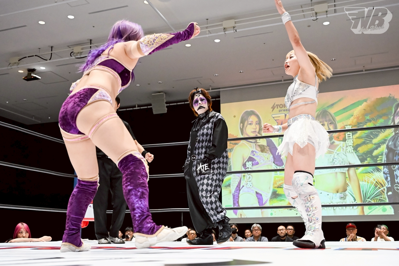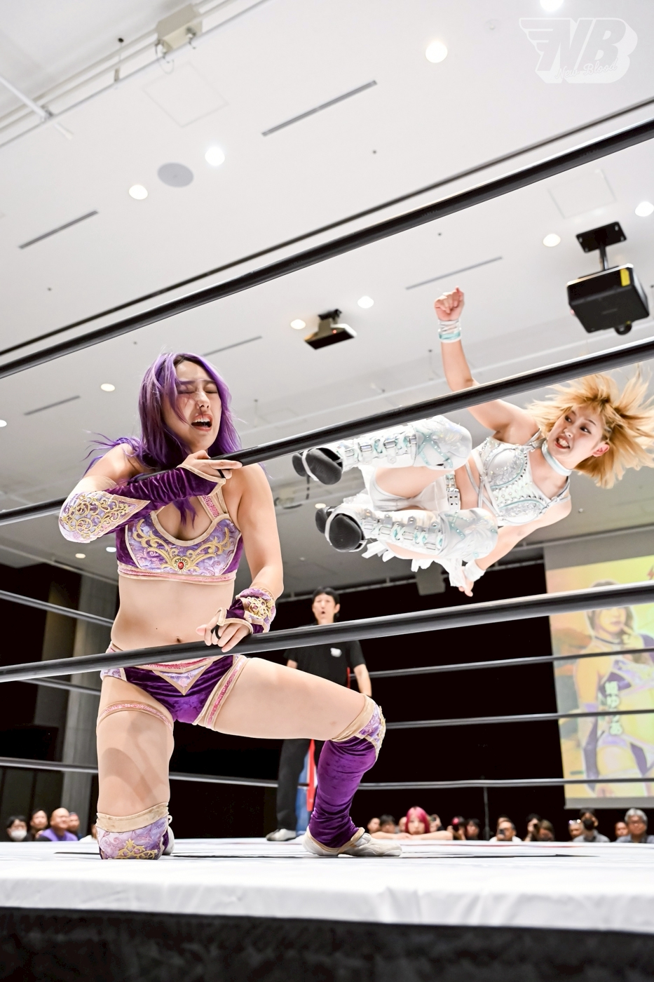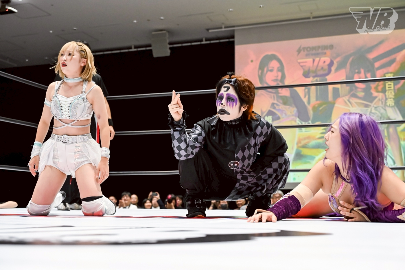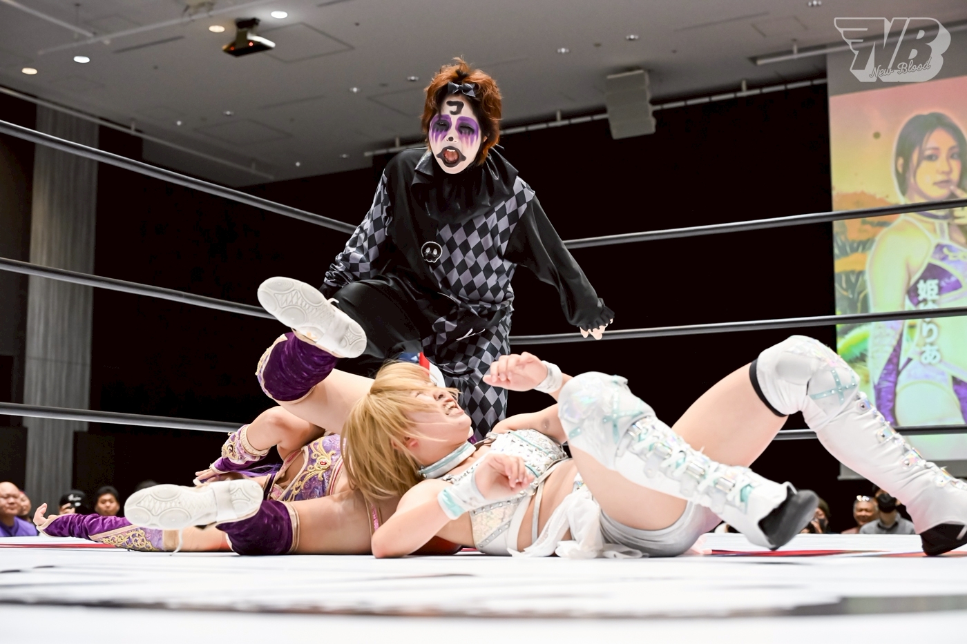 真白が手を上げて挑発、マットに寝そべりゆりあを挑発するが、フキゲンが踏みつける。フキゲンが喫煙ポーズにいくと、真白が妨害。真白とゆりあがダブルでドロップキック。真白がゆりあとロープワークの攻防。真白がアームホイップからドロップキック。真白が投げるぞと予告、ゆりあが抵抗してボディースラムで叩きつけギロチン投下。真白が返すとゆりあが首4の字固め。ロープに追い込むが、真白がかわしてドロップキックを叩き込む。ゆりあが返すと真白がSTF。フキゲンがプロレス誌で2人を殴打。フキゲンは真白に向かっていくが、そのたびに足を出される。真白がフキゲンにやらせずドロップキック。しかし、ゆりあがカットする。ゆりあが真白のサミングを阻止、バックの取り合いにフキゲンが割って入ろうとするが、ゆりあがショルダータックル。真白がフキゲンにコンプリートショット、ドロップキック。真白はコーナーに上がってダイブ、フィッシャーマン。しかし、ゆりあがカットする。ゆりあのビッグブーツが真白にヒット、後方からも放つが、2カウント。ゆりあは首4の字固め。フキゲンがカット成功。ブレーンバスターを予告し、ゆりあも狙う。真白が割って入り、フキゲンと共闘。ゆりあはまとめてドロップキック、ミサイルキックを狙うと、フキゲンと真白がやり合う。フキゲンが真白をぶつけてゆりあをコーナーから落とす。真白が丸め込むとフキゲンが3カウントを奪われた。