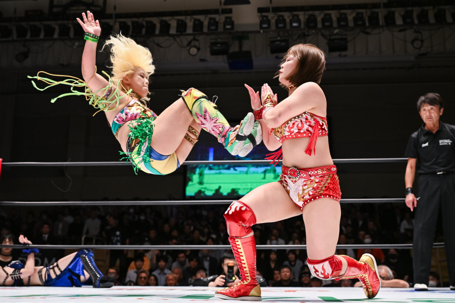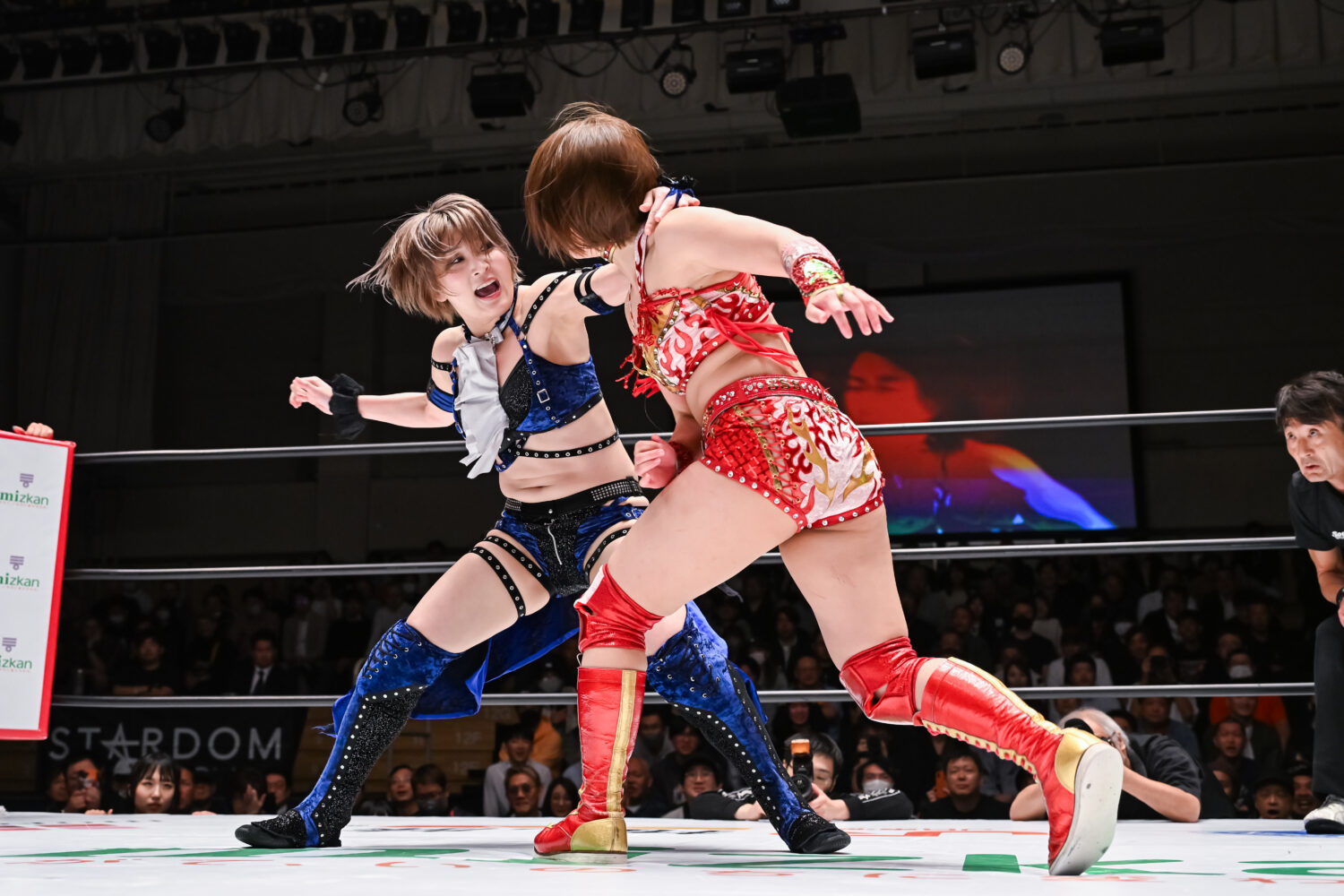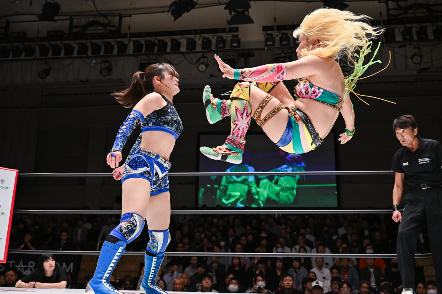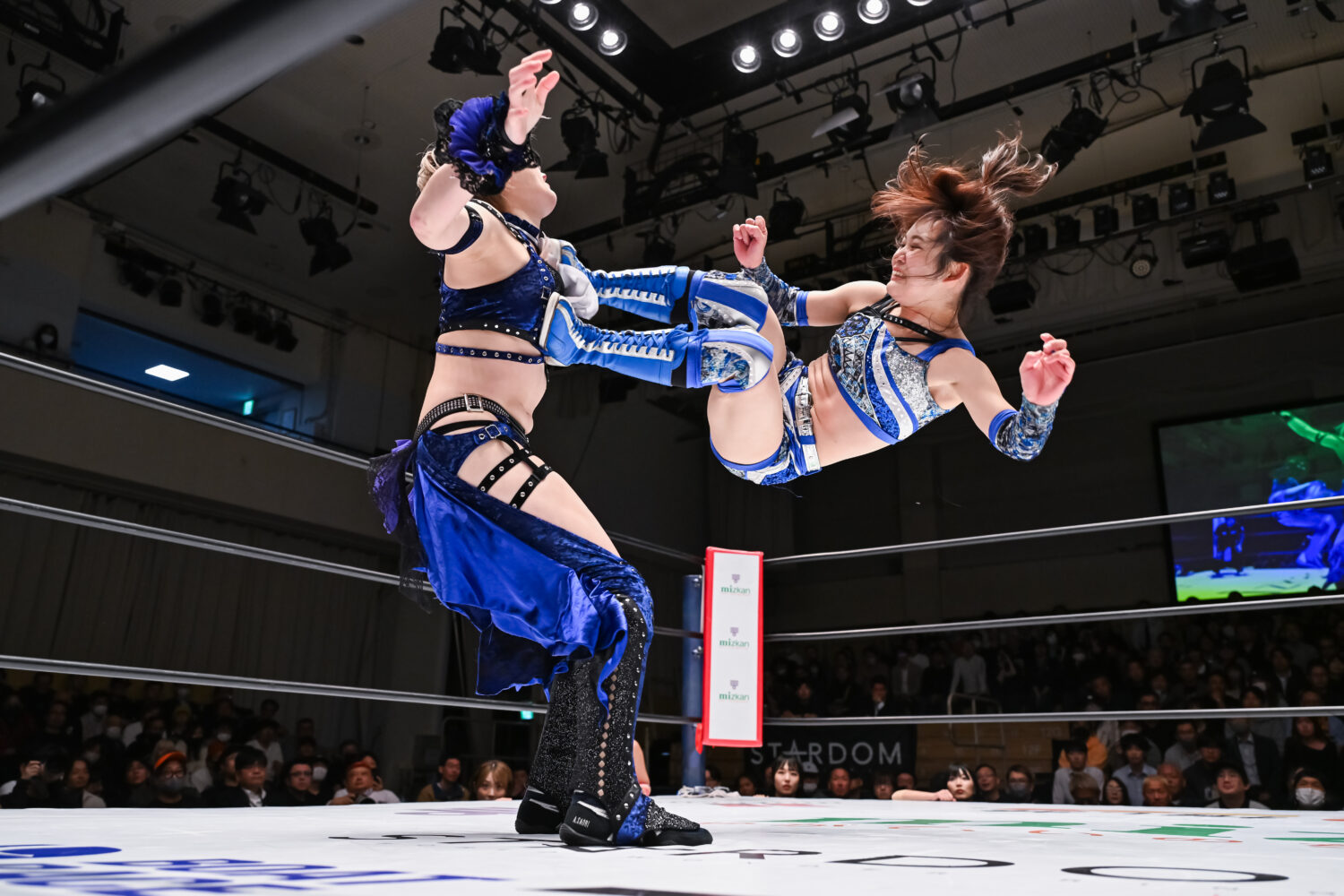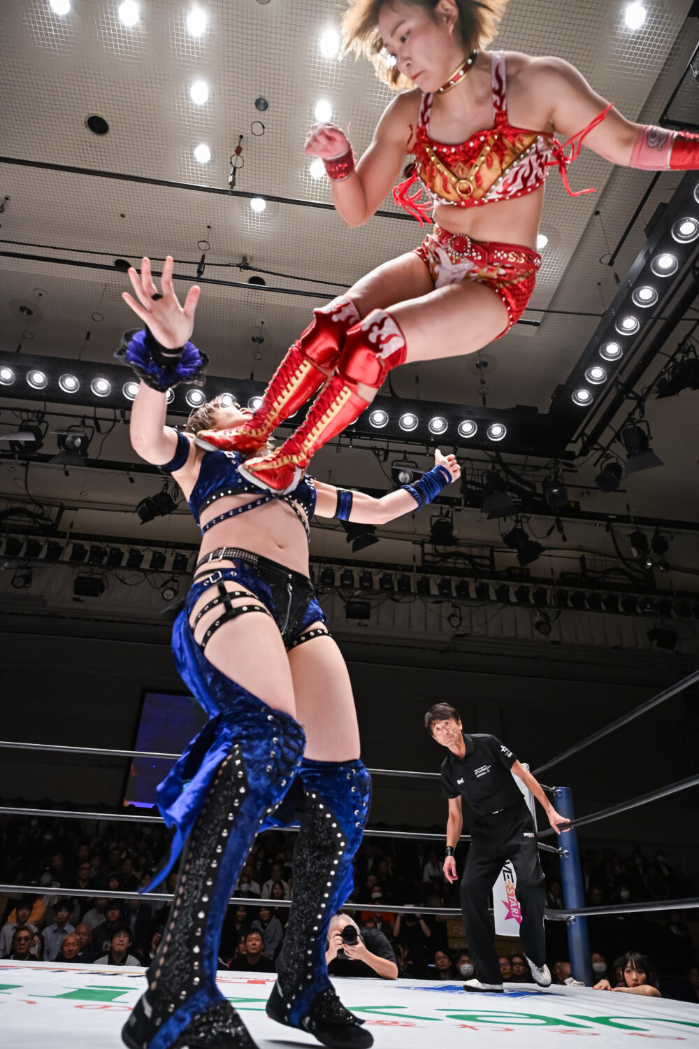 コズミックエンジェルズの安納サオリ&水森由菜組と、Sareee&叶ミク組によるタッグマッチ。朱里に敗れてIWGP女子王座を失ったSareeeは、前日のマリーゴールド両国に「大物S」として参戦し、翌日には再びスターダムへ。はたしてSareeeの目的とはなんなのか? 叶を従えてのこの試合で明らかになる?