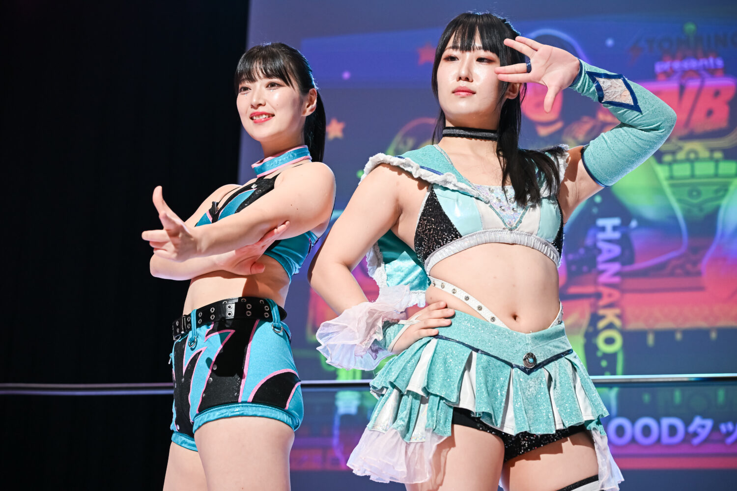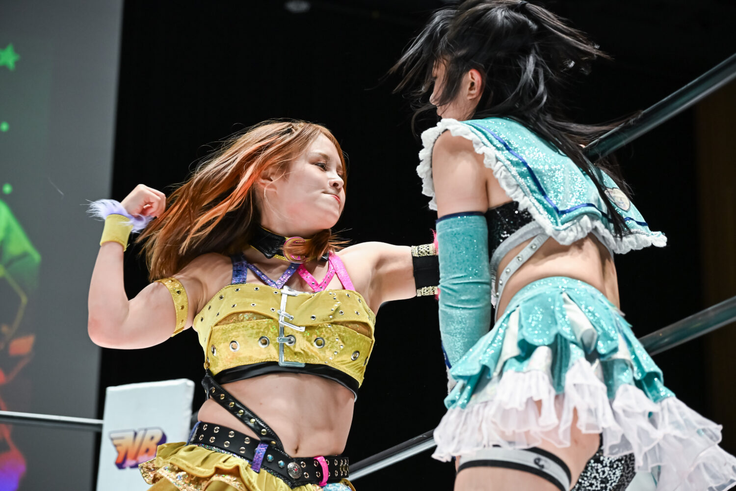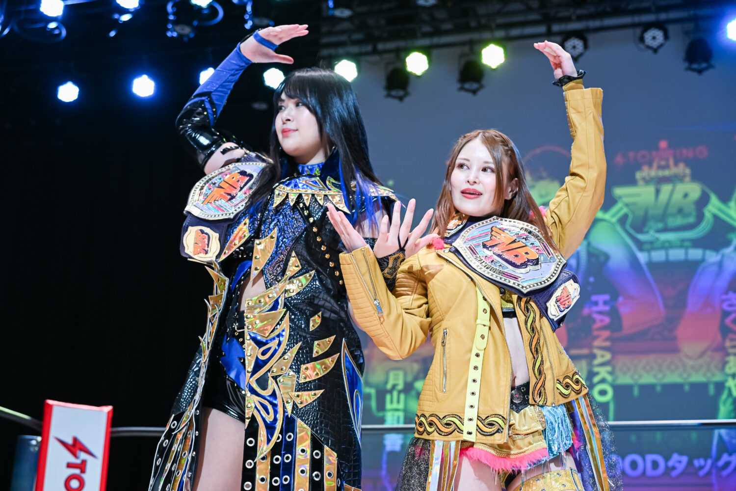 さくららのセコンドになつぽいと水森由菜がついてリングに迎え入れる。両軍がリング中央に歩を進めて睨み合い、HANAKOとさくらが視殺戦を展開。月山が先発に名乗りを挙げると玖麗が出てくる。腕の取り合いでスタートし、玖麗がヘッドロック。月山がロープに振るとラリアットをかわしてドロップキック。月山の突進をエプロンからさくらが妨害、玖麗がドロップキック。さくらは月山にサッカーボールキック、玖麗がチンロックでギブアップを迫り、キャメルクラッチへ移行する。月山がこらえると、玖麗はロープに固定して背中にドロップキック。月山が返すと、玖麗の突進にクロスボディー。HANAKOが玖麗へショルダータックル、出てきたさくらにも打ち込み、玖麗、さくらをボディースラム。玖麗が返すと、HANAKOは逆エビ固め。しかし、玖麗がエスケープ。月山が玖麗にヒップバット連打。玖麗が返すと、コーナーで反転してダイビングエルボーアタック。さくらが串刺しアタック、サッカーボールキックから三角絞めにもっていく。月山がエスケープすると、さくらがローキック、ボディースラム。玖麗が月山に串刺しドロップキック連打、エルボーアタック。月山が返すと、玖麗はスリーパーホールド。しかし、月山がロープに到達。月山が、玖麗のブレーンバスター狙いを切り返してエルボー連打。月山の突進に玖麗がエルボー、月山もエルボーからヒップアタック。HANAKOが玖麗へビッグブーツ、コーナーに追い込み串刺しボディーアタック。しかし、玖麗が肩を上げる。HANAKOがブレーンバスターを狙うと、玖麗がかわして飛びつきスリーパー。HANAKOがそのまま立ち上がりコーナーへ追い込む。玖麗が突進をかわして串刺しドロップキック。HANAKOがスピアをキャッチも、さくらのアシストから玖麗が飛びつきスリーパー。HANAKOが立ち上がろうとするが、玖麗がグラウンドへ。HANAKOがなんとかロープへ到達。玖麗の突進にHANAKOがショルダータックル。ニードロップをかわして玖麗がバイオレットシューティング。さくらがHANAKOにドロップキック、ミドルキック連打。HANAKOがつかむが、さくらがバックを取る。HANAKOが振りほどくとさくらがエルボーで向かっていく。10分経過。エルボーの応酬からHANAKOが連打で倒してみせる。さくらが下から飛びついて三角絞め。HANAKOがリフトアップしコーナーに叩きつけ、串刺しで突進。さくらがかわして玖麗がドロップキック、さくらがダイビングニーアタック。HANAKOが返すと、さくらが引き起こしてローキック、キックのコンビネーションから突進、HANAKOが止めてボディースラム、月山がクロスボディー、HANAKOがその場跳びボディープレス。さくらが返すと、HANAKOが月山を落とす。玖麗のアシストからさくらがロープを引いてHANAKOを場外に落とし、さくらと玖麗が場外に飛ぶ。HANAKOがリング下でさくらにブレーンバスター。月山がコーナーから場外プランチャで舞う。HANAKOが月山を持ち上げ、もう一度さくらに落とす。さくらが返すと、HANAKOはフィニッシュを宣言して、アルゼンチン。JPコースターコースターにいこうとするが、さくらが丸め込みの連続。サクラっちに丸め込むが月山がカット。HANAKOがさくらの突進にラリアット。さくらが返すと15分経過。HANAKOがさくらにアルゼンチン、さくらが切り返してバックを取る。エルボーが交錯し、さくらがかいくぐると玖麗がミサイルキック、玖麗もミサイルキック。しかしHANAKOが返してみせる。さくらは、HANAKOに蹴りのコンビネーション、顔面に叩き込むが月山がカバーをカット。さくらがHANAKOを引き起こし、バックを取る。HANAKOがこらえるが玖麗がスピア、反動を利用してさくらがジャーマン。しかし、2カウントどまり。残り3分。さくらが変型ジャーマンでホールド。3カウントが入り、さくらがHANAKOをピンフォール。NBタッグが移動した。