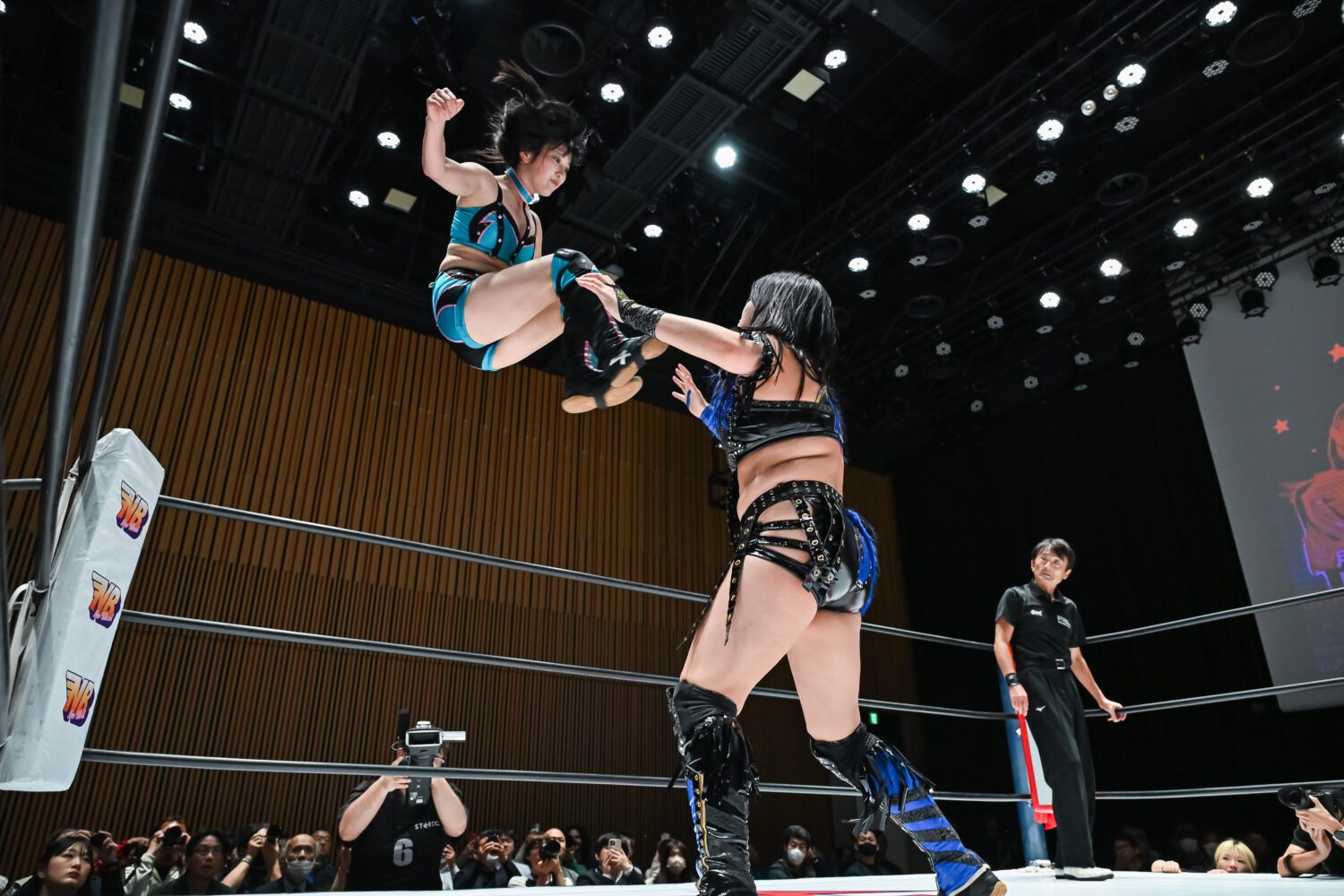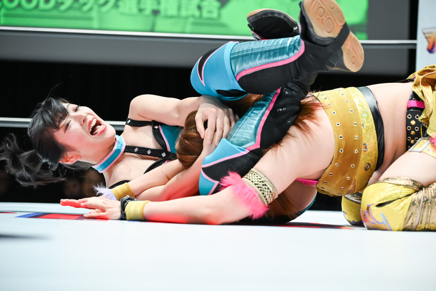 E neXus Vのライス・オア・ブレッド、月山和香&HANAKO組がコズミックエンジェルズのさくらら、さくらあや&玖麗さやか組とNEW BLOODタッグ王座を懸けて対戦。王者組には5度目の防衛戦だ。3日前の後楽園大会では月山が星来芽依のハイスピード王座に挑戦もタイトル奪取ならず、2冠のチャンスを逃した。パートナーのHANAKOはフューチャー・オブ・スターダム王者との2冠であるが、2人揃っての2冠王はお預けになってしまった。それでも、NBタッグ王座は死守したいところ。挑戦者のさくら&玖麗組は満を持しての挑戦と言っていい状態。さくらは現在無冠ながら、元・仙女のジュニア王者であり、玖麗は今年のシンデレラ・トーナメント優勝者。この2人でベルトを巻き、NEW BLOODに新風景をもたらすことができるか、それとも王者組がさらなる長期政権を築くのか。今後のNBに大きな影響を与えるタッグ王座戦だ。