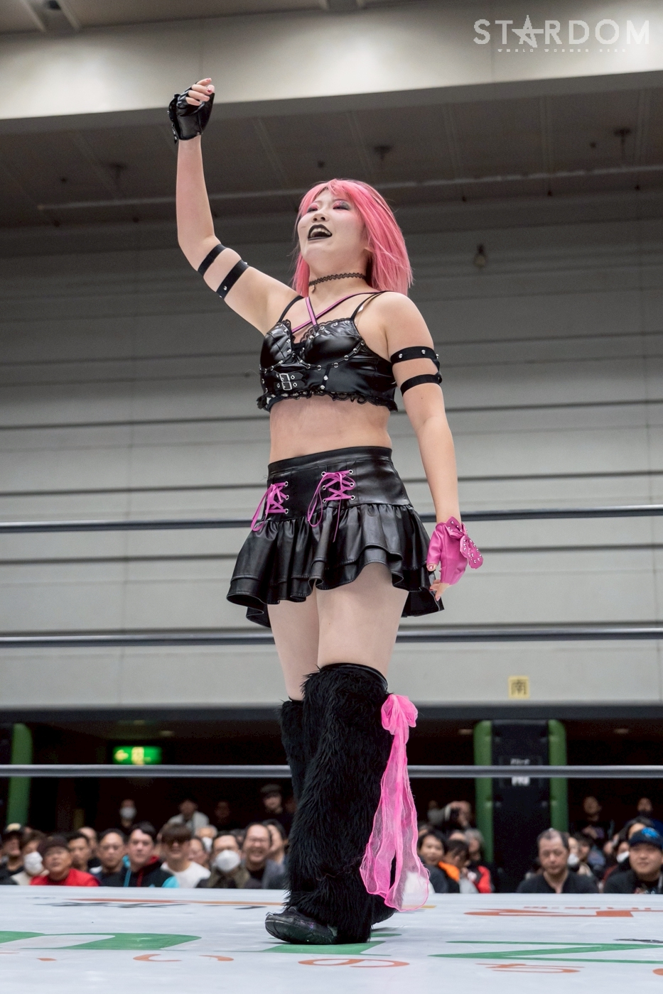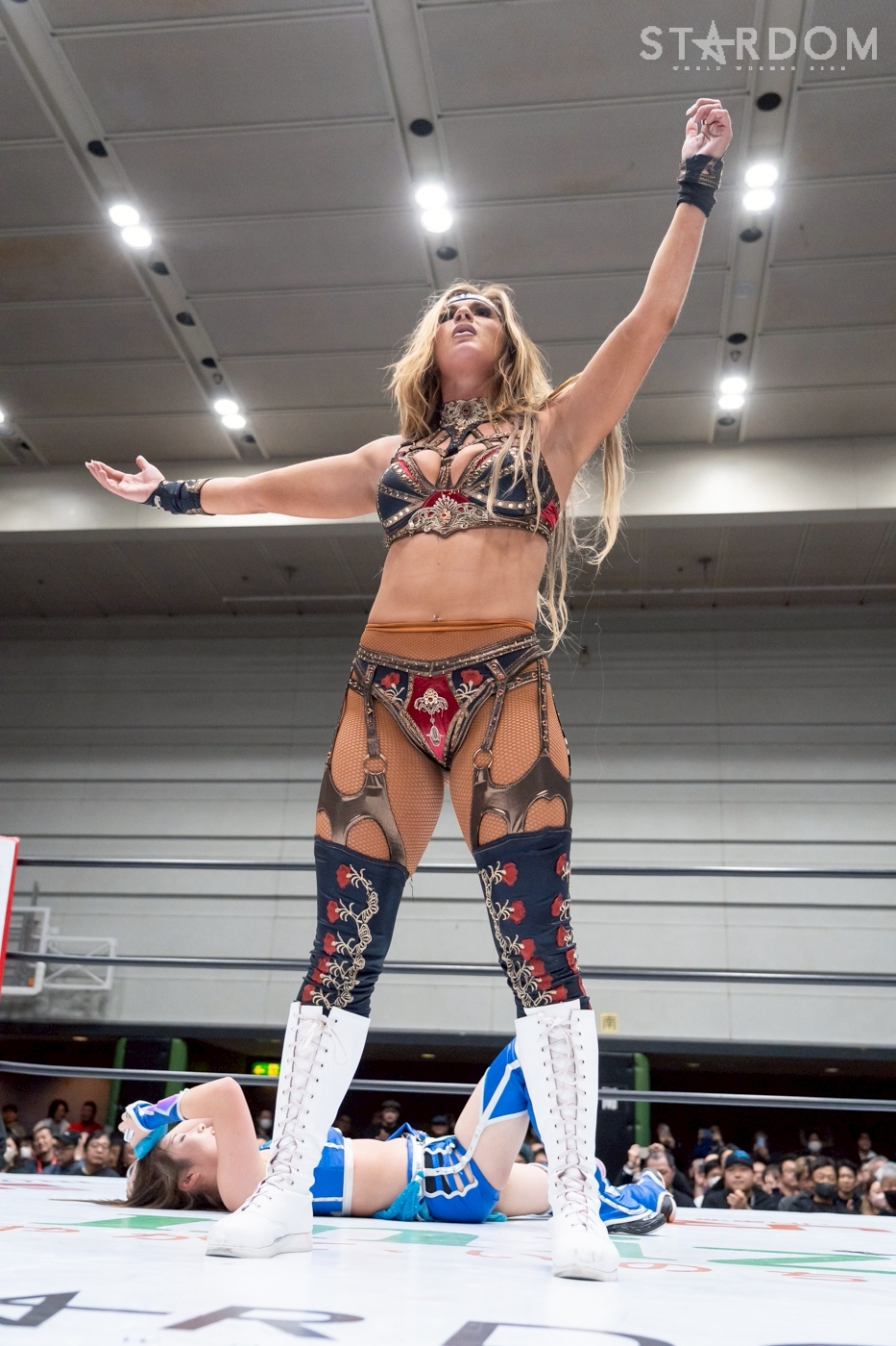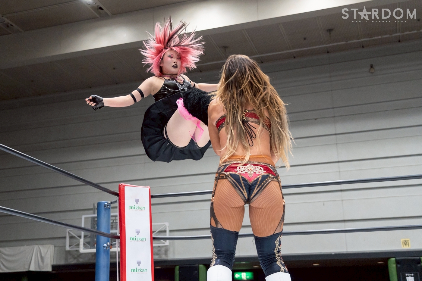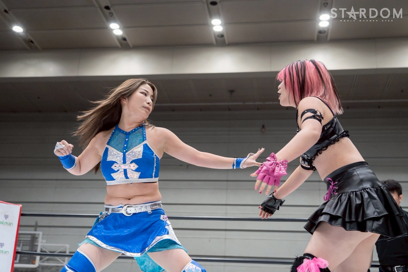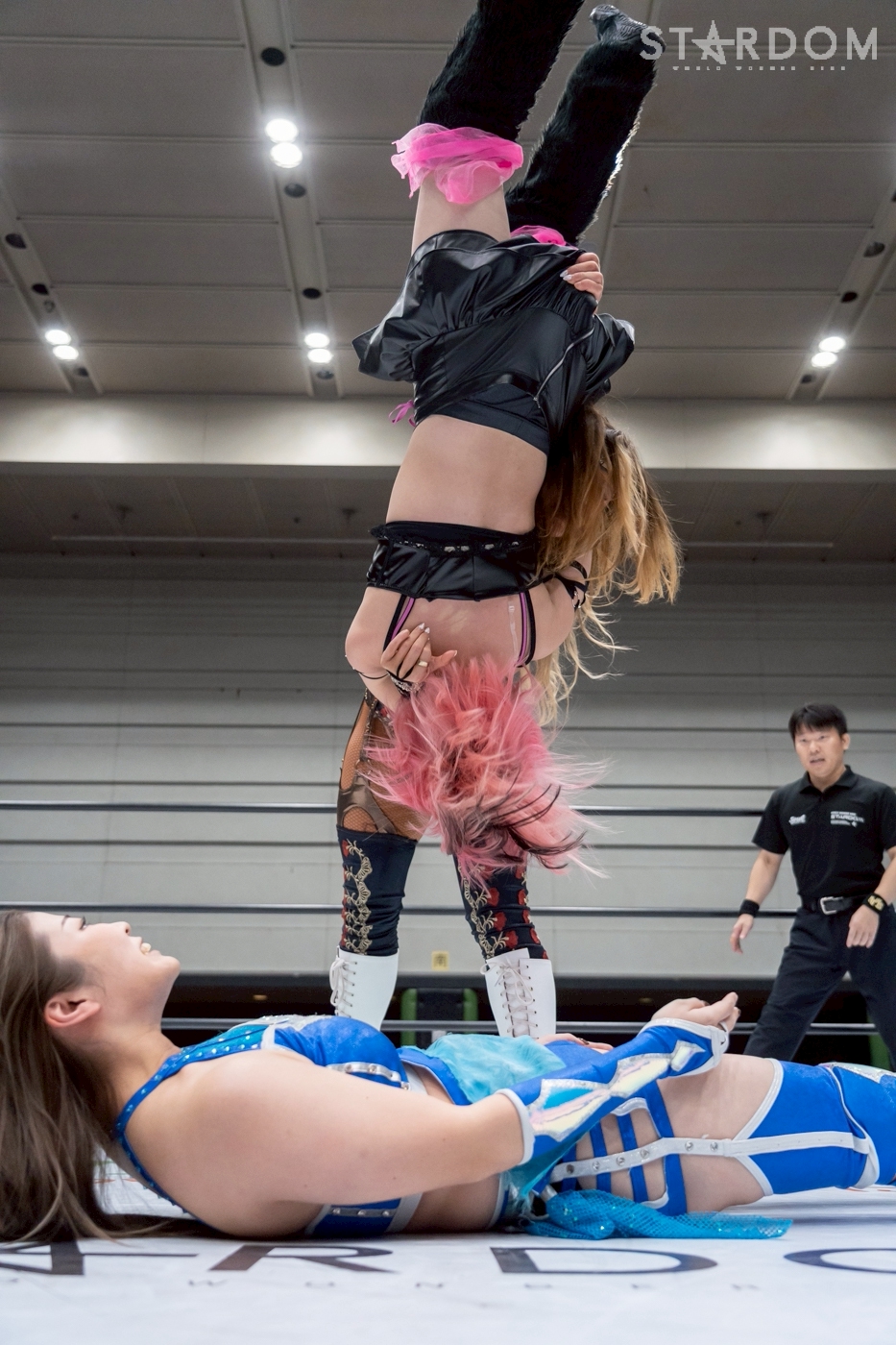 吏南が「メーガンお願いします。ナイスチューミーチュウ」。メーガンが無視すると妃南の上にボディースラム。メーガンは吏南。妃南に次々と串刺しボディーアタック。2人まとめて串刺しボディーアタック。さらに2人まとめてランニングボディープレスの餌食にしてみせる。返した吏南がリング下にエスケープ。妃南が払い腰を狙うがメーガンがこらえて突進。妃南がかわすがメーガンがビッグブーツ。妃南がボディープレスをかわしてフェースクラッシャー。メーガンが返すと、妃南は予告してボディースラムの構え。メーガンが切り返して反対に叩きつける。しかし、吏南がカットに入りエルボーを打ち込む。吏南は「カモン!」と挑発し、エルボーをブロック、つま先を踏みつける。しかしメーガンがカウンターでショルダータックル。吏南は卍固めに入るがメーガンがコーナーに追い込む。吏南はミサイルキック、ジャックナイフ式エビ固め。メーガンが返すと、吏南はブレーンバスター狙い。メーガンがこらえると妃南が呼び込まれ、姉妹がダブルで狙う。姉妹の突進にメーガンがラリアット。姉妹がロープを引いてメーガンを場外に送り出す。吏南が妃南をマットに叩きつけビッグブーツ。妃南がカウンターでネックブリーカー、STF。吏南がエスケープしてノーザンライト、ドロップキック。妃南が後方に投げつけるが、吏南がビッグブーツ。妃南が返すと、吏南とエルボーの応酬。メーガンが割って入ると姉妹でブレーンバスターの構え。メーガンがこらえ、まとめて投げつける。吏南がカバーをカットするが場外に投げられる。メーガンは妃南を持ち上げるがこらえられる。妃南が払い腰の構え、メーガンがこらえると吏南がリング下からムチで殴打。妃南の外道クラッチに吏南が押さえ込む。メーガンが返すと、姉妹にラリアット。吏南はかわすが妃南にヒット。メーガンが前方に叩きつけると吏南がダイブしてカットもかわされ妃南にヒット。メーガンはフライングラリアットで吏南を場外に送り出し妃南にランニングパワーボム。3カウントが入りメーガンが勝利。