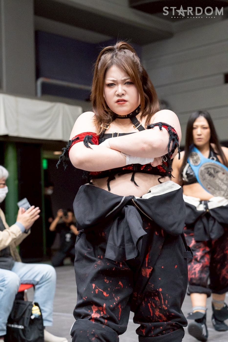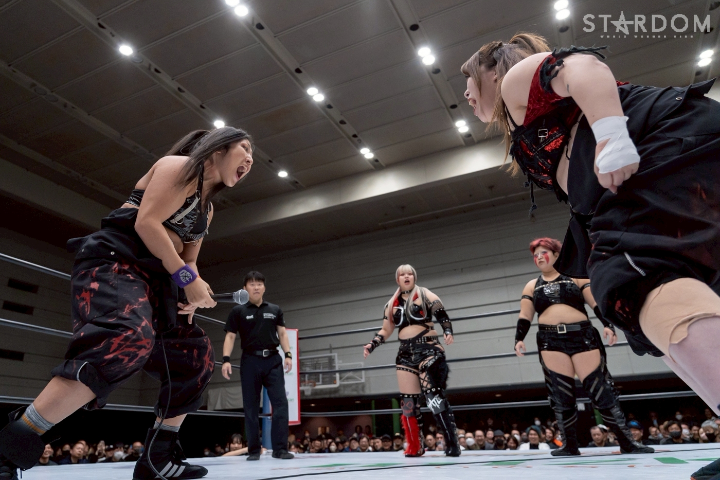 山下が試合前にマイクを要求、「ゴングが鳴る前に、いくつか言わせてもらう。ウチら押忍!血みどろ女塾、タッグリーグ戦はすでに敗退している。だがしかし、ウチら女塾は優勝をまだあきらめていない。琉悪夏、ナツコ、オマエらレッド1位通過らしいな。つまり、オマエらに勝って女塾に入塾させれば、ウチら女塾が優勝だ!」。山下と鈴季が襲いかかるが、リング下からセコンドに脚を引かれる。場外戦で試合がスタート。場外戦で圧倒されるも山下と鈴季が逆転。琉悪夏をリングに戻してダブルでショルダータックル、ポーズを決めるが、後方からナツコが襲いかかる。それでも山下がナツコを場外に落とす。鈴季が琉悪夏に「優勝させろ!」と串刺しボディーアタック。山下は「優勝するぞ!」と琉悪夏にボディースラム。山下は「上げたぞ!」とコーナーに上がり大喜び。山下と琉悪夏がショルダーをぶつけ合う。山下が打ち勝つが、琉悪夏のフェイントに引っかかりクロスボディーを食らう。山下はラリアットも、琉悪夏がフィッシャーマン。ナツコと鈴季がエルボーの打ち合い。ナツコがエルボースマッシュ、鈴季がエルボー、ナツコがラリアット。ナツコと琉悪夏がダブルのブレーンバスター、ダブルのボディープレス、ナツコがセントーン。山下がナツコにラリアット、鈴季もつづき、エプロンに出してリング下から山下とともに蹴り上げる。さらに鈴季がミサイルキック。ナツコが返すと、鈴季は串刺しで突進。ナツコがかわし琉悪夏とサンドイッチ式ラリアット、ナツコがラリアット、コーナーに追い込み、腕組みをしてからキャノンボール。しかし、鈴季が返してみせる。ナツコがコーナーに上がると山下が雪崩式ブレーンバスター。山下と鈴季でキックの挟み撃ちも、琉悪夏がカット。山下がダイビングボディープレス、鈴季がジャーマン。しかし、吏南がレフェリーを引っ張りカウントを阻止、琉悪夏が鈴季をボックスで殴打、山下も殴打。場外乱闘となり、琉悪夏はゴッデスのベルトで山下を殴打。琉悪夏が戻るように指示もナツコを山下が捕獲。20カウントとなり両者リングアウトに。鈴季はリング下で「オマエら全員入塾だ!」と捨て台詞。