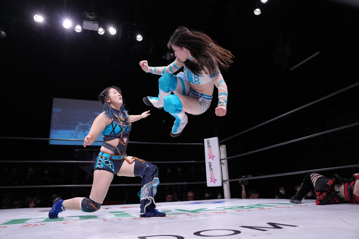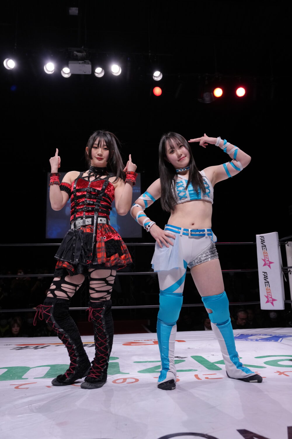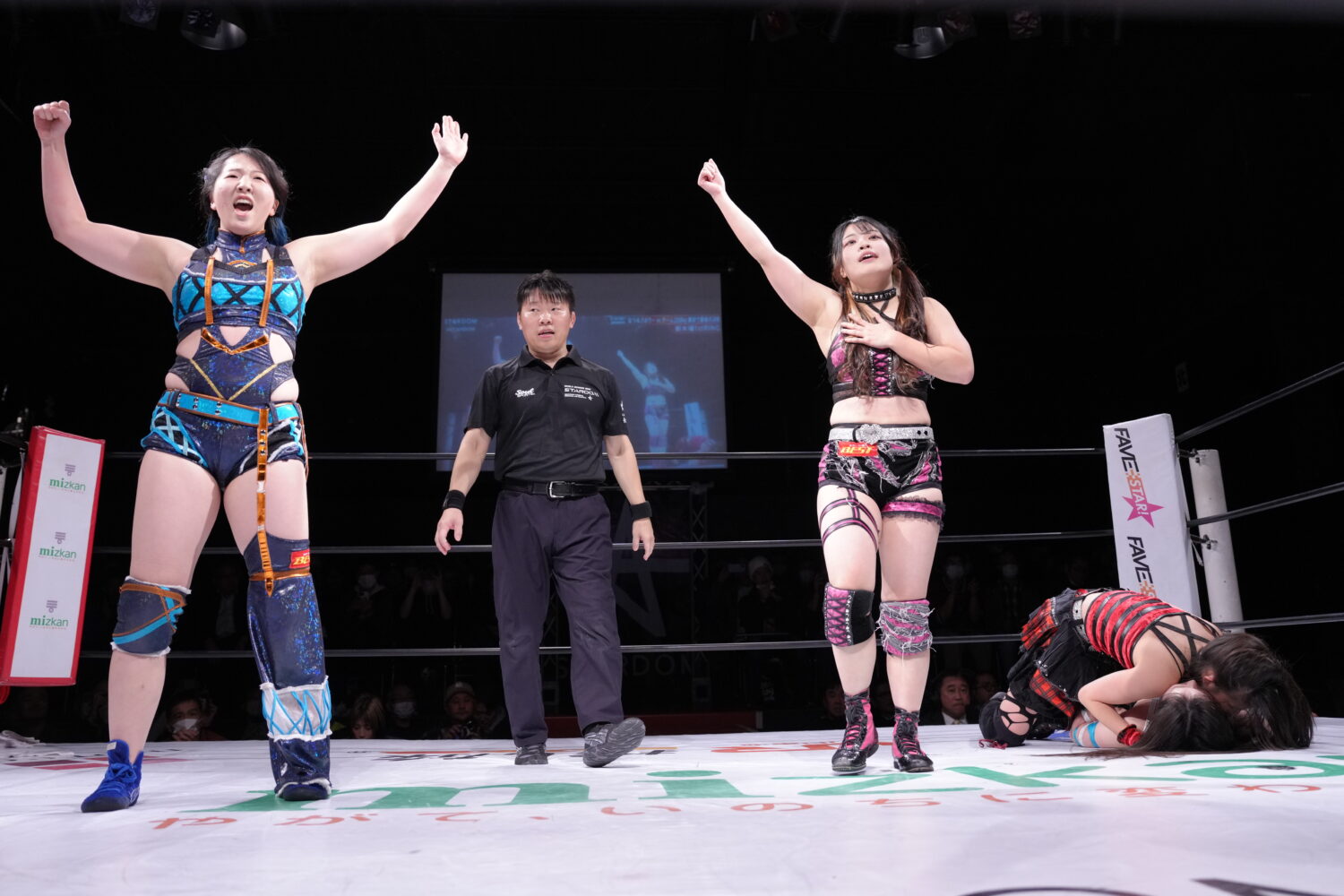 儛島とYUNAの先発でゴング。ロックアップの力比べでYUNAが押し込む。儛島が反転しエルボーも、YUNAがグラウンドで上になる。ともにタッチして、古沢が愛海にドロップキック、愛海は蹴り倒してから、「はじめまして」とヘッドロック。古沢もやり返すが、愛海がロープに振ってフライングクロスチョップをお見舞いする。YUNAが古沢をボディースラム、ワキ固め。サブミッションでギブアップを迫るYUNAだが、古沢がエスケープ。愛海がバックを取ってシットダウン、変型羽根折り固めで締め上げる。コーナーに追い込まれた古沢が、愛海をかわして丸め込みの連続。儛島が愛海にドロップキック。YUNAにもドロップキックを見舞うと、愛海が「タッグマッチだぞ!」とアピールし、エルボーを受けて立つ。愛海が儛島をエルボーで倒すが、コルバタとドロップキックを食らう。古沢が愛海へ串刺しドロップキック。ボディースラムの構えは、愛海が切り返す。しかし、古沢は回転してアンクルホールドを極める。愛海がエスケープすると、古沢がコーナーに叩きつける。しのいだ愛海がエプロン越しにアームブリーカー。すでにタッチしていたYUNAが攻撃へ。YUNAの押さえ込みを古沢が返してエルボー、延髄斬り。儛島がYUNAにドロップキック連打。儛島と古沢がサブミッションで競演。古沢のドロップキックから、儛島が逆さ押さえ込み。YUNAが返すと、儛島はスワンダイブ式ボディーアタック。返したYUNAに、儛島はボディースラム狙い。YUNAがこらえると、儛島がエルボー連打。YUNAがネックブリーカーも儛島が返す。儛島、YUNAがドロップキックの応酬。儛島が丸め込むが、愛海のカットが間に合う。儛島と古沢が合体も、愛海とYUNAがダブルのドロップキック、YUNAがまとめてネックブリーカー。愛海がランニングダブルニーアタック、YUNAがミサイルキック。しかし、儛島が返してみせる。YUNAがミサイルキックを決めると、儛島が返せず3カウントが入った。試合後、儛島がYUNAにつかみかかり乱闘に。