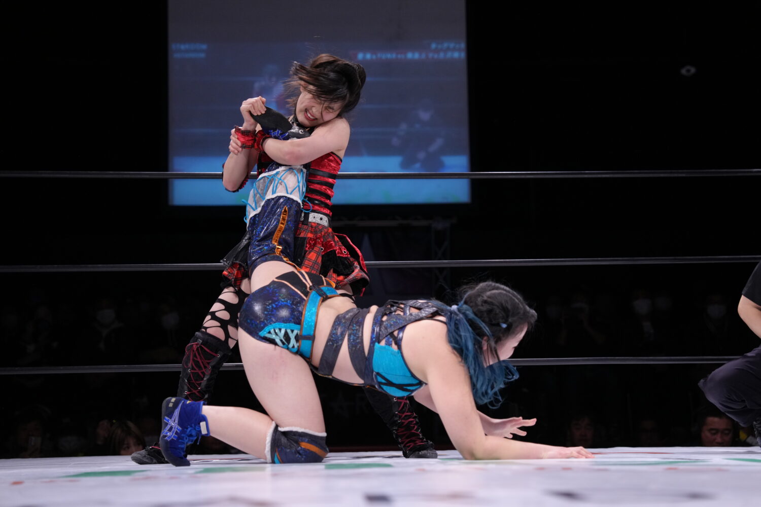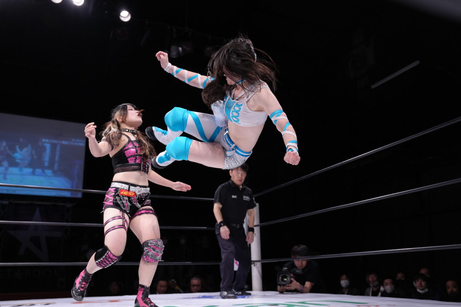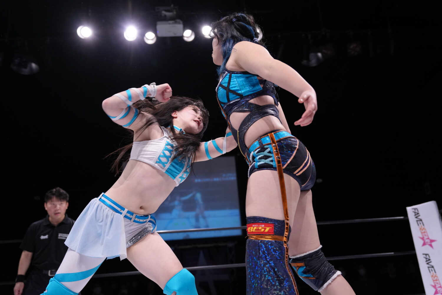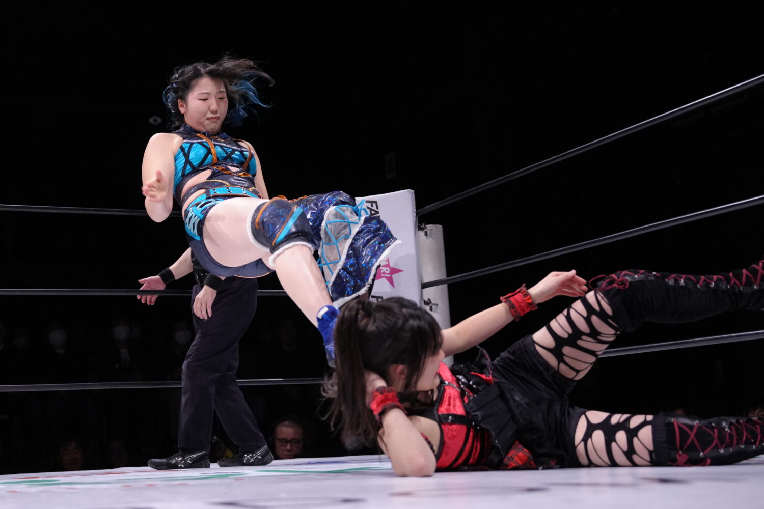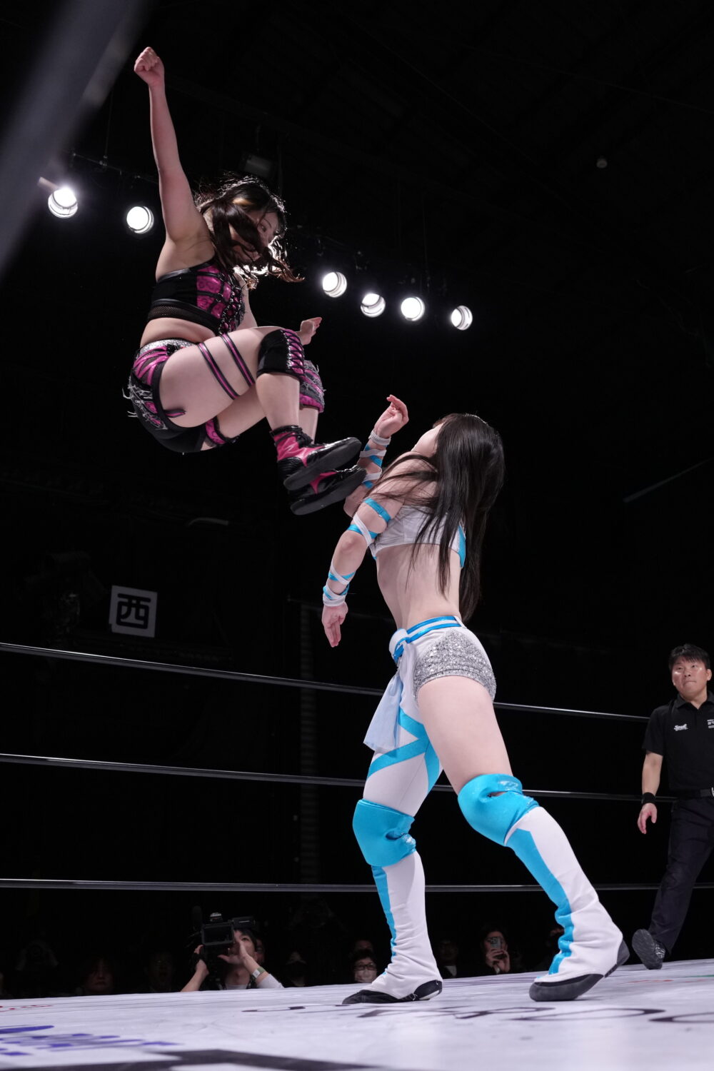 同日デビューの儛島エマと古沢稀杏がタッグを組んでセンダイガールズの愛海&YUNA組を迎え撃つタッグマッチ。若い力による団体対抗戦だ。YUNAが保持する仙女ジュニア王座はスターダムの若手もかかわってきたタイトル。儛島と古沢には、そのベルトを意識した闘いになりそうだ。