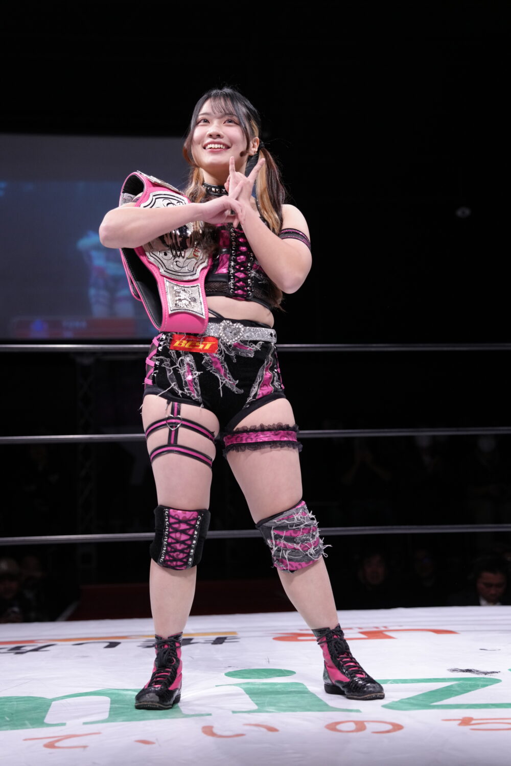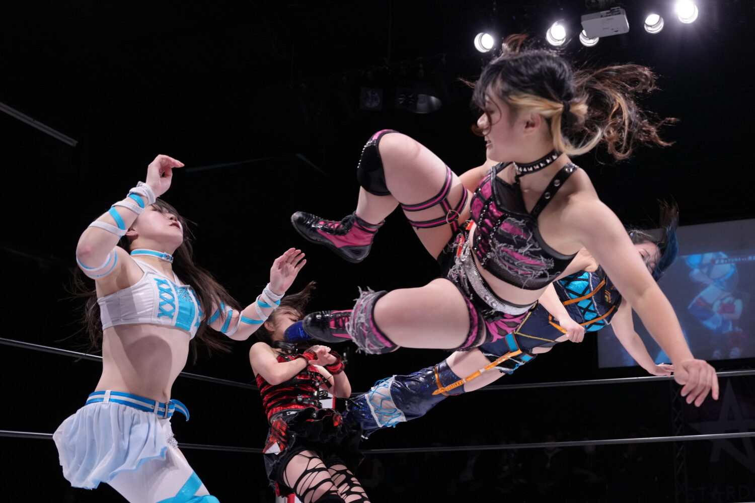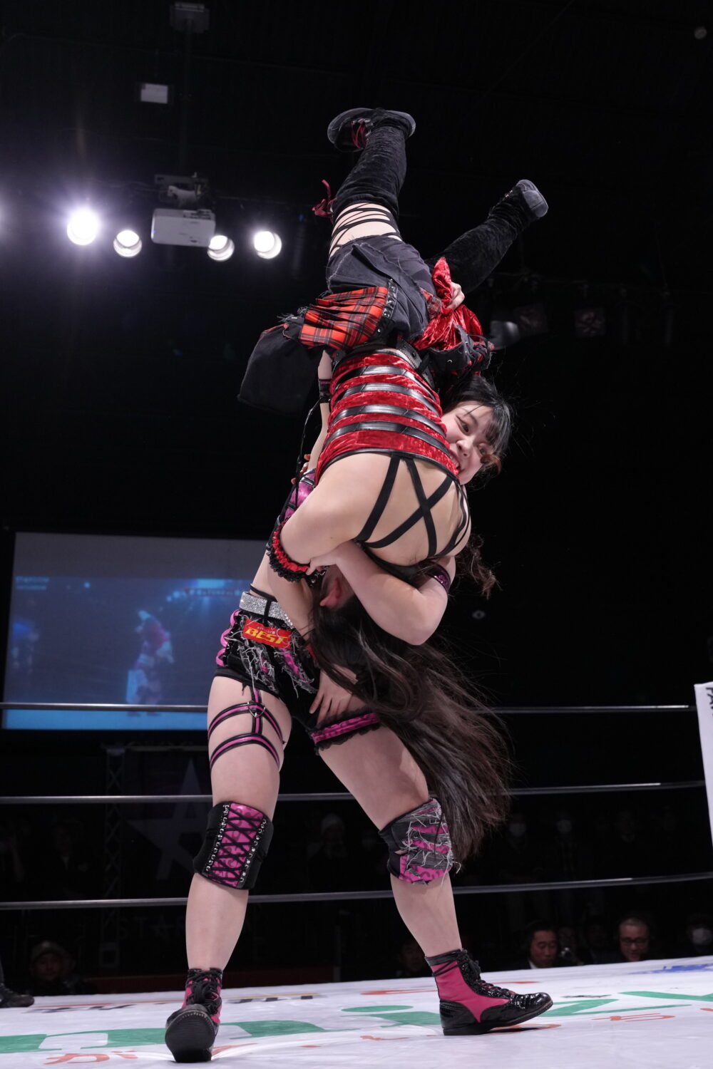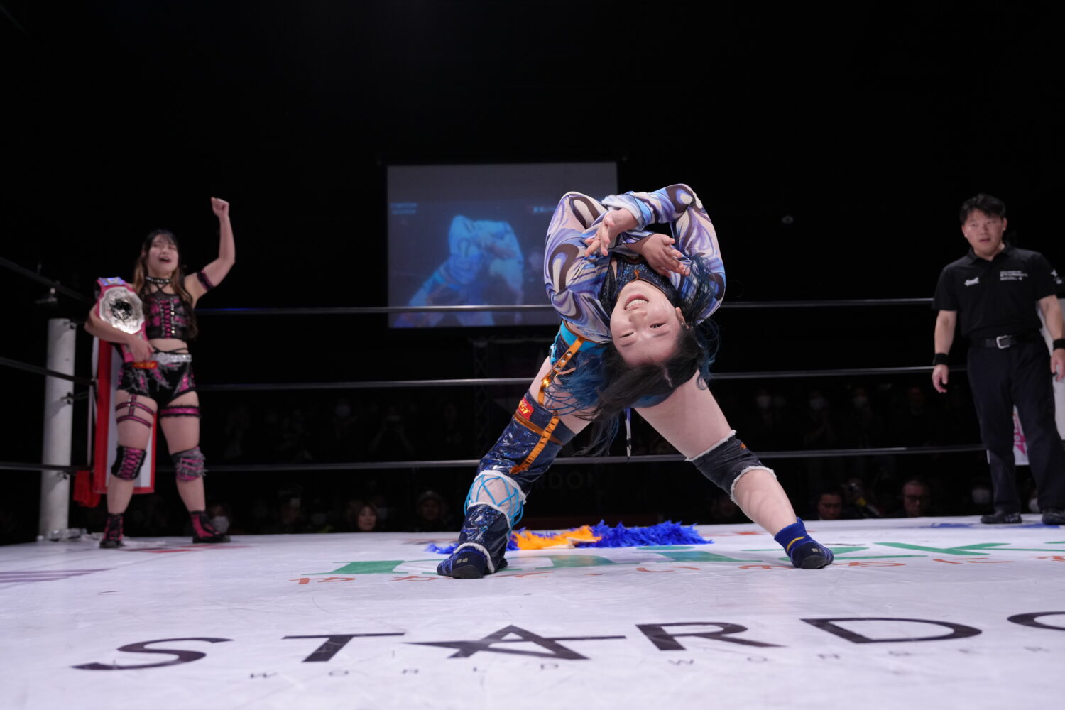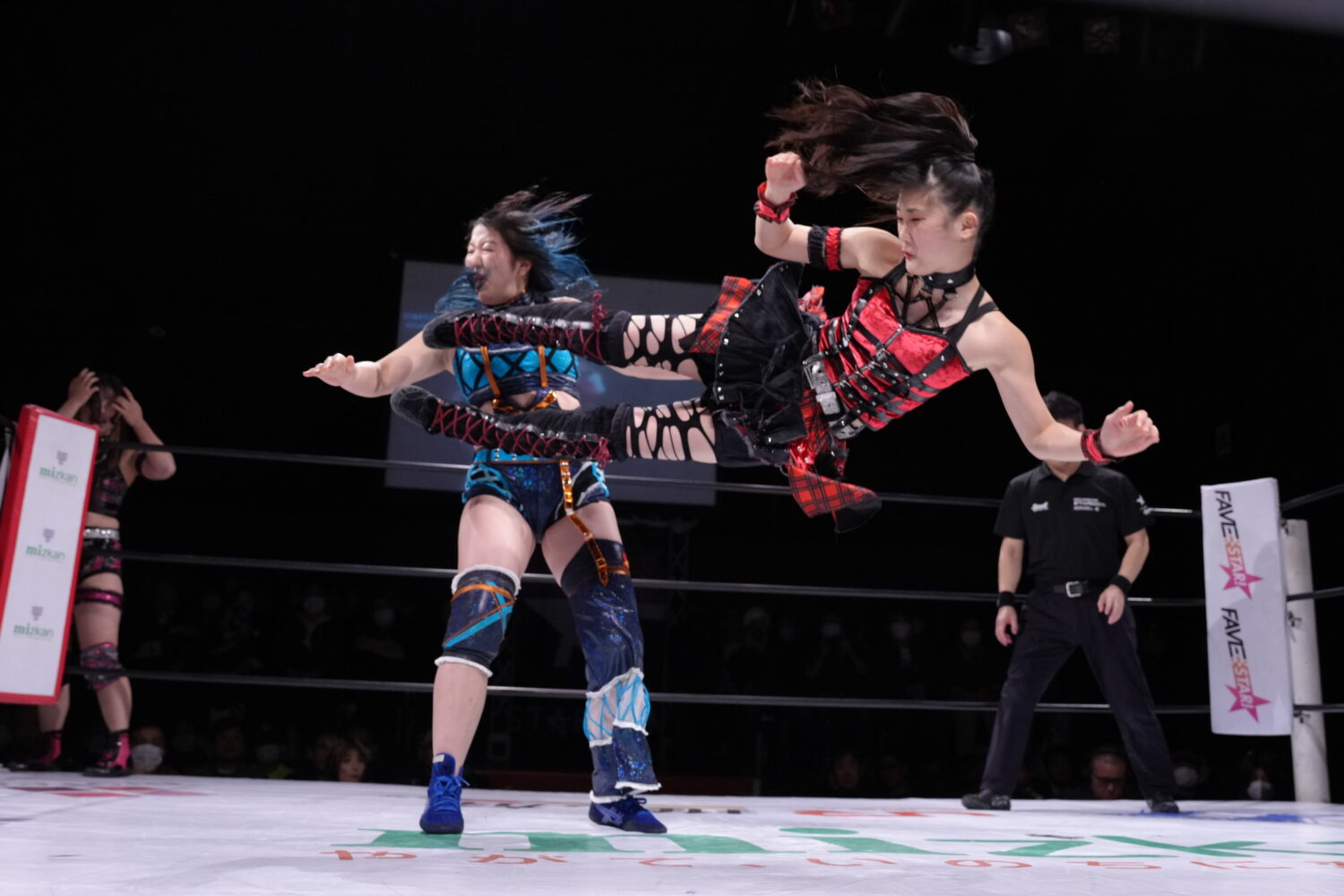 同日デビューの儛島エマと古沢稀杏がタッグを組んでセンダイガールズの愛海&YUNA組を迎え撃つタッグマッチ。若い力による団体対抗戦だ。YUNAが保持する仙女ジュニア王座はスターダムの若手もかかわってきたタイトル。儛島と古沢には、そのベルトを意識した闘いになりそうだ。