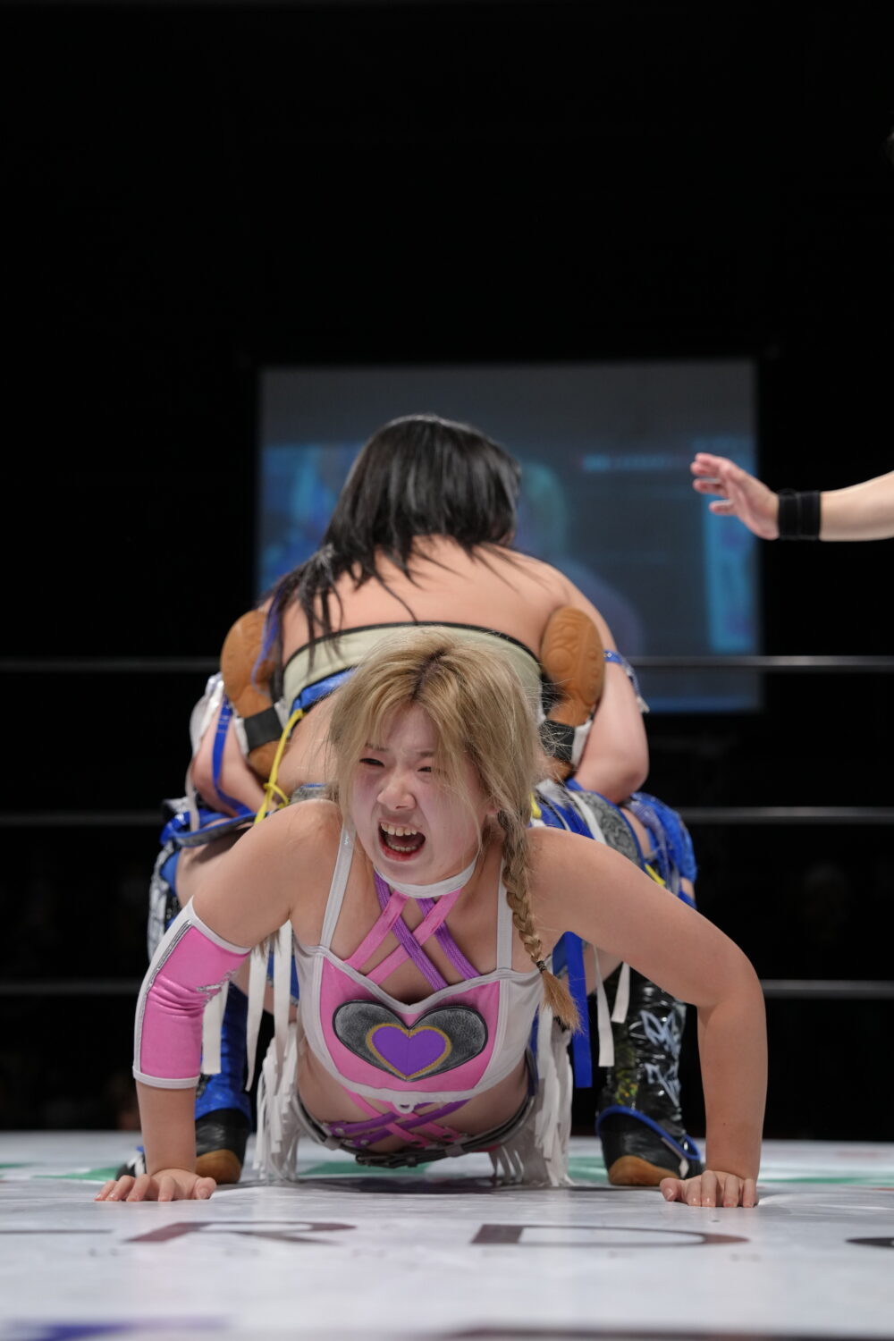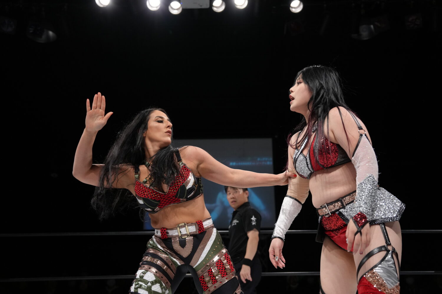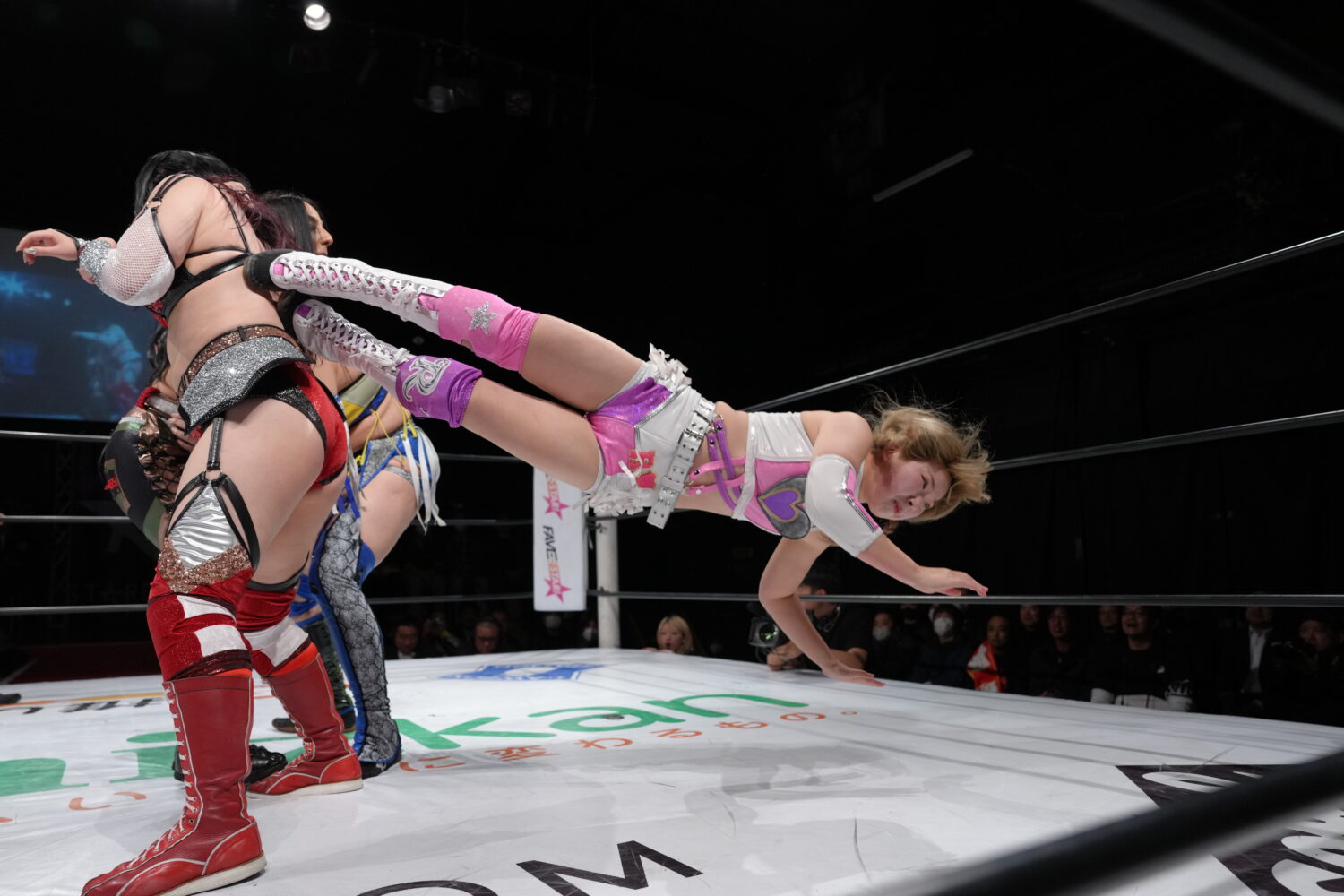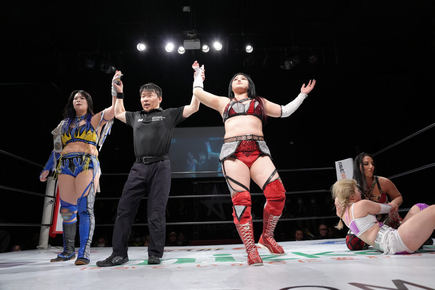 舞華とジーナが握手をかわす。ジーナと梨杏が何やら話し合い、梨杏が出てくる。試合は梨杏とHANAKOでスタート、梨杏がドロップキックからエルボー連打、HANAKOはヘアーホイップ、梨杏のドロップキックを受けて立つと、ボディースラムの連発で叩きつける。舞華も梨杏へのボディースラムでつづく。HANAKOが梨杏にボディースラム、逆エビ固め。梨杏がエスケープすると、HANAKOは舞華に託す。舞華は梨杏のエルボー連打に仁王立ち。梨杏がスタナー、ドロップキック。ジーナが舞華へショルダータックル。HANAKOにも放つが、HANAKOがこらえてみせる。ジーナは連打、次もと見せかけHANAKOを捕まえると、梨杏のアシストを得て、舞華もまとめて変型DDT。ジーナが舞華の突進をかわし、腕を取って丸め込む。さらに舞華の頭部を梨杏が出した足にぶつけていく。ジーナがバックキック、舞華が先を読んでショルダータックル。舞華は梨杏がやったようにHANAKOに足を出すように指示、ジーナの額をぶつけていく。HANAKOが入り、ジーナにボディーアタック、ショルダータックル、ニードロップ。梨杏がHANAKOにドロップキック。HANAKOは振られることを拒否、コルバタを止めてパワーボムの構え。梨杏が脱出し、ジーナがラリアット、梨杏がドロップキック、クロスボディー。2発目をHANAKOが止めてバックブリーカー。梨杏が返すと、HANAKOはしがみつく梨杏を切り返して逆エビ固めを決めてみせる。エスケープさせずにHANAKOは中央で締め上げる。しかし、ジーナのカットが成功。舞華とHANAKOがボディーアタック、ビッグブーツの競演。梨杏が返すと、HANAKOはブレーンバスター狙い。梨杏が切り返してスリーパー。HANAKOがコーナーに追い込むが、梨杏が飛びついてスリーパー。HANAKOがコーナーに追い込むが、梨杏がコルバタからグラウンドでスリーパー。胴締めにもっていくが、HANAKOがロープへ逃れる。梨杏はコーナーに上がるが、舞華が止めてHANAKOがビッグブーツ、ブレーンバスター。しかし、梨杏が返してみせる。HANAKOはフィニッシュを予告してアルゼンチン。梨杏が丸め込みの連続。HANAKOの突進を止めて、ジーナのアシストから丸め込む。HANAKOがビッグブーツ、立ち上がった梨杏にラリアット。梨杏が返すと、HANAKOはアルゼンチンからJPコースター。梨杏が返せず、HANAKOが勝利した。