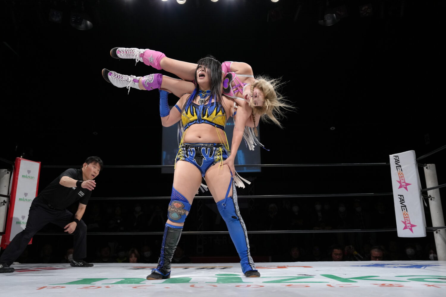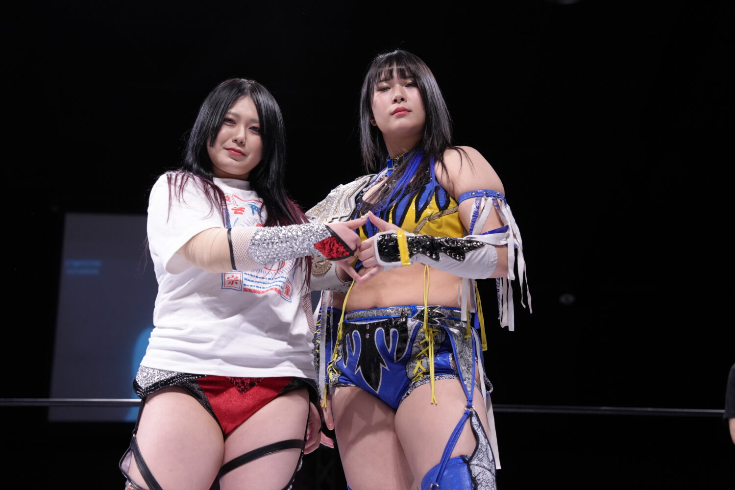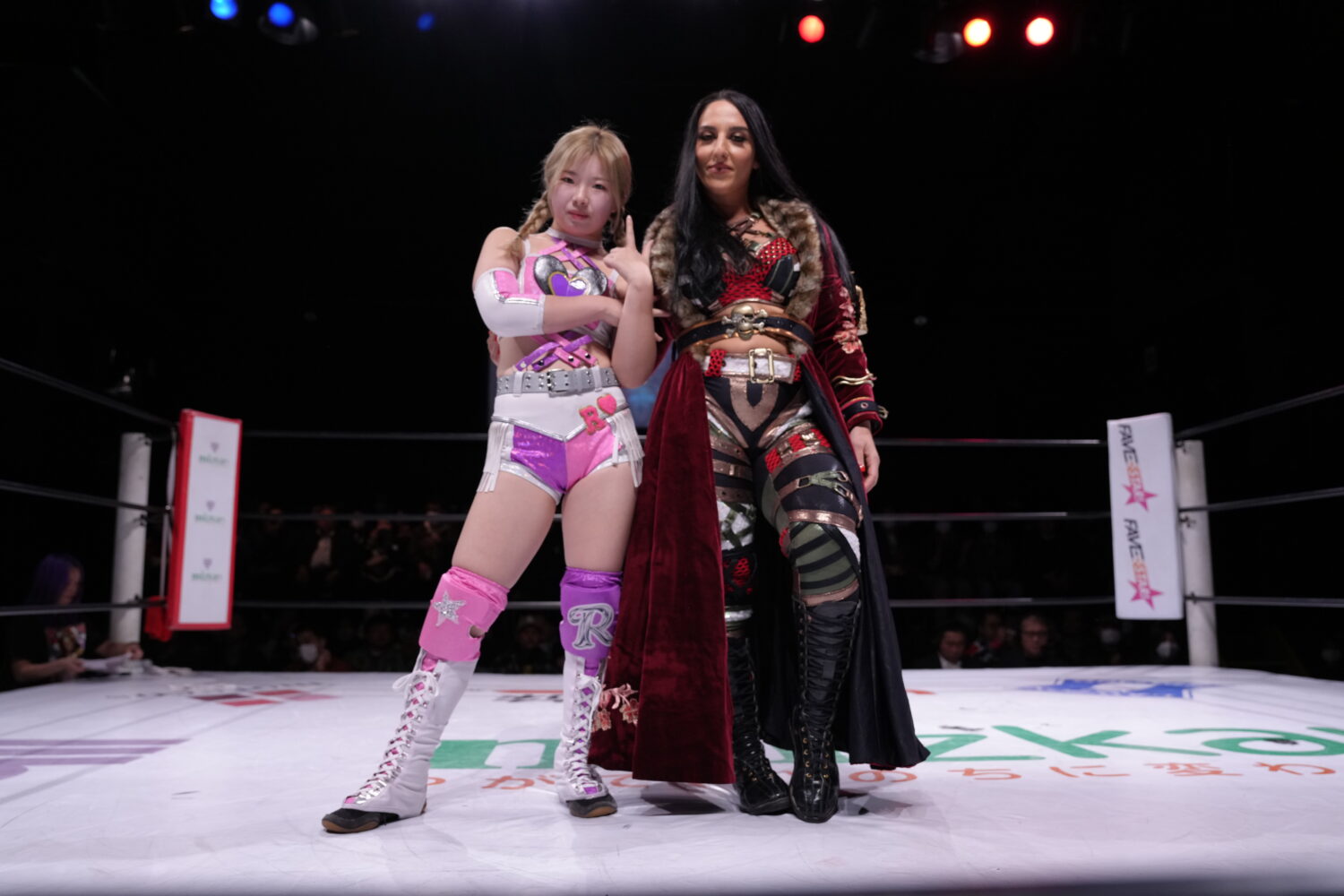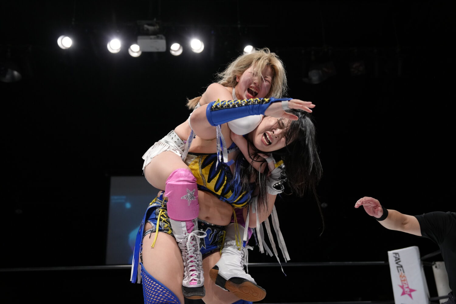 舞華とジーナが握手をかわす。ジーナと梨杏が何やら話し合い、梨杏が出てくる。試合は梨杏とHANAKOでスタート、梨杏がドロップキックからエルボー連打、HANAKOはヘアーホイップ、梨杏のドロップキックを受けて立つと、ボディースラムの連発で叩きつける。舞華も梨杏へのボディースラムでつづく。HANAKOが梨杏にボディースラム、逆エビ固め。梨杏がエスケープすると、HANAKOは舞華に託す。舞華は梨杏のエルボー連打に仁王立ち。梨杏がスタナー、ドロップキック。ジーナが舞華へショルダータックル。HANAKOにも放つが、HANAKOがこらえてみせる。ジーナは連打、次もと見せかけHANAKOを捕まえると、梨杏のアシストを得て、舞華もまとめて変型DDT。ジーナが舞華の突進をかわし、腕を取って丸め込む。さらに舞華の頭部を梨杏が出した足にぶつけていく。ジーナがバックキック、舞華が先を読んでショルダータックル。舞華は梨杏がやったようにHANAKOに足を出すように指示、ジーナの額をぶつけていく。HANAKOが入り、ジーナにボディーアタック、ショルダータックル、ニードロップ。梨杏がHANAKOにドロップキック。HANAKOは振られることを拒否、コルバタを止めてパワーボムの構え。梨杏が脱出し、ジーナがラリアット、梨杏がドロップキック、クロスボディー。2発目をHANAKOが止めてバックブリーカー。梨杏が返すと、HANAKOはしがみつく梨杏を切り返して逆エビ固めを決めてみせる。エスケープさせずにHANAKOは中央で締め上げる。しかし、ジーナのカットが成功。舞華とHANAKOがボディーアタック、ビッグブーツの競演。梨杏が返すと、HANAKOはブレーンバスター狙い。梨杏が切り返してスリーパー。HANAKOがコーナーに追い込むが、梨杏が飛びついてスリーパー。HANAKOがコーナーに追い込むが、梨杏がコルバタからグラウンドでスリーパー。胴締めにもっていくが、HANAKOがロープへ逃れる。梨杏はコーナーに上がるが、舞華が止めてHANAKOがビッグブーツ、ブレーンバスター。しかし、梨杏が返してみせる。HANAKOはフィニッシュを予告してアルゼンチン。梨杏が丸め込みの連続。HANAKOの突進を止めて、ジーナのアシストから丸め込む。HANAKOがビッグブーツ、立ち上がった梨杏にラリアット。梨杏が返すと、HANAKOはアルゼンチンからJPコースター。梨杏が返せず、HANAKOが勝利した。