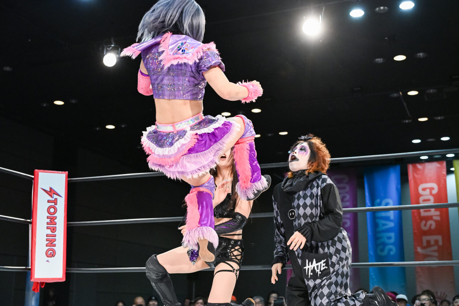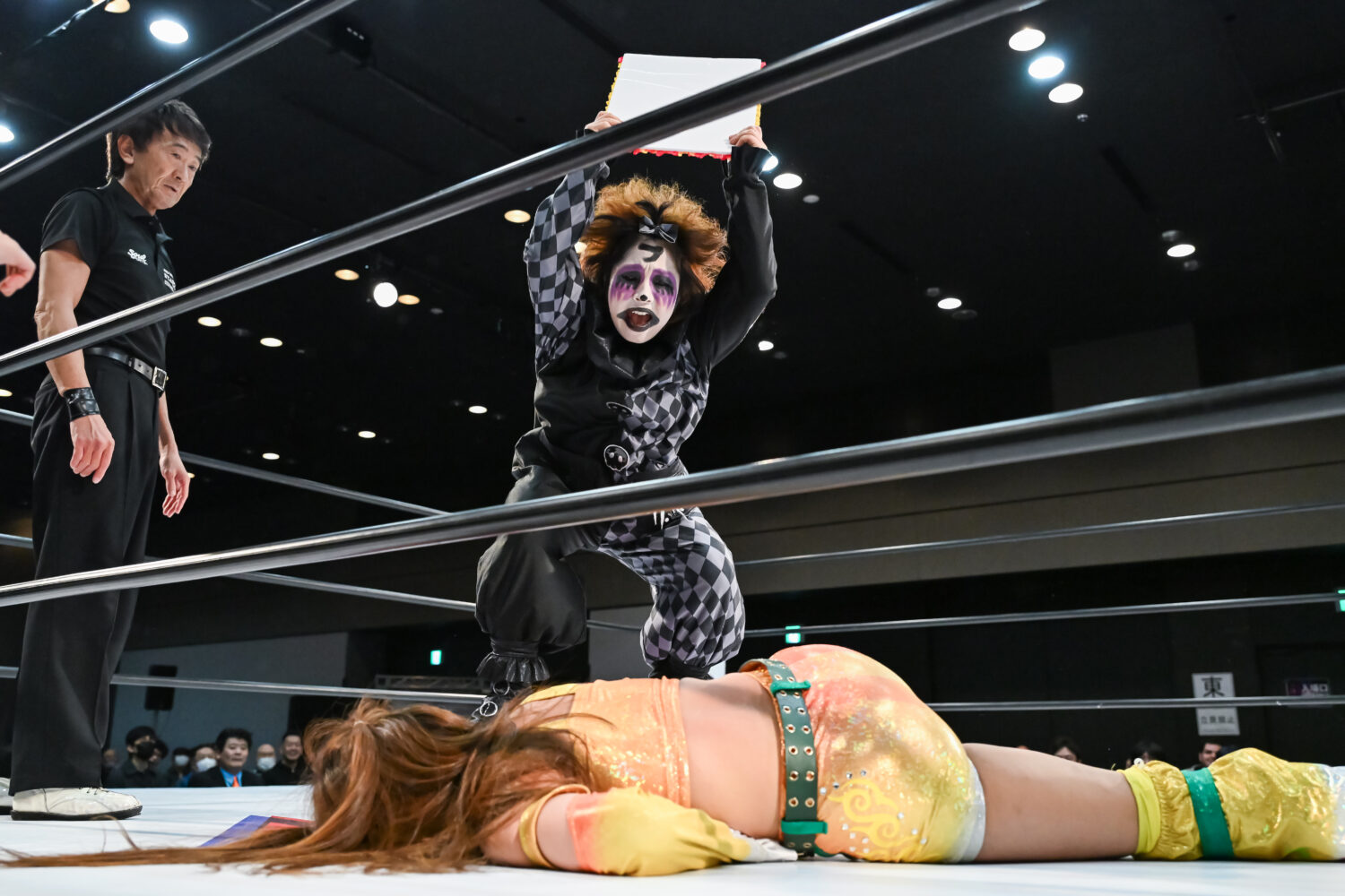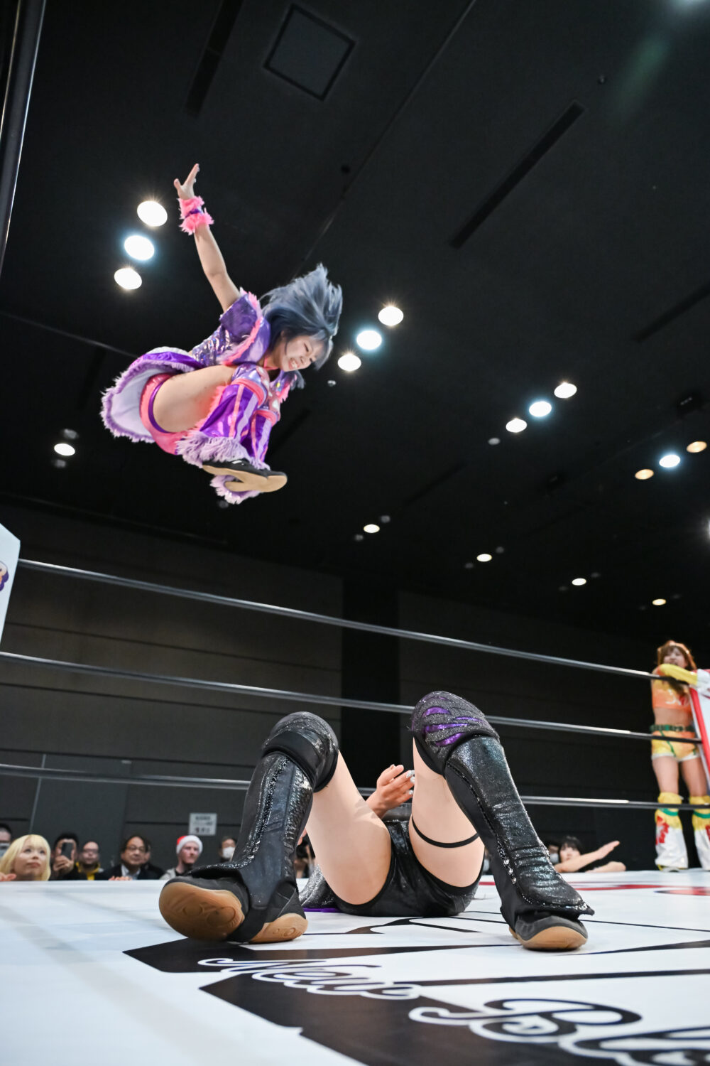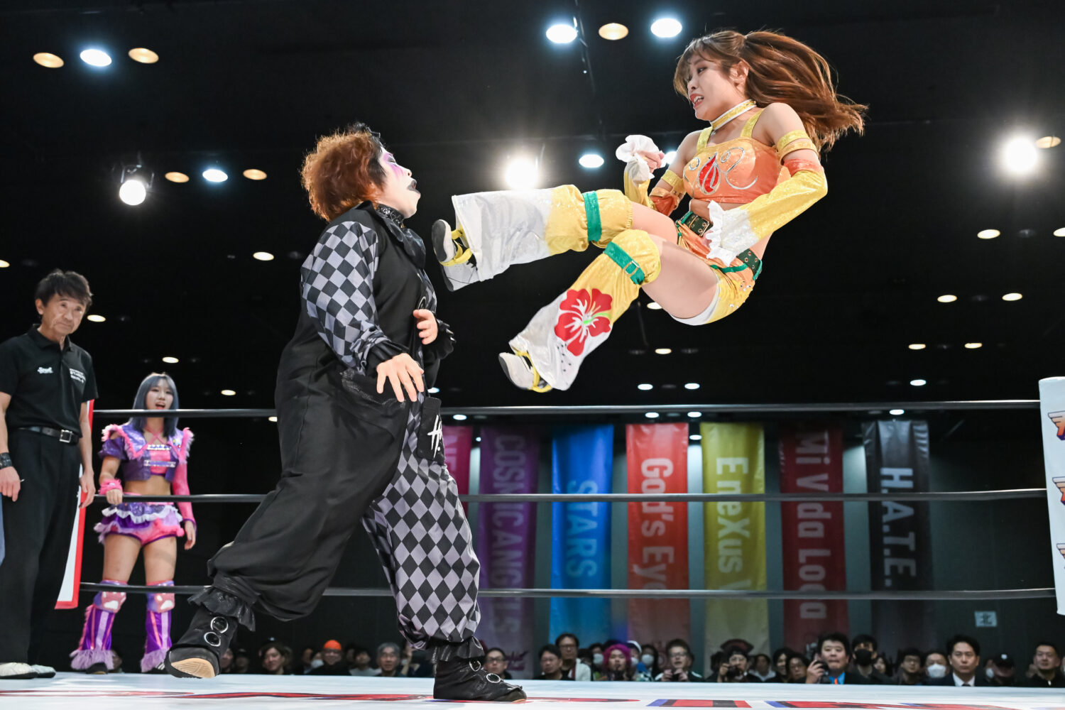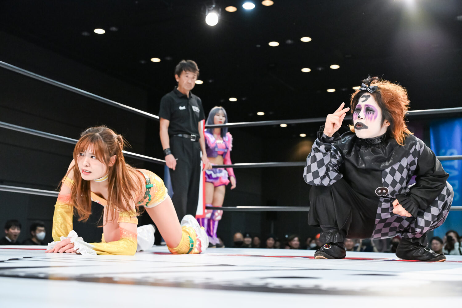 金屋が先発に名乗りを挙げて、フキゲンと対峙。機嫌の悪いフキゲンが四方にアピール。その背後から金屋が攻撃を加えるが、フキゲンは喫煙のポーズ。しかし「なめんな」と金屋がドロップキック。咲蘭が入るがあずさに脚を引かれ合体ならず。フキゲンは金屋の鼻を攻撃、あずさがコーナーに追い込み顔面を踏みつけていく。フキゲンが金屋にスリーパー、キャメルクラッチ。エスケープを許すと応援ボードで殴っていく。さらにコーナーに追い込み突進も、そのたびに金屋が足を出して阻止。金屋が飛びついてアームホイップからドロップキック。咲蘭がフキゲンへドロップキック、あずさが入りフキゲンと合体を試みるも、咲蘭がまとめてマットに叩きつける。咲蘭はフキゲンにボディースラムの構え。フキゲンのサミングを阻止してみせるが、あずさの二段蹴りを食らう。咲蘭があずさに飛びつき、フットスタンプ3連発。返されるとコーナーからダイビングフットスタンプを放つ。金屋があずさにドロップキック、エルボー連打。あずさをかわして金屋がドロップキック、串刺しエルボー、ブルドッキングヘッドロック。あずさが返すと、金屋が飛び乗る。あずさがかわしてフキゲンがセントーン、あずさがPK。金屋が返すと、あずさが首を取る。金屋が切り返し、エルボー連打。あずさがミドルキックで金屋を倒して突進。金屋がかわして押さえ込む。丸め込みの連続から咲蘭がドロップキック。金屋が逆さ押さえ込み。あずさが返すと、金屋の突進に二段蹴り、ヒザ十字。金屋がなんとかエスケープ。10分経過。あずさがネックブリーカーも2カウント。あずさが後方に叩きつけてホールドすると3カウントが入った。