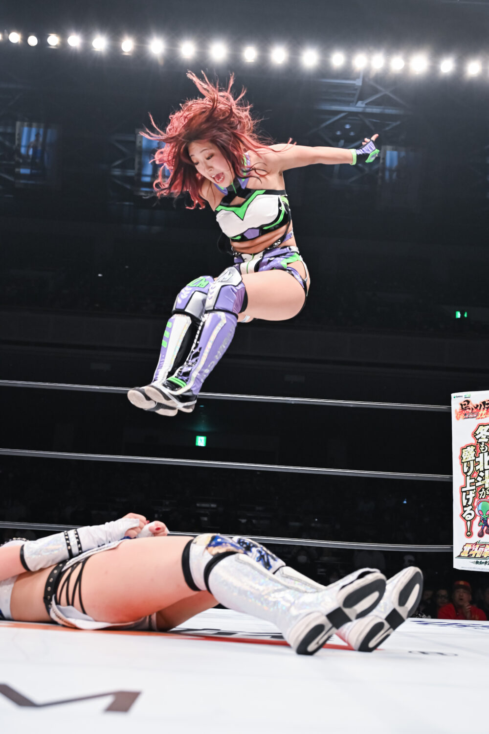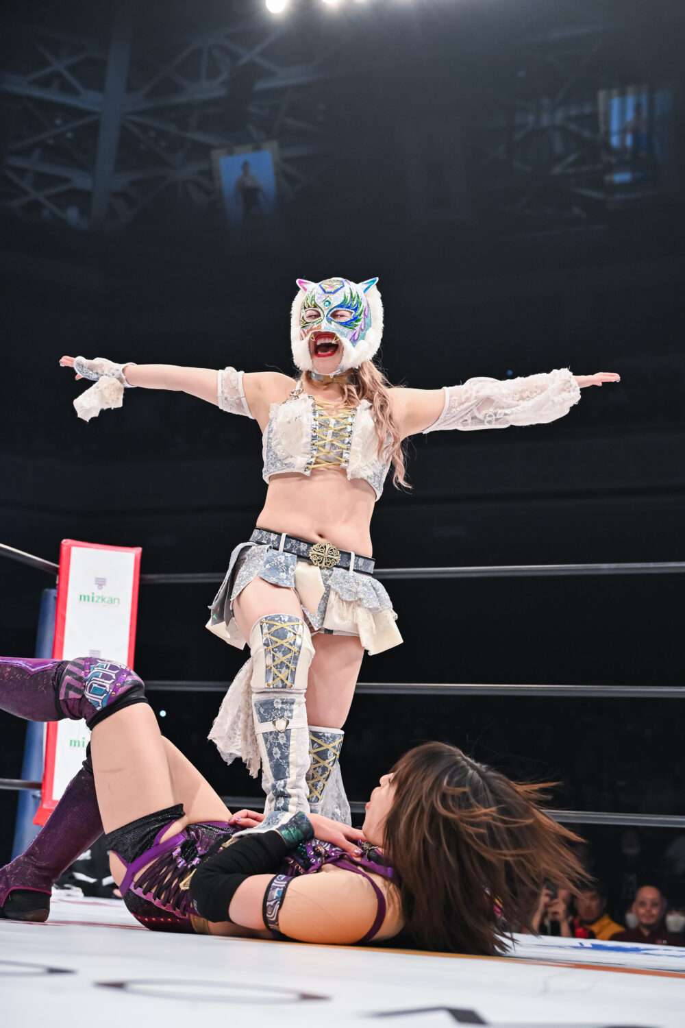 キッド「いいスタート。私はワンダーのベルトを落としてしまって、次の目標に向かっていきたいなと思っているところなんですけども。この欠場中に闘い方だったり技だったり、いろいろ考えました。でも私の持っている技のなかで、今日はムーンサルトで取ったんですけど。ムーンサルトやタイガー・スープレックス、黒虎脚殺や黒虎天罰など、誰もが見てわかるような技の精度をもっと磨いていきたいなって、この期間にすごい思いました。これが私が目指すべき赤への入り口なのかなとも思ってます、私なりにですけど。次の目標に向かって私は行きたいんですけど、AZMは?」