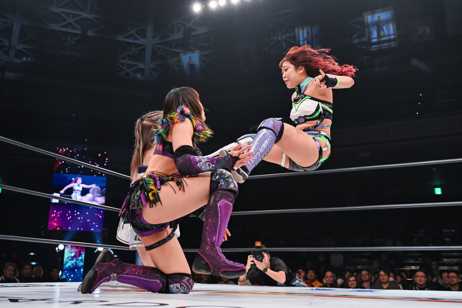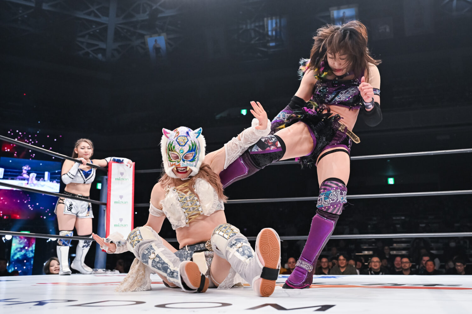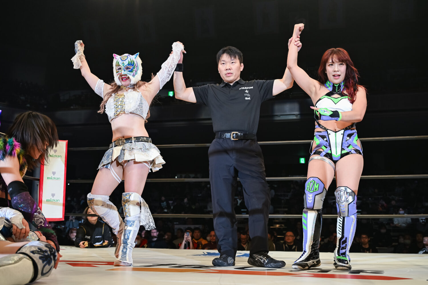 両軍が握手をかわし、キッドが先発に名乗りを挙げて朱里と対峙する。腕の取り合いから朱里がヘッドロック。キッドが蹴りを入れるとAZMが介入して合体。連係で攻めダブルのドロップキック。キッドはその場跳びムーンサルト。朱里が返すと、キッドの突進をともかが妨害して朱里がハーフハッチ。ともかがキッドへ「キッちゃん復帰おめでとう」とサッカーボールキック。朱里がキッドにニー、「キッド、復帰おめでとう」とサッカーボールキックでつづく。ともかがキッドに串刺しニーを連打。キッドが返すと、ともかとエルボーの打ち合い。ともかが連打も、キッドがクロスボディーアタック。AZMがともかにドロップキック。朱里が介入するが、AZMがかわし、まとめてコルバタ。AZMがダイビングフットスタンプにいくが、ともかがかわす。朱里がAZMにドロップキック、串刺しニー。AZMが返してエルボー連打。朱里をかわしてキッドとダブルで突進。しかし、朱里がまとめてコードブレイカー。朱里はAZMにニーアタック、コーナーに上がるとAZMがアームホイップ、PK、ハイキック。朱里がカウンターでハイキック。朱里とAZMがダウン状態。ともかがキッドにアンクルホールド。キッドがエスケープすると、ともかをかわして619、ダイビングボディーアタック。ともかが返すと、キッドが投げの構え。ともかがこらえてソバット、キッドが飛ぶと、ともかが回し蹴りで迎撃する。10分経過。キッドが返すと、ともかはブレーンバスター狙い。キッドが蹴りをかわしてAZMがミサイルキック、キッドがフィッシャーマン。返したともかにキッドはコーナーへ。朱里が止めて抱え上げると、ともかがニーをぶち込む。前方に叩きつけてバズソーキック。決まったと思われたが、AZMがカット。キッドの突進を止めてともかが抱え上げる。切り返したキッドが黒虎天罰。ともかの丸め込みを返してキッドがダブルニーアタック。AZMがダイビングフットスタンプを放ち、キッドがムーンサルトプレス投下。ともかが返せずキッドが勝利した。