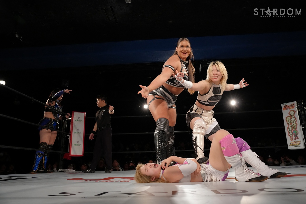 ボジラがアキラの背中を叩いて先発に送り出し、梨杏と対峙。ロックアップからアキラがヘッドロック。梨杏が切り返すと、アキラが腕を取りにいく。梨杏も取り返してバックにまわる。アキラも応戦すると、梨杏がつま先を踏みつけヘッドロック。アキラが切り返してヘッドロックからグラウンドへ。腕十字狙いを梨杏が切り返して、ドロップキック。アキラが突進をかわしボジラを呼び込む。ボジラが串刺しボディーアタック、アキラがドロップキック、ボジラがボディースラム、2人でミ・ヴィダ・ロカをアピールする。ボジラは梨杏をヘアーホイップの連続、ベイダーハンマー連打から噛みつき攻撃、滞空時間をとって前方に落とす。HANAKOがカットするとボジラが髪をつかんで場外に送り出す。アキラが梨杏に串刺しエルボー連打。梨杏が返すと、アキラの突進にクロスボディー。HANAKOがアキラにショルダータックル連発。アキラが返すと、アルゼンチンへ。しかし、ボジラがカットしてアキラと合体。するとHANAKOは突進をかわし、まとめて串刺しボディーアタック、まとめてドロップキック。アキラが返すと、HANAKOへエルボー連打で向かっていく。さらに河津落としで叩きつけ、ボジラに託す。ボジラはHANAKOへミサイルキック。ボジラの突進をかわしHANAKOがショルダータックル。ショルダーのぶつけ合いからラリアットを打ち合う。ボジラがブレーンバスターを狙うが、HANAKOがこらえてエルボーの応酬。ボジラが連打を受けて立ち、沙希を読んでラリアット。HANAKOも先を読んでラリアットを打ち込むとブレーンバスター狙い。しかし、ボジラがこらえて反対に叩きつけ、セントーン投下。HANAKOが返すと、ボジラがコーナーへ。HANAKOが下からビッグブーツ、雪崩式ブレーンバスターを決める。さらにビッグブーツを叩き込みコーナーへ。ボジラが立ち上がり、雪崩式ブレーンバスターのお返しから、狙いすましてラリアット。引き起こすとラストライド宣言。こらえたHANAKOがラリアットでボジラを倒す。10分経過。梨杏のドロップキックをかわしてアキラがドロップキック連打。梨杏が返すと、アキラはフェースロックへ。アキラの突進をHANAKOがキャッチして叩きつける。梨杏がHANAKOを踏み台にフットスタンプ、スリーパーホールド。胴締めにいくが、ボジラがカットしてボディースラム、アキラをボディースラムで梨杏に叩きつける。梨杏が返すと、アキラはフィニッシュを宣言してハーフハッチの構え。梨杏がこらえてエルボーの打ち合いに。アキラの突進をHANAKOが阻止、梨杏がドロップキック、コーナーへ。するとボジラが止めてデッドリードライブ、アキラがハーフハッチスープレックス。しかし、梨杏の肩が上がる。アキラはフェースロックもHANAKOのカットが間に合う。アキラが梨杏の首を取る。梨杏がこらえて丸め込みの連続。アキラの足をすくって丸め込みにいくと3カウントが入った。試合後、HANAKOとボジラ。梨杏とアキラが髪をつかみ合って一触即発に。