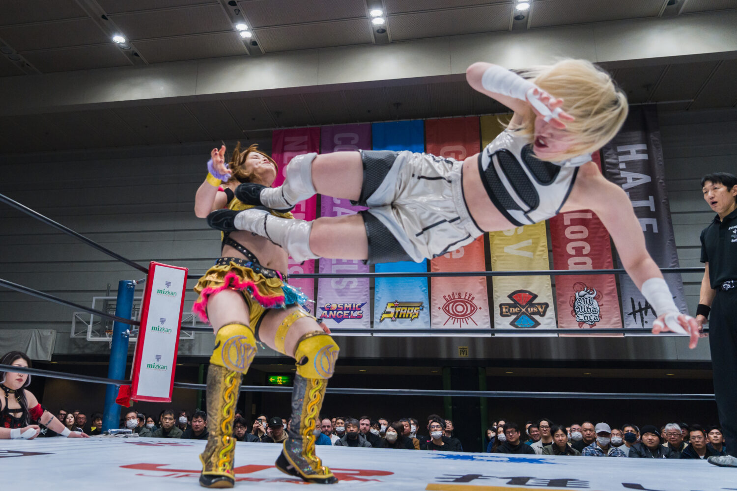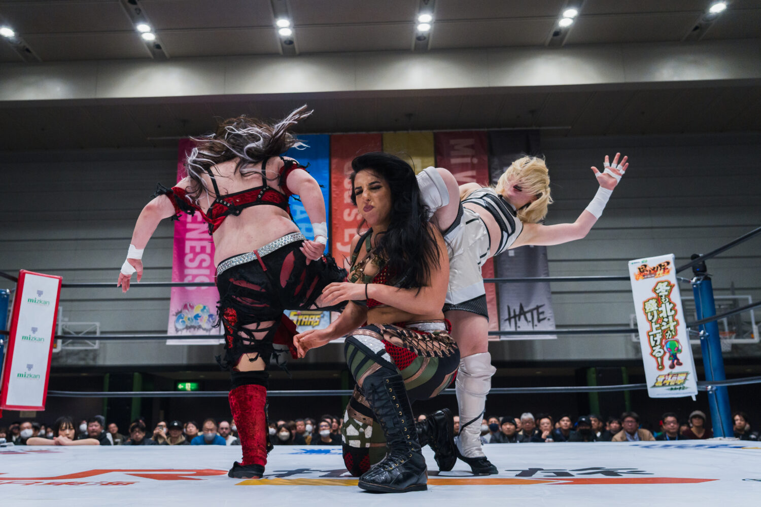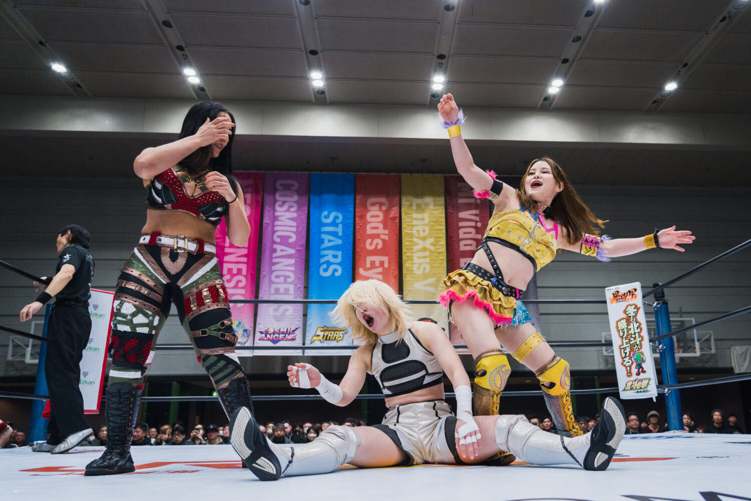 月山とジーナがゴング前に襲いかかる。ダブルで攻撃するが、鈴季がかいくぐりアキラがジーナにドロップキック。鈴季とアキラがジーナを踏みつけてアピール。アキラがジーナへドロップキック連打。ジーナがアキラに丸め込み、スイングしてサイドスラム。月山とジーナがヒップバットの挟み撃ちで競演し、ジーナがランニングギロチン、月山がヒップドロップ。アキラがカウンターで月山にドロップキック、ボディースラム。鈴季が月山に串刺しエルボー、串刺しニーアタック。ジーナが乱入してクローズラインも鈴季が分断し、月山の顔面を踏みつける。月山が突進をかわして鈴季にヒップアタック。鈴季がエルボー、月山もやり返す。エルボーの応酬から鈴季が顔面蹴り、挑発してエルボー連打。月山が怒ってエルボー乱打もカウンターでエルボーを食らう。しかし、月山がカウンターでクロスボディー。アキラがジーナに串刺しエルボー連打、ドロップキック。ジーナが返すと、アキラはフェースロック。ジーナが切り返してブレーンバスター、コーナーに追い込みチョップを放つ。月山とジーナが次々と串刺し攻撃。アキラが返すと、ジーナはファイナルカットへ。しかし、鈴季がカットする。アキラがジーナにエルボー連打。ジーナのチョップでアキラが倒される。鈴季がトラースキックで援護し、ニーの挟み撃ち。アキラがジーナにハーフハッチ。しかし、月山がカットする。鈴季が怒って向かっていくと、月山とジーナが合体して鈴季を場外へ送り出す。アキラを捕まえてジーナがボディースラム、月山と合体ボディープレス。アキラが返すと、ジーナはサンダーストラック。3カウントが入りジーナが勝利。