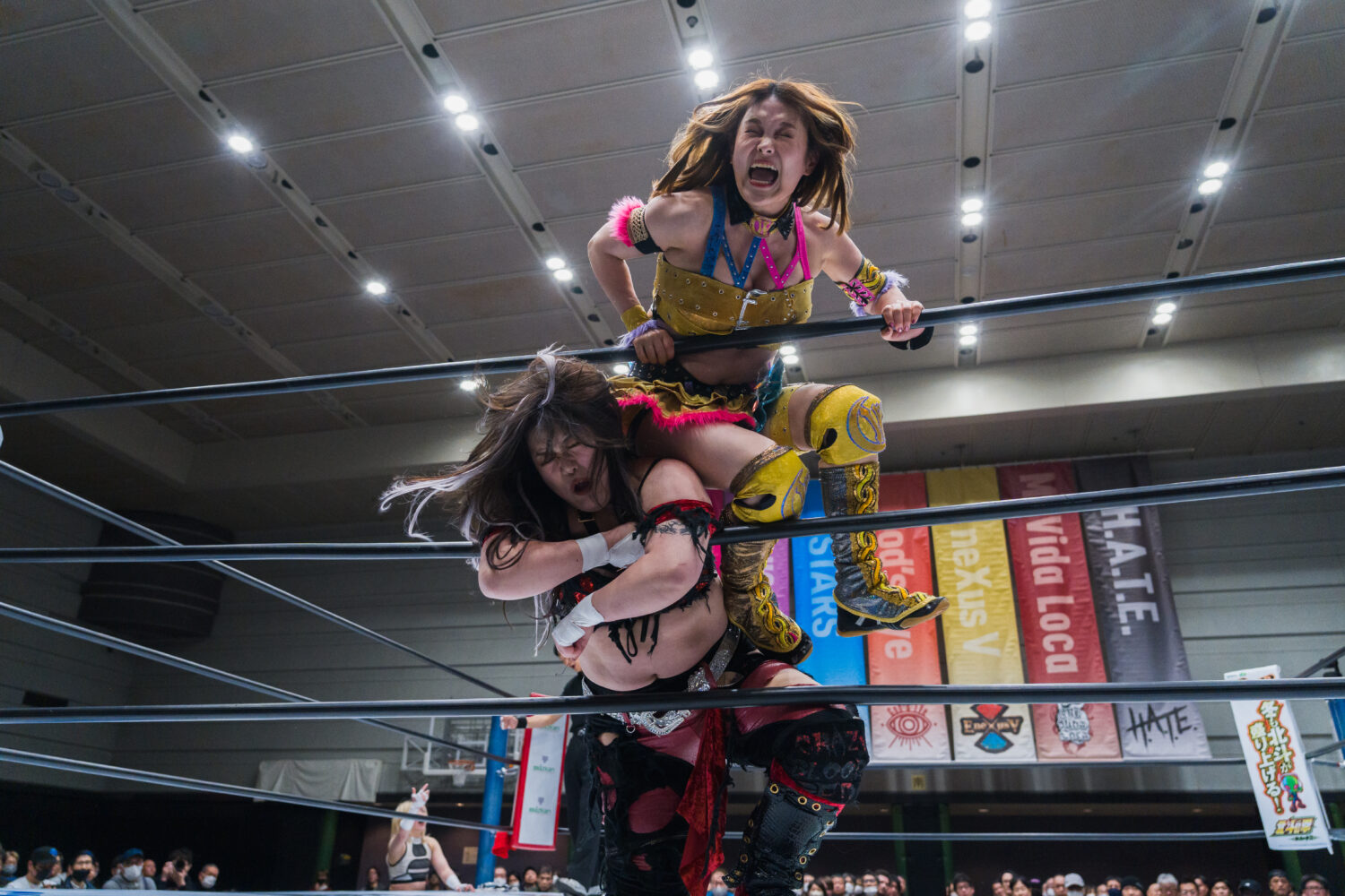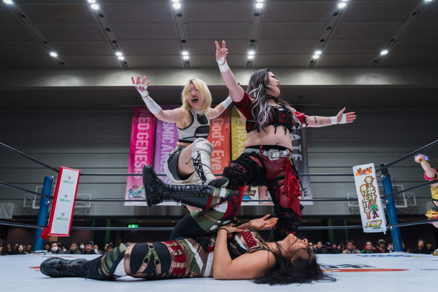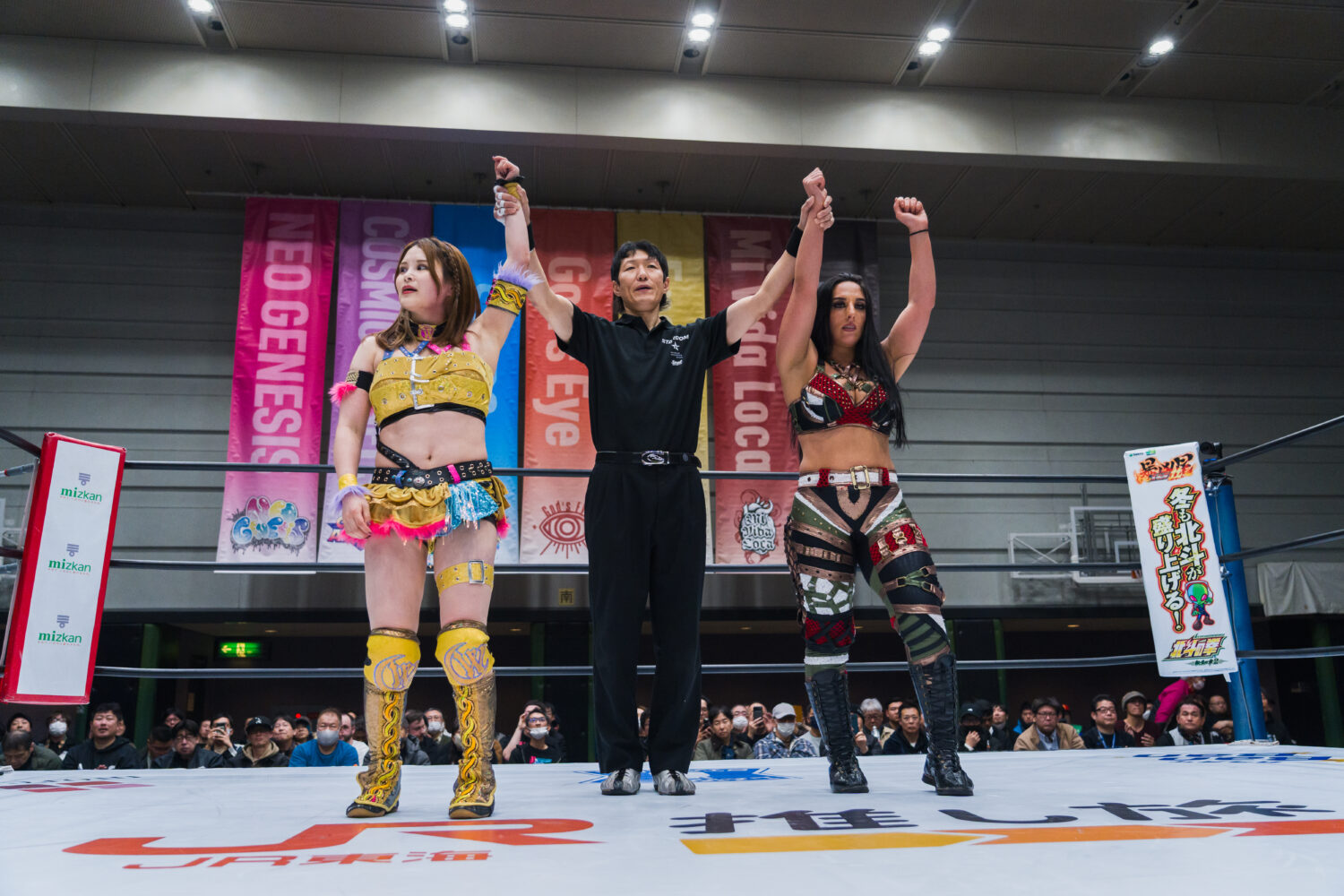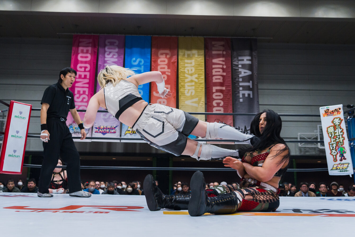 月山とジーナがゴング前に襲いかかる。ダブルで攻撃するが、鈴季がかいくぐりアキラがジーナにドロップキック。鈴季とアキラがジーナを踏みつけてアピール。アキラがジーナへドロップキック連打。ジーナがアキラに丸め込み、スイングしてサイドスラム。月山とジーナがヒップバットの挟み撃ちで競演し、ジーナがランニングギロチン、月山がヒップドロップ。アキラがカウンターで月山にドロップキック、ボディースラム。鈴季が月山に串刺しエルボー、串刺しニーアタック。ジーナが乱入してクローズラインも鈴季が分断し、月山の顔面を踏みつける。月山が突進をかわして鈴季にヒップアタック。鈴季がエルボー、月山もやり返す。エルボーの応酬から鈴季が顔面蹴り、挑発してエルボー連打。月山が怒ってエルボー乱打もカウンターでエルボーを食らう。しかし、月山がカウンターでクロスボディー。アキラがジーナに串刺しエルボー連打、ドロップキック。ジーナが返すと、アキラはフェースロック。ジーナが切り返してブレーンバスター、コーナーに追い込みチョップを放つ。月山とジーナが次々と串刺し攻撃。アキラが返すと、ジーナはファイナルカットへ。しかし、鈴季がカットする。アキラがジーナにエルボー連打。ジーナのチョップでアキラが倒される。鈴季がトラースキックで援護し、ニーの挟み撃ち。アキラがジーナにハーフハッチ。しかし、月山がカットする。鈴季が怒って向かっていくと、月山とジーナが合体して鈴季を場外へ送り出す。アキラを捕まえてジーナがボディースラム、月山と合体ボディープレス。アキラが返すと、ジーナはサンダーストラック。3カウントが入りジーナが勝利。