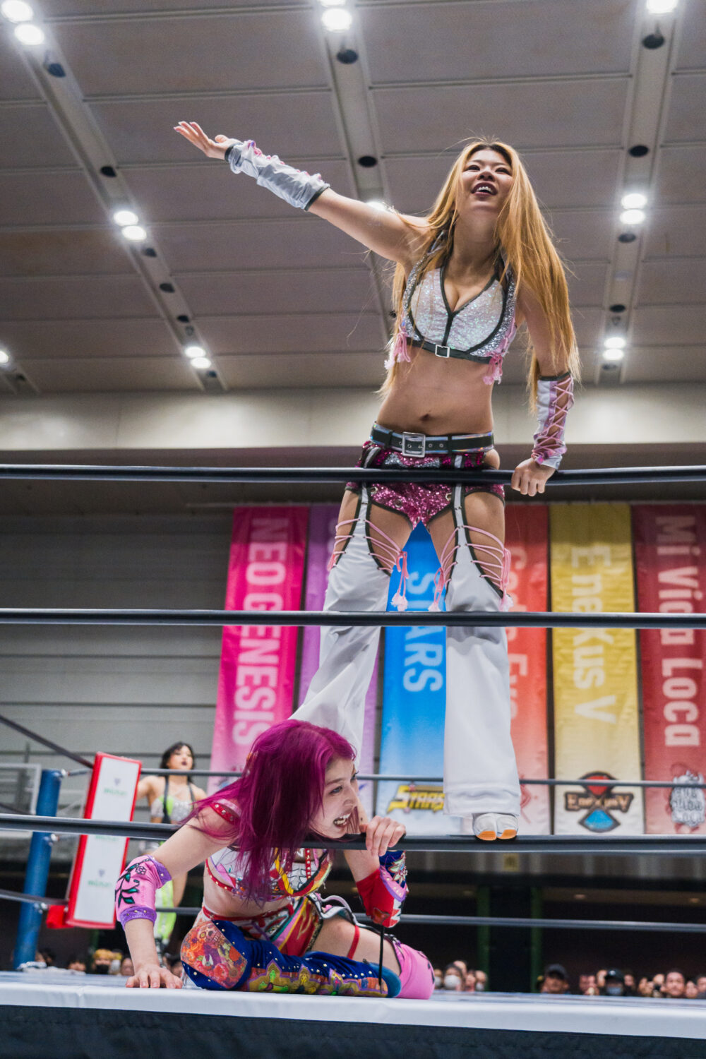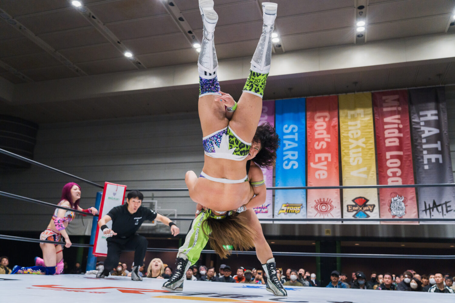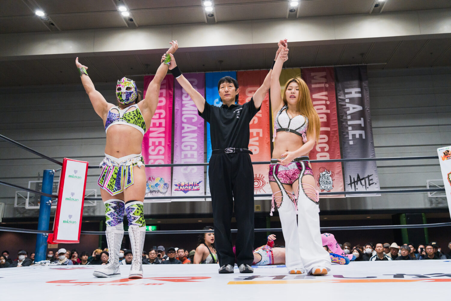 葉月と向後が先発でゴング。腕の取り合いから向後がヘッドロック。葉月がかわしてドロップキック。オリンピアが向後を担ぎスクワット3回、前方に叩きつける。葉月が向後にボディースラム3連発、セントーン、顔面ウォッシュ。しのいだ向後はカウンターでドロップキック。飯田と葉月がエルボーの応酬。飯田が二段蹴りをかわして逆水平。葉月は飯田にブレーンバスター。飯田もブレーンバスターのお返し。葉月がラリアットをかわして二段蹴り。オリンピアが飯田にショルダータックル。飯田がこらえてショルダーをぶつけ合う。オリンピアが打ち勝つが、飯田がボディースラムでやり返す。オリンピアが向後を持ち上げ前方に叩きつける。向後はコルバタから619を決めるが2カウント。向後のスープレックス狙いをオリンピアがこらえる。向後をリフトアップし旋回式バックフリップ。向後が返すと、オリンピアにアームブリーカー、スワンダイブ式ミサイルキック。オリンピアが返すと、向後が桃絞り100%。しかし葉月のカットが間に合う。向後と飯田が合体し、ダブルのフェースバスター。向後が旋回式ダイビングボディープレス、バックドロップホールド狙い。葉月がコードブレイカーでカットし、オリンピアが肩車。ジャーマンに移行するが、飯田のカットが間に合う。オリンピアは向後を担ぐが丸め込まれる。マヒストラルをオリンピアが返し、向後にラリアット。向後が返すと、オリンピアは串刺しラリアット、リフトアップしてから旋回式サイドスラム。向後が返せず3カウントが入った。