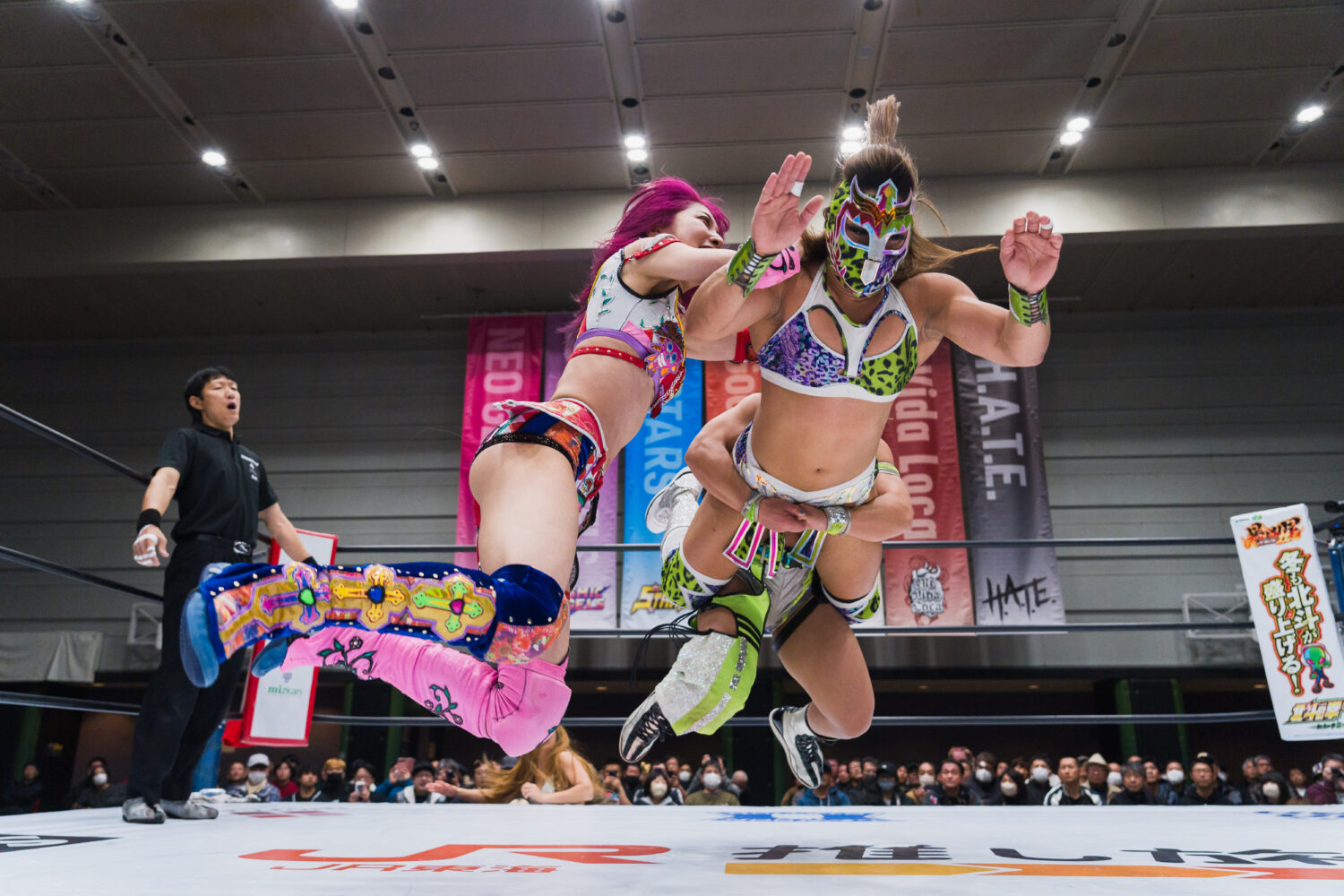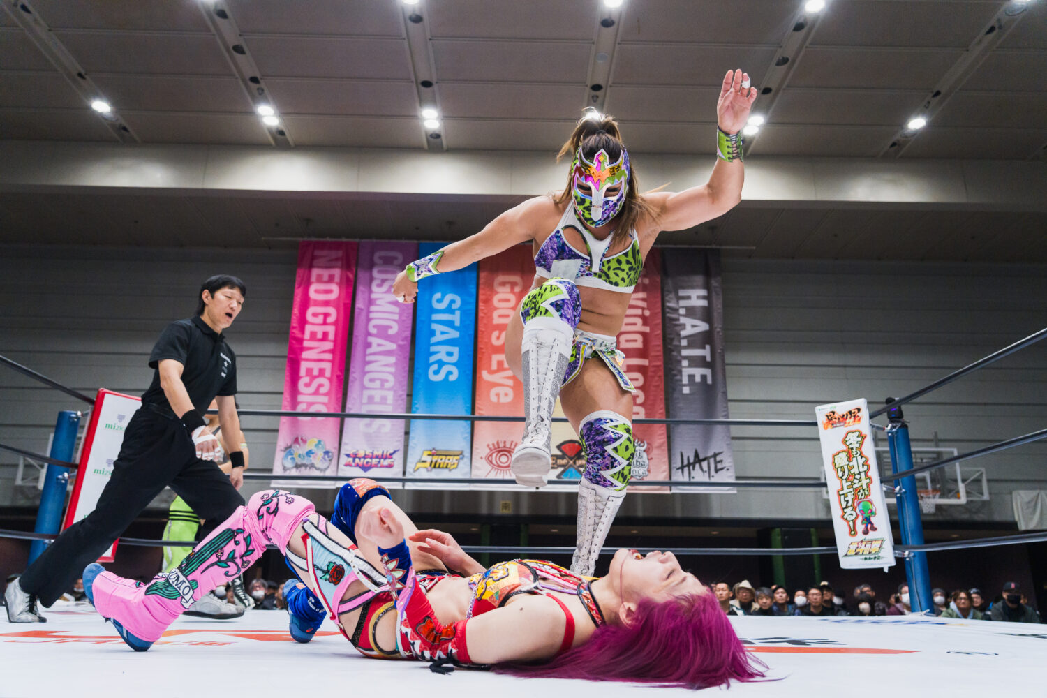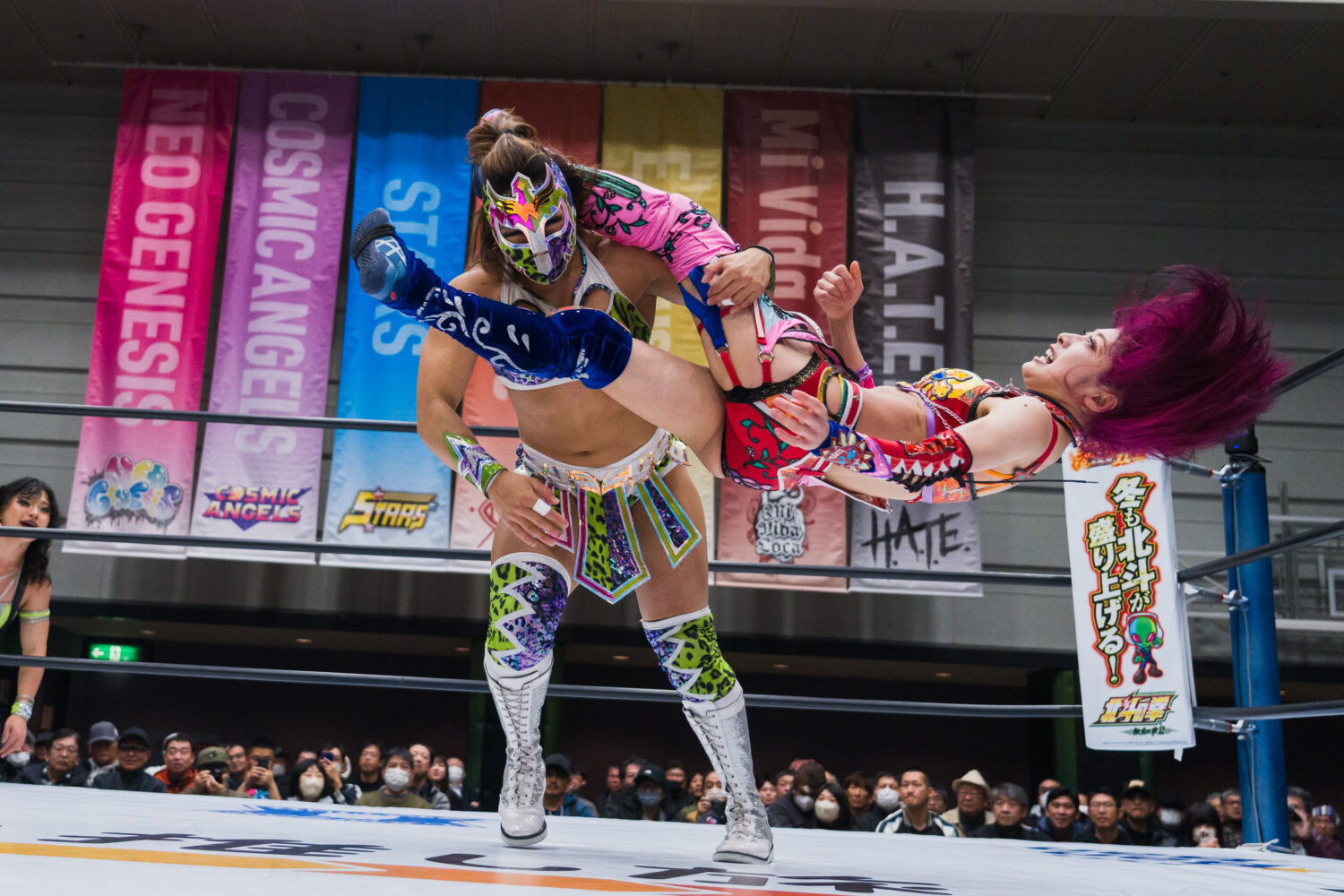 葉月と向後が先発でゴング。腕の取り合いから向後がヘッドロック。葉月がかわしてドロップキック。オリンピアが向後を担ぎスクワット3回、前方に叩きつける。葉月が向後にボディースラム3連発、セントーン、顔面ウォッシュ。しのいだ向後はカウンターでドロップキック。飯田と葉月がエルボーの応酬。飯田が二段蹴りをかわして逆水平。葉月は飯田にブレーンバスター。飯田もブレーンバスターのお返し。葉月がラリアットをかわして二段蹴り。オリンピアが飯田にショルダータックル。飯田がこらえてショルダーをぶつけ合う。オリンピアが打ち勝つが、飯田がボディースラムでやり返す。オリンピアが向後を持ち上げ前方に叩きつける。向後はコルバタから619を決めるが2カウント。向後のスープレックス狙いをオリンピアがこらえる。向後をリフトアップし旋回式バックフリップ。向後が返すと、オリンピアにアームブリーカー、スワンダイブ式ミサイルキック。オリンピアが返すと、向後が桃絞り100%。しかし葉月のカットが間に合う。向後と飯田が合体し、ダブルのフェースバスター。向後が旋回式ダイビングボディープレス、バックドロップホールド狙い。葉月がコードブレイカーでカットし、オリンピアが肩車。ジャーマンに移行するが、飯田のカットが間に合う。オリンピアは向後を担ぐが丸め込まれる。マヒストラルをオリンピアが返し、向後にラリアット。向後が返すと、オリンピアは串刺しラリアット、リフトアップしてから旋回式サイドスラム。向後が返せず3カウントが入った。