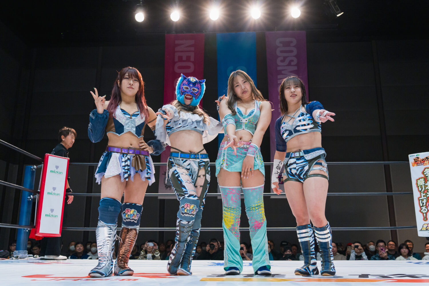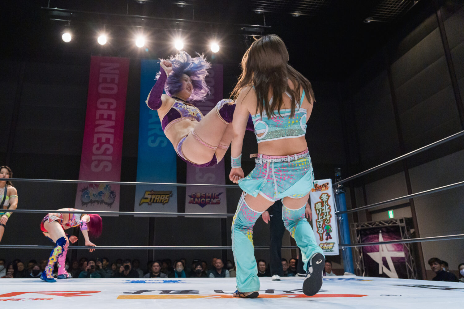 向後が先発に立候補し、星来に向かっていく。ロープワークの攻防を展開し向後はヘッドシザーズホイップ。ドロップキックを星来がかわし、ドロップキック。かわした向後がカバーも、すぐに星来が返してドロップキックが交錯する。ゆりあが天咲にドロップキック。天咲がゆりあをかわし、ネオジェネでドロップキックの競演。キッドが、ゆりあにその場跳びムーンサルト。ゆりあが返すと、キッドはロープに固定して背中へドロップキックを打ち込む。AZMがゆりあへサッカーボールキック連発、エルボー連発に「きいてねえぞ、こいよ!」と挑発して受けて立つ。AZMがエルボーでゆりあを倒すが、カウンターでドロップキックを食らう。飯田がAZMにショルダータックル、逆水平の連打を浴びせる。そこへ天咲がカットに入る。飯田は串刺し攻撃をかわし、ビーとショルダータックル、エルボードロップで合体。AZMが返すと、飯田はブレーンバスターを狙う。AZMがこらえて打撃のかわし合い。AZMは飯田にブレーンバスターを決める。飯田もブレーンバスターですぐにお返し。ビーがキッドのボディーアタックをキャッチしてフォールアウェースラム。キッドはビーへドロップキック。ビーとキッドがエルボーの応酬。「負けるか!」とキッドが連打。ビーは一発で吹っ飛ばし、チョークスラムで叩きつける。AZMがビーへミサイルキック、飯田がラリアットでネオジェネを分断。ゆりあがキッドにビッグブーツ連発。キッドがつかんでヒザへのドロップキック。しかし、ゆりあがビッグブーツからギロチンドロップ、首4の字固め。STARSを呼び込み、キッドに合体フェースクラッシャー狙い。しかし、ネオジェネがカットして合体、ゆりあに次々と串刺し攻撃を決めていく。さらに4方向からドロップキックの競演。キッドがゆりあにダイビングボディーアタック。ゆりあが返すと、キッドはフィニッシュを予告しバックを取る。向後がカットして、STARSがキッドへ合体フェースクラッシャーを決める。10分経過。キッドが返すと、ゆりあは首4の字固め、反転して額をマットに叩きつけていく。さらに腕も取って締め上げるが、ネオジェネがカットに入る。ゆりあがランニングギロチンも、キッドが返す。ゆりあは「決めるぞ!」と絶叫しファイナルカットの構え。しかしカットされ、キッドがストレッチマフラーの体勢。ビーがカットしてキッドとAZMを鉢合わせ、しかし、天咲が飯田とビーにまとめてDDT。AZMが場外にプランチャで飛ぶと、キッドがネオジェネを呼び込み、ゆりあをマットに叩きつける。キッドはフィニッシュを宣言してムーンサルトプレス。3カウントが入り、キッドがゆりあをピンフォールした。