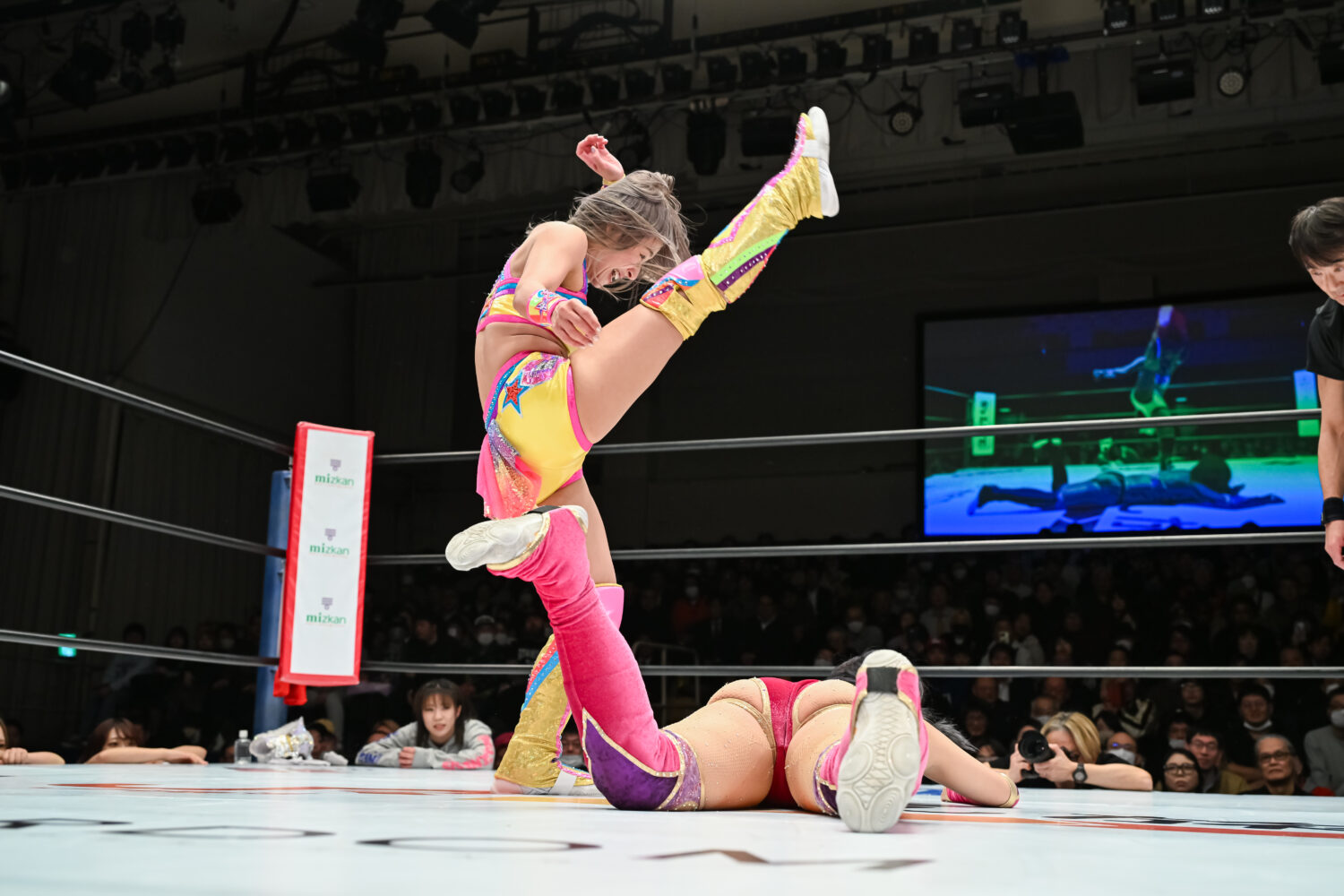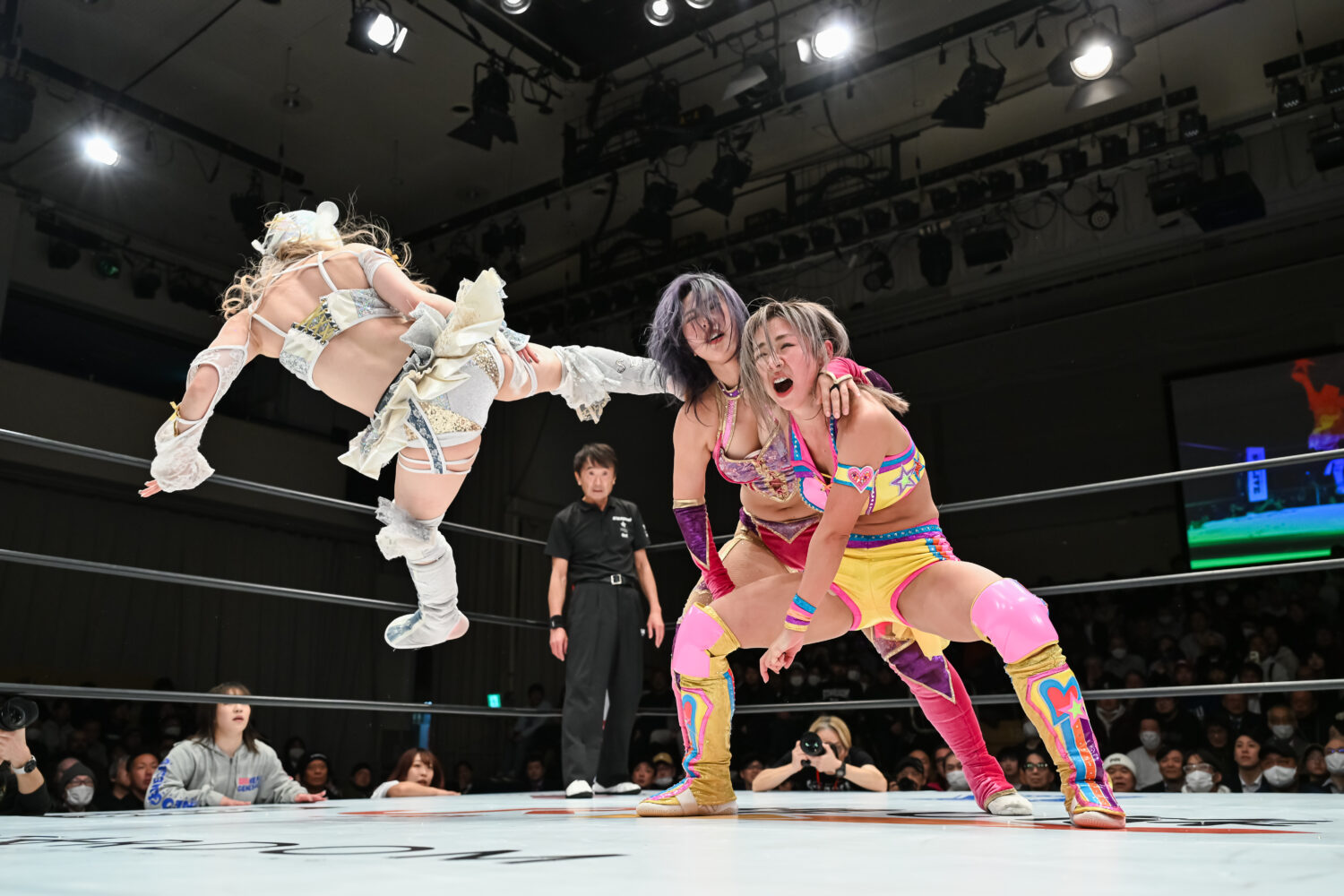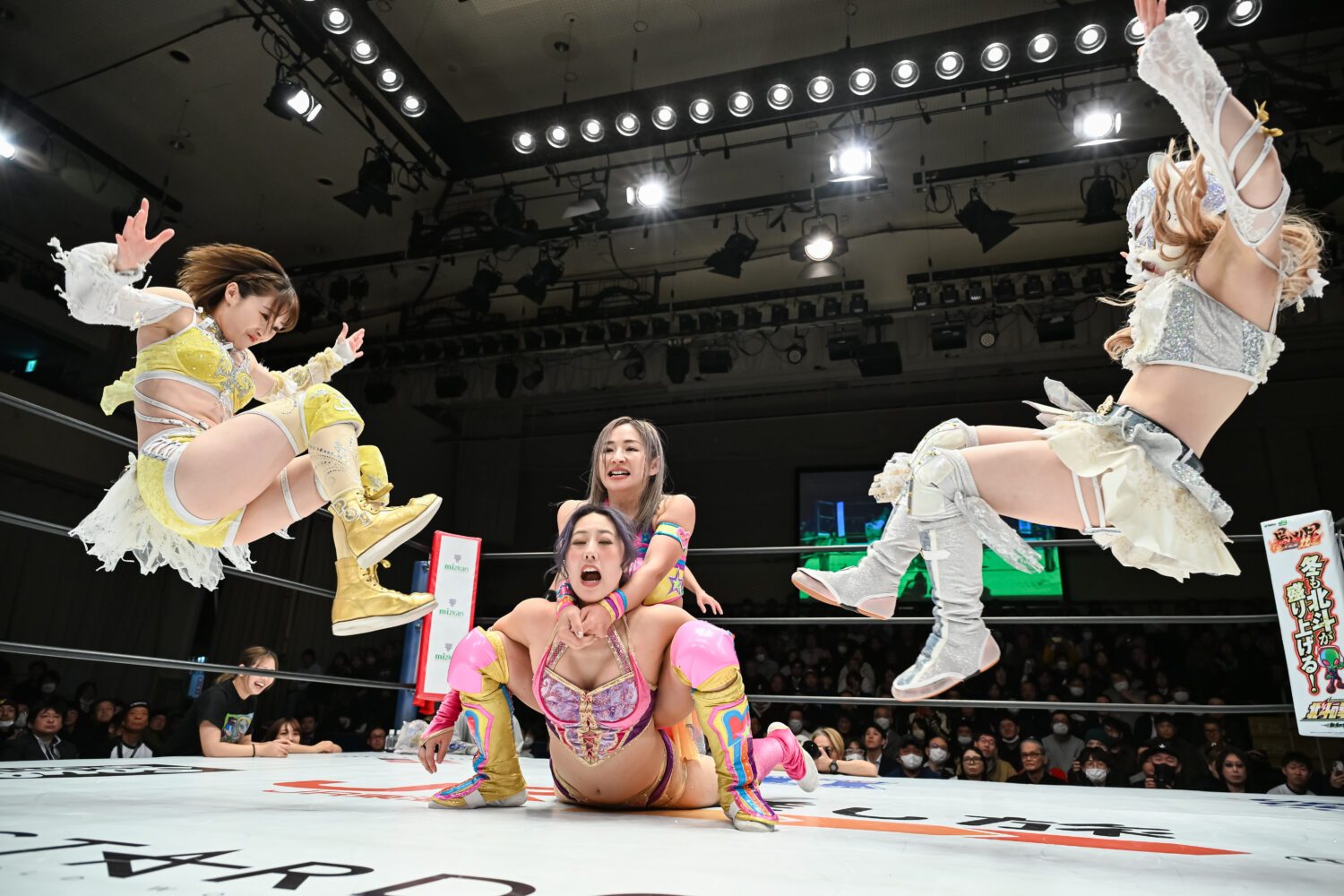 全員が握手をかわして、ゆりあが先発に立候補、愛川と向かい合う。ゆりあがタックルでグラウンドへ。愛川が腕を取って捻り上げると、ゆりあもやり返す。腕の取り合いから愛川が蹴り上げ、カカト落としから腕固め。愛川がミドルキック連打も、ゆりあは1カウントで返す。キッド、なつぽい、愛川が串刺し攻撃の連続。愛川はパイパイアタックを予告して決める。3人でポーズを決めると、さくらと玖麗がカットしてポーズを決める。キッドがゆりあの左腕を捻り上げてドロップキック。ゆりあがエルボー連打、キッドが受けて立ち、ボディースラム狙い。ゆりあがかわしてドロップキック。さくらがキッドにミドルキック、愛川にローの連打。愛川もやり返す。キッドがカットし、愛川と合体を狙う。さくらと玖麗がドロップキックの競演、キッドへさくらが串刺しで回し蹴り。キッドが返してボディーアタック、ドロップキック、その場跳びムーンサルトプレス。なつぽいがさくらへダイビングボディーアタック、ワキ固め。さくらとなつぽいが蹴りをかわし合う。さくらの蹴りがヒットし、玖麗が串刺しドロップキック、スリーパー。なつぽいがエスケープすると、玖麗はネックブリーカー。玖麗の突進をなつぽいとキッドが止めて、ドロップキックの競演。なつぽいが玖麗にドロップキック。フェアリアルギフトは玖麗がかわしてバイオレットシューティング。なつぽいがトラースキック。愛川とゆりあが蹴りのかわし合い。愛川がロー、ゆりあがカウンターでドロップキック、ギロチンドロップ、首4の字固め。愛川がかわして回し蹴り、フィッシャーマン。ゆりあが返すと、愛川が突進、さくらと玖麗がカットして串刺し攻撃。ゆりあが二段蹴りも、愛川が返す。10分経過。愛川が回し蹴りも、カットされる。愛川はゆりあを引き起こし、エルボーを打ち合う。ゆりあがエルボー連打、大きく振りかぶって張り手を打ち込む。愛川がローキックの連打、回し蹴りの連打、カカト落としの連発。ゆりあが肩を上げて3カウントを回避。愛川がタイガーの構え。ゆりあがかわすと玖麗がスピア、ゆりあがギロチン。しかし、キッドがカット成功。ゆりあが首4の字固めから反転して額をマットに叩きつけていく。戻して締め上げ、脚も取る。しかし、なつぽいがカット。キッドとなつぽいが場外へプランチャで飛ぶ。ゆりあがバックを取るとキッドがカット、なつぽいがジャーマン。愛川組が合体カカト落とし、愛川がシャイニングウイザード。しかし、さくらと玖麗のカットが間に合う。15分経過。愛川がタイガースープレックスを決めると3カウントが入った。