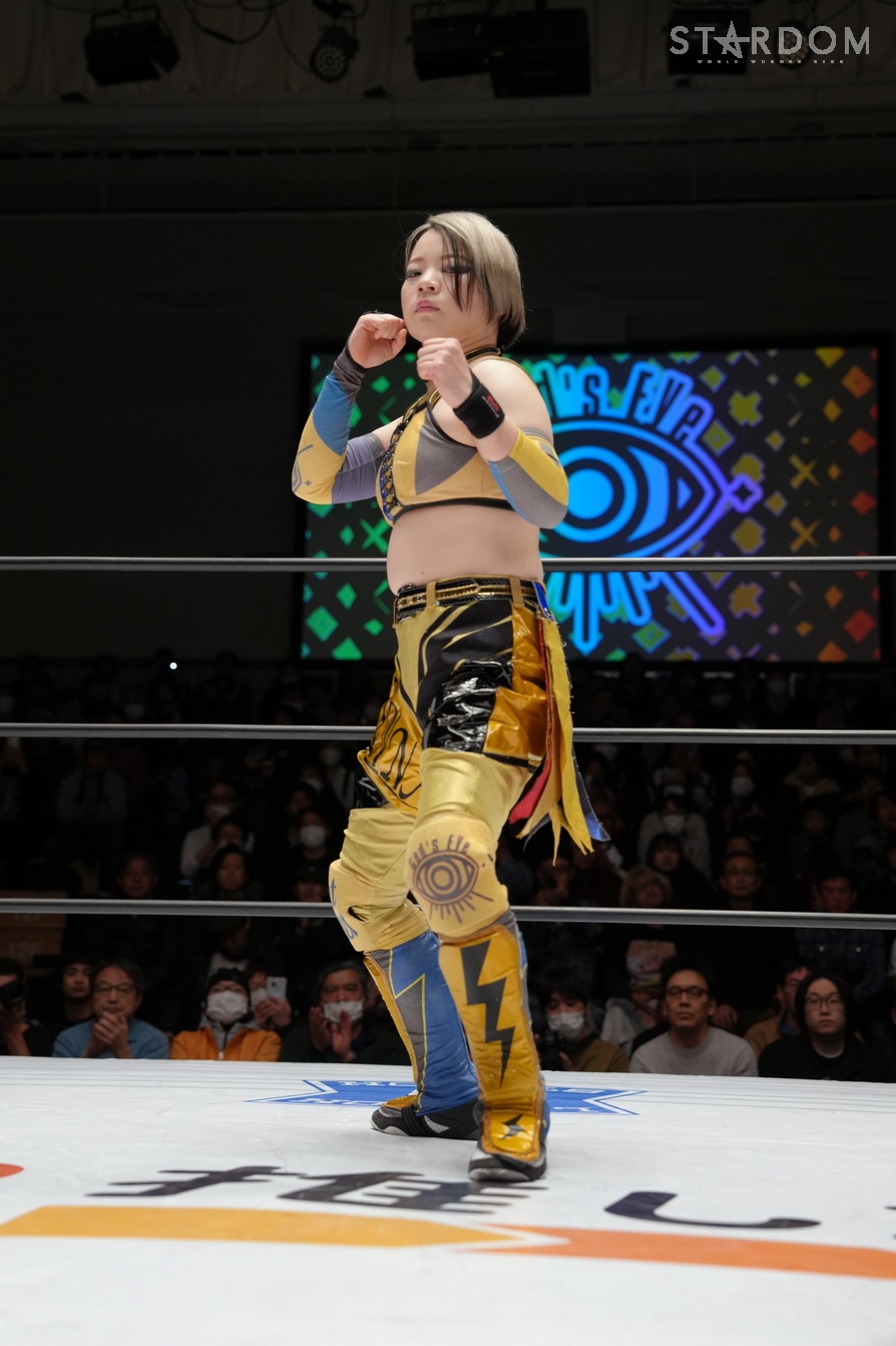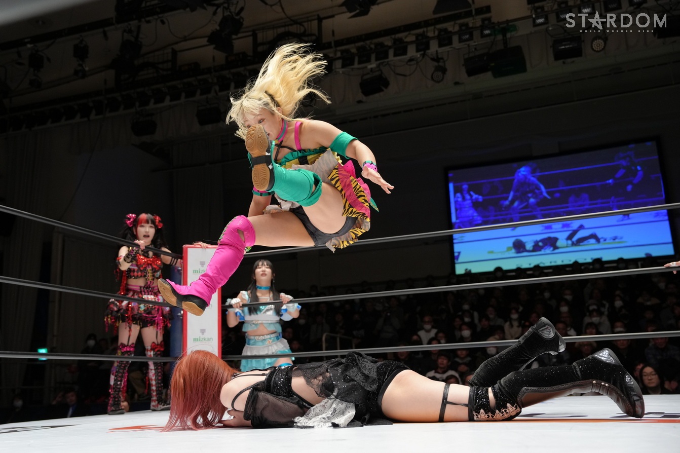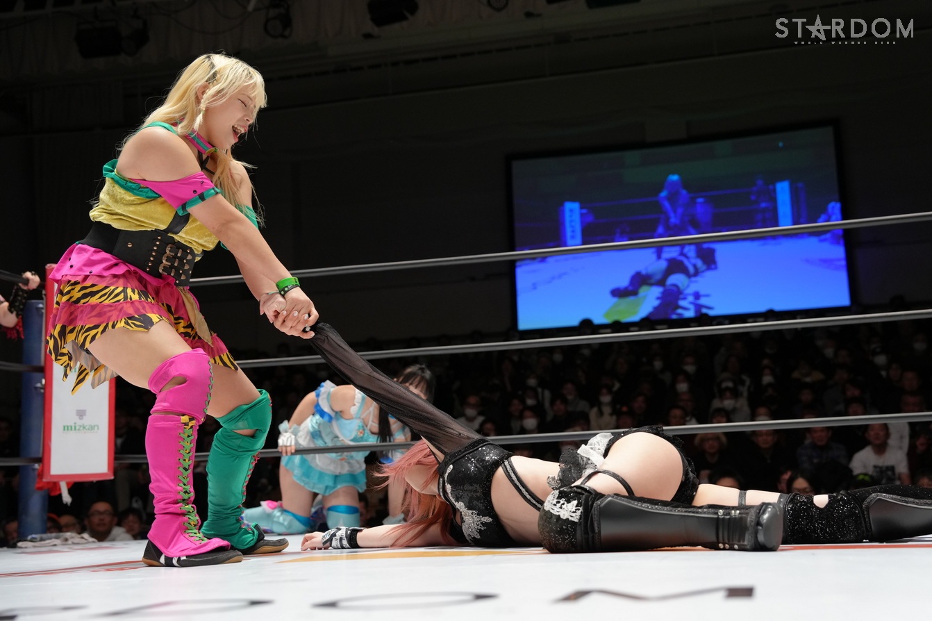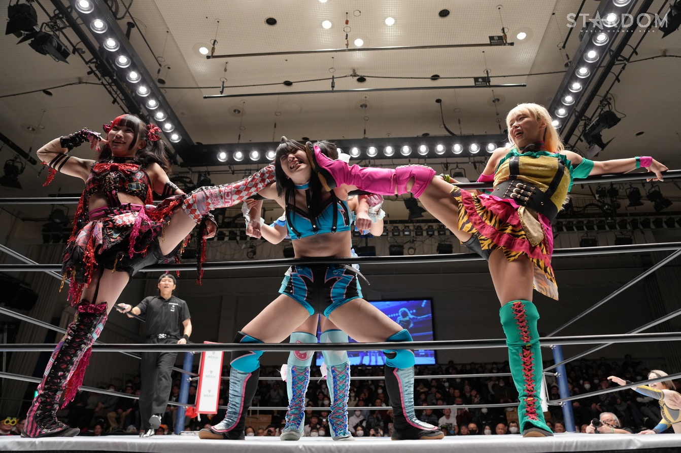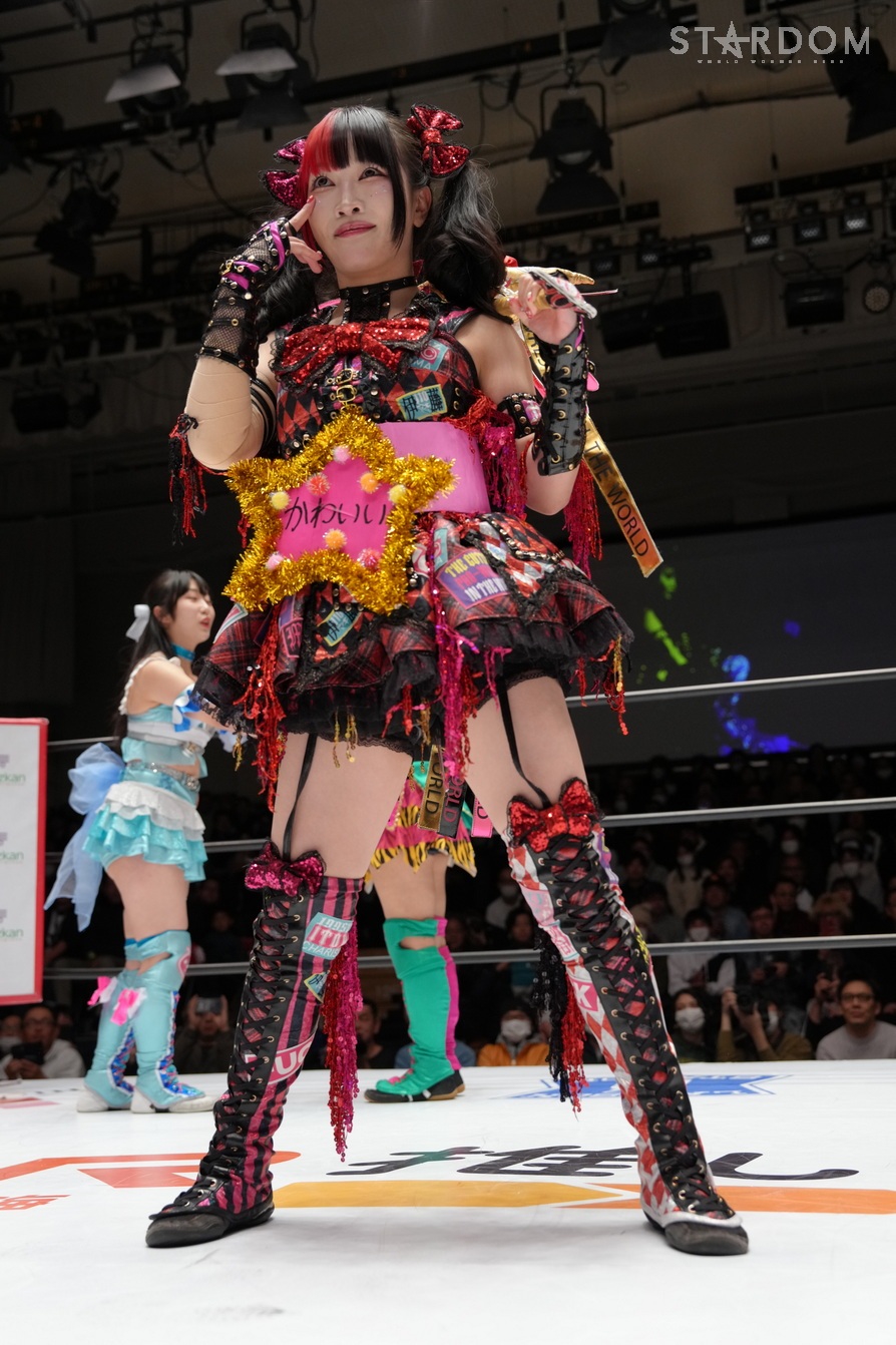 鹿島がさくらをハグし、八神とも握手をかわす。伊藤の入場曲に合わせて水森がリング上でダンス、玖麗は困惑。伊藤は壊れそうな手作りベルトを下げてさくらと向き合う。水森は「プロレスにかわいいなんて関係ないんだよ! 全然動かないヤツ出てこい!」と鹿島を指名? 鹿島が嫌々出てきて、そのままゴング。水森は「ちゃんと動けよ」と釘をさす。鹿島は「オマエら見とけよ、動くから!」と宣言、水森がロープに振るが、鹿島は勝手にジョギングっぽい動きから水森をロープに何度も振り、自ら倒れ込む。水森が手を引くが、鹿島がサッと丸め込む。水森は「ふざけんな」とギロチン連発。さくらが水森にドロップキック、水森がドロップキックでお返し。玖麗がさくらへドロップキック、キャメルクラッチ、ロープに固定して水森と伊藤も加勢する。玖麗はさくらをカバー。伊藤がさくらへ串刺しエルボー、「お待たせしました!」と世界一可愛いナックルを宣言。そこへ玖麗が妨害して、「お待たせしました」とコーナーに上がり、戸惑いながら「一番…」。水森に促され下りると、水森が「トロピカル一かわ…」。伊藤が落として、さくらに「ぶっ殺す」と宣言、しかしさくらがDDT、串刺しで回し蹴り。伊藤が返すと、さくらがエルボー連打。伊藤もやり返してエルボーの応酬。伊藤が頭を突き出して阻止。さくらがカウンターでミドルキック、伊藤がDDT。玖麗と八神がドロップキックをかわし合い、エルボーの応酬に。八神がミドルキック連打、玖麗がエルボーアタック。八神が返すと、玖麗は串刺しドロップキックから、もう一発ドロップキック。八神をかいくぐり玖麗がバックを取り、水森のアシストを得て玖麗はミサイルキックを決める。玖麗は八神にスピアにいくがかわされて、さくらと鹿島が攻撃、八神が串刺しハイキックからニーアタック。玖麗が返すと、八神は腕十字。八神はフィニッシュを宣言して